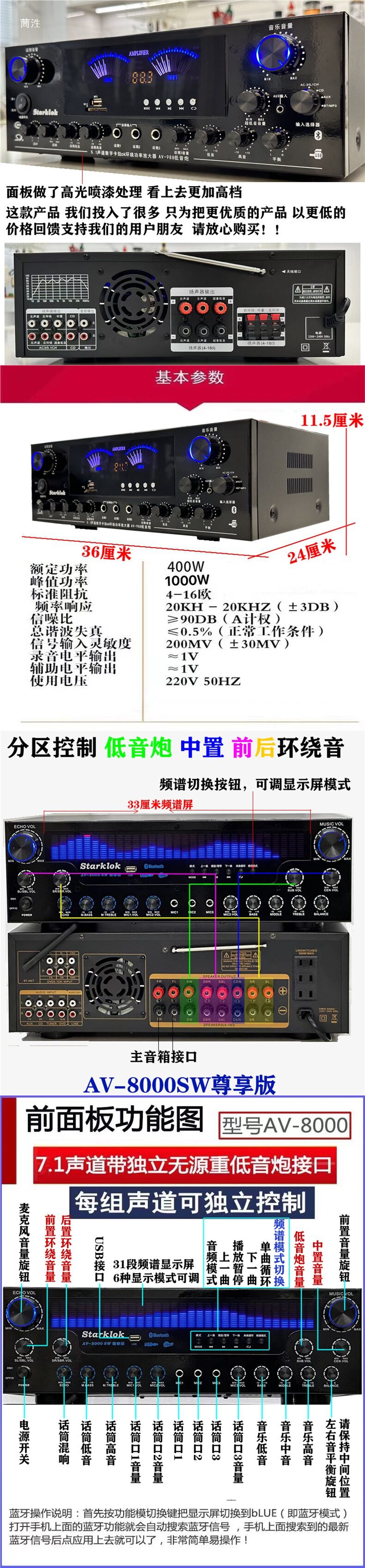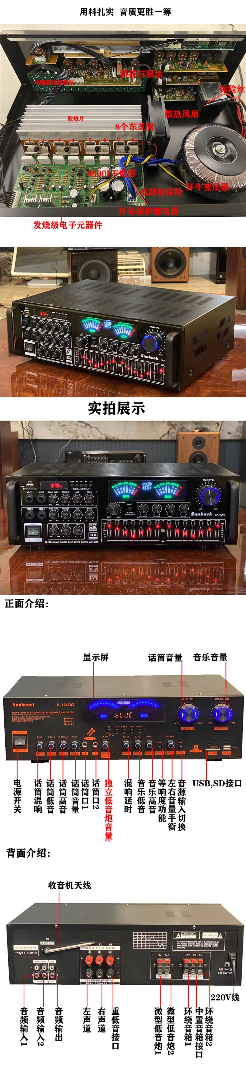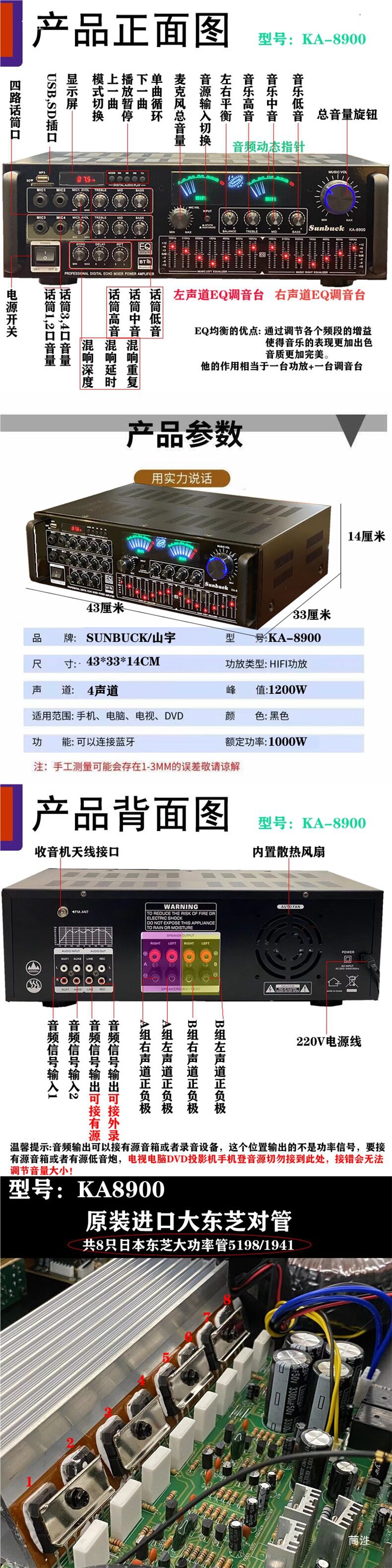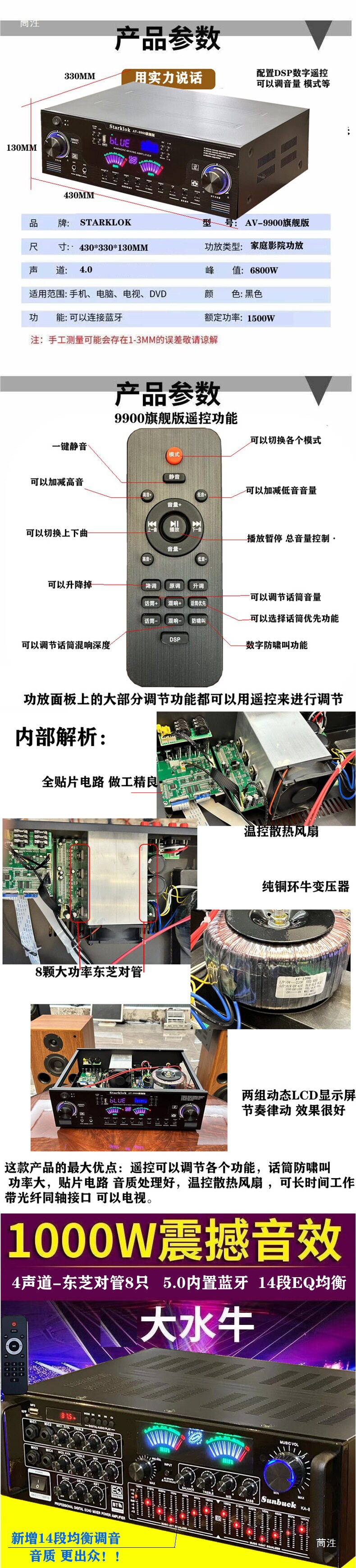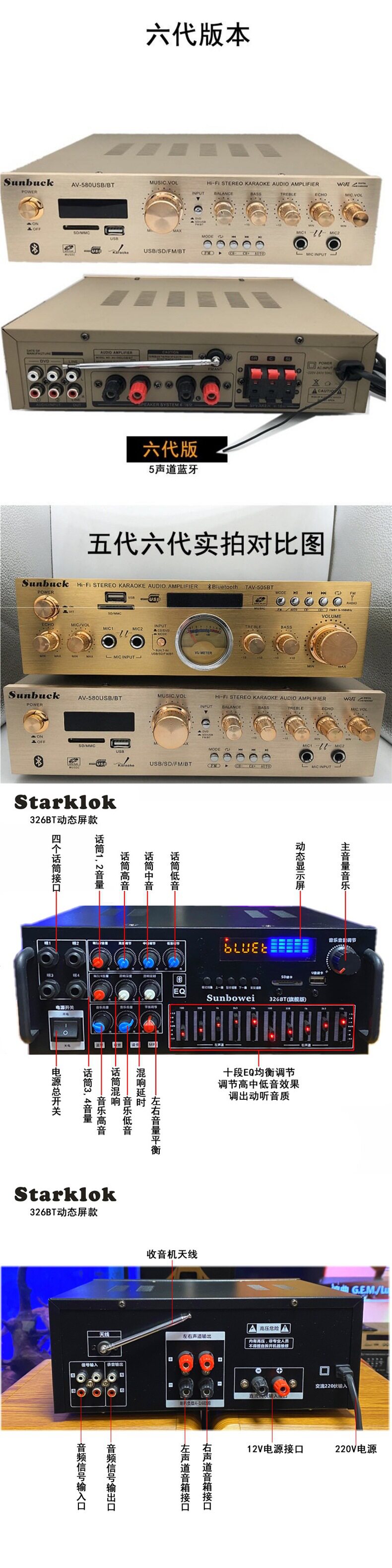 | Color | 338bt upgraded version-500w gold,338bt upgraded version-500w black,988bt-8 tube 5.1 independent subwoofer interface,9898-5.1 independent bass,555bt-5.1 exclusive edition spectrum screen,339bt-300w power amplifier (with bluetooth),326bt-300w power amplifier (with bluetooth),6188bt-500w power amplifier (with bluetooth),6188e-five-channel 600w new model,338bt-300w power amplifier (with bluetooth),338 simplified version-300w power amplifier (without bluetooth),Fourth generation 500bt-300w power amplifier with bluetooth,Jinliudai 580-400w power amplifier (with bluetooth),Jinqidai 298-600w power amplifier (with bluetooth),Black seventh generation 298-600w power amplifier (with bluetooth),326bt machine-600w with bluetooth,326z exclusive edition-800w dynamic display,Ninth generation 628bt-900w with bluetooth,Tenth generation 6060-1000w,Gold 11th generation 6199e-1000w dynamic screen,Black 11th generation 6199e-1000w dynamic screen,Ka8900-1000w14-band eq tuning,999 version of fever cow |