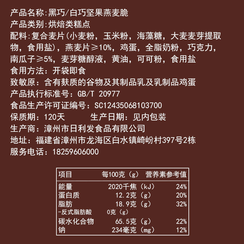 | Packaging specifications | [black nut oatmeal crisp] 100g*1 box (9 packs shipped),[black nut oatmeal crisp] 100g*2 boxes (18 packs shipped),[black nut oatmeal crisp] 100g*4 boxes (36 packs shipped),[baiqiao nut oatmeal crisp] 100g*1 box (9 packs shipped),[baiqiao nut oatmeal crisp] 100g*2 boxes (18 packs shipped),[baiqiao nut oatmeal crisp] 100g*4 boxes (36 packs shipped),[mixed flavors] 100g*2 boxes (18 packs shipped),[mixed flavors] 100g*4 boxes (36 packs shipped) |