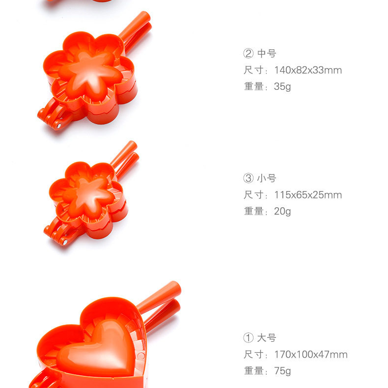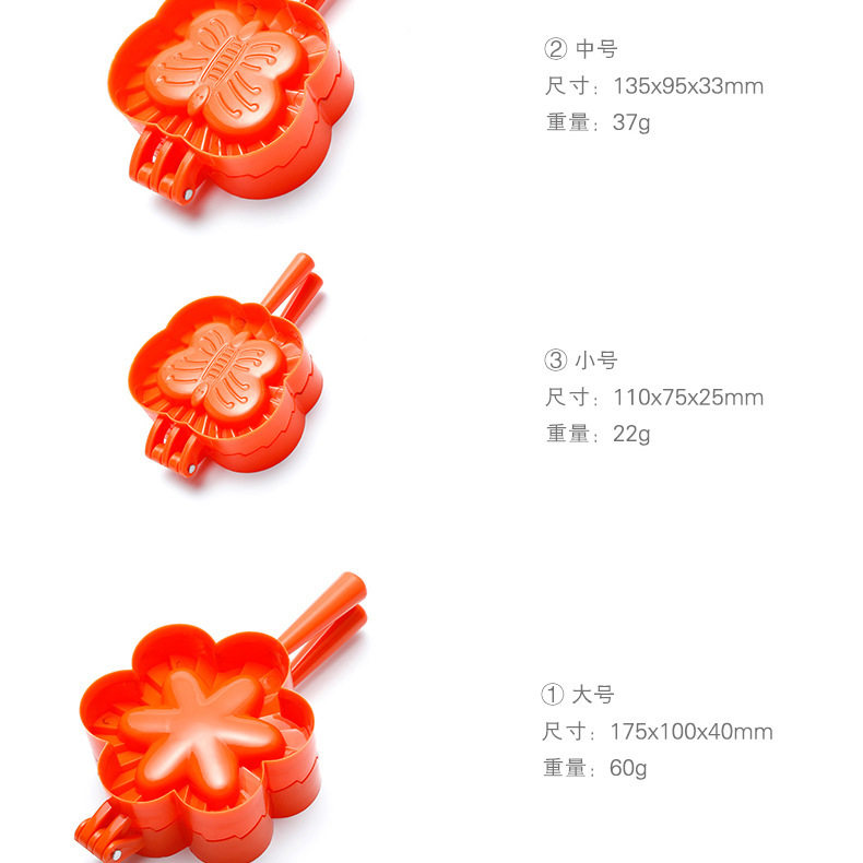 Specifications Thickened-butterfly-shaped large dumpling mold,Thickened-butterfly-shaped medium dumpling mold,Thickened-heart-shaped large dumpling mold,Thickened-heart-shaped medium dumpling mold,Thickened - heart-shaped small dumpling mold,Thickened - flower-shaped large dumpling mold,Thickened - flower-shaped medium dumpling mold,Thickened - flower-shaped small dumpling mold,Thickened-conventional semicircular large dumpling mold,Thickened-regular semicircle medium dumpling mold,Thickened-regular semicircle small dumpling mold,Thickened-regular semicircle extra large dumpling mold,Thickened-butterfly-shaped small dumpling mold