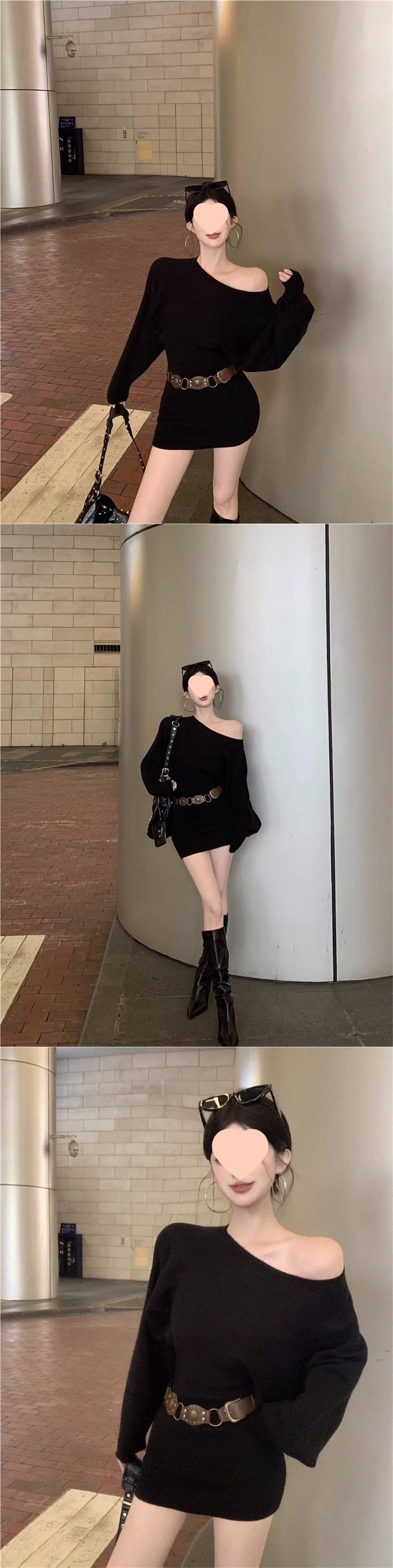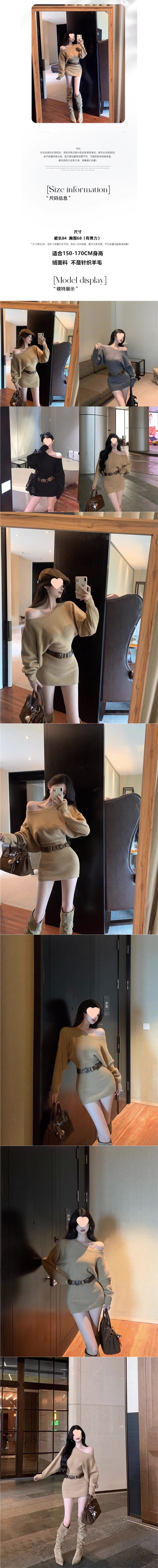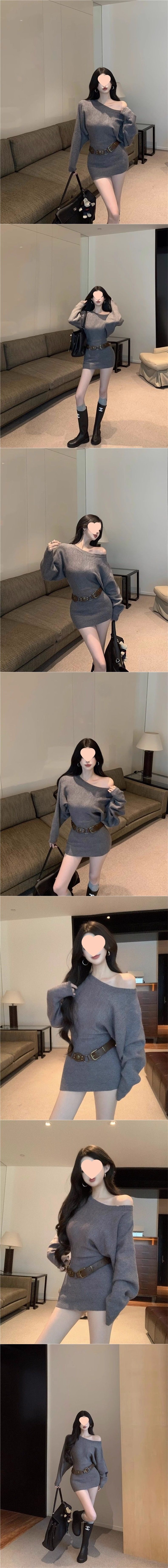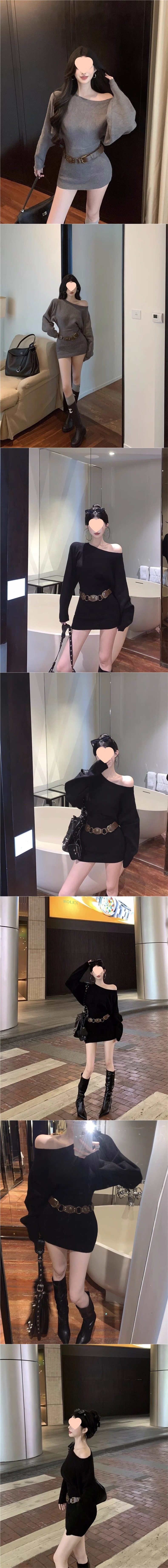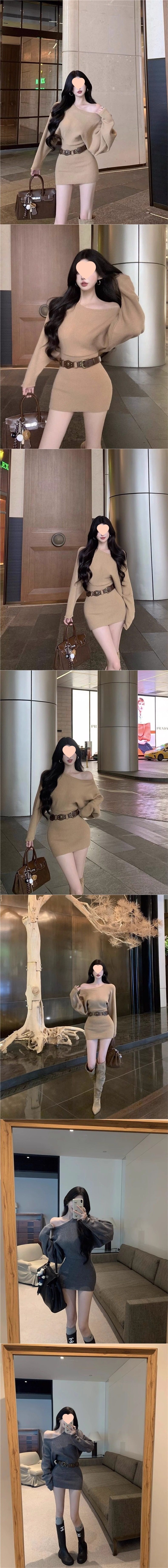 Pure Desire Hot Girl Belted Hip Skirt Two-Piece Sexy Slanted Shoulder Spring and Winter Long Sleeve Tight Slimming Bottoming Dress Short Skirt