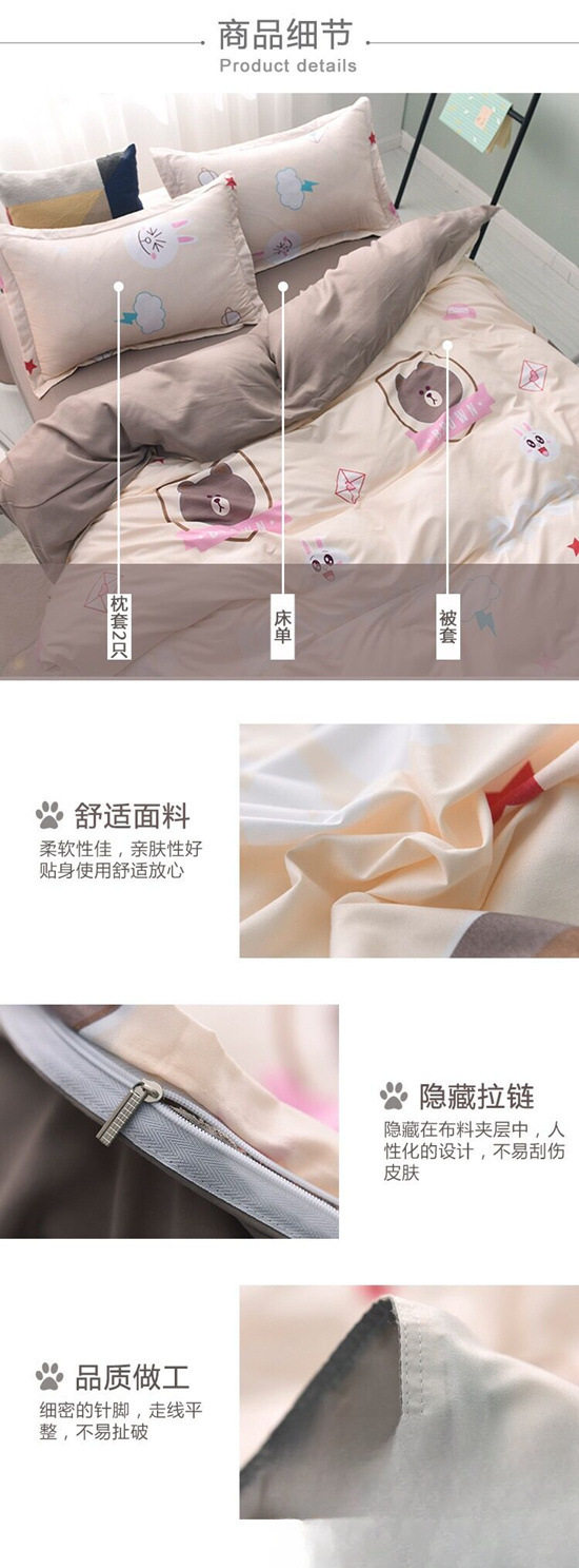 | Size specifications | 150*200cm single quilt cover,180*220cm single quilt cover,200*230cm single quilt cover,1.5m piece set (dormitory style),1.9m piece set (quilt cover 150x200),2.2m piece set (quilt cover 180x220),2.4m piece set (quilt cover 200x230),2.6m piece set (quilt cover 220x240) |