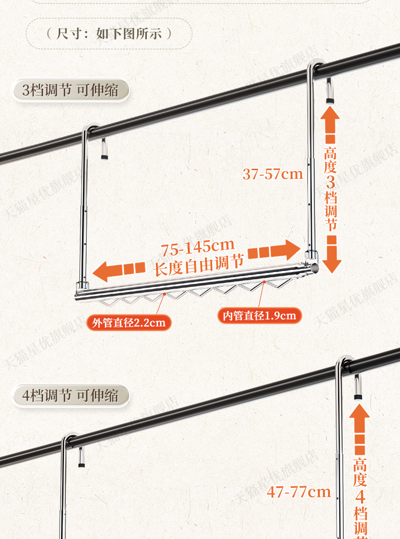 | Quantity of package | Upgraded windproof hook [three-speed lifting] 75-145cm retractable upgraded windproof hook [four-speed lifting] 100-191cm retractable |