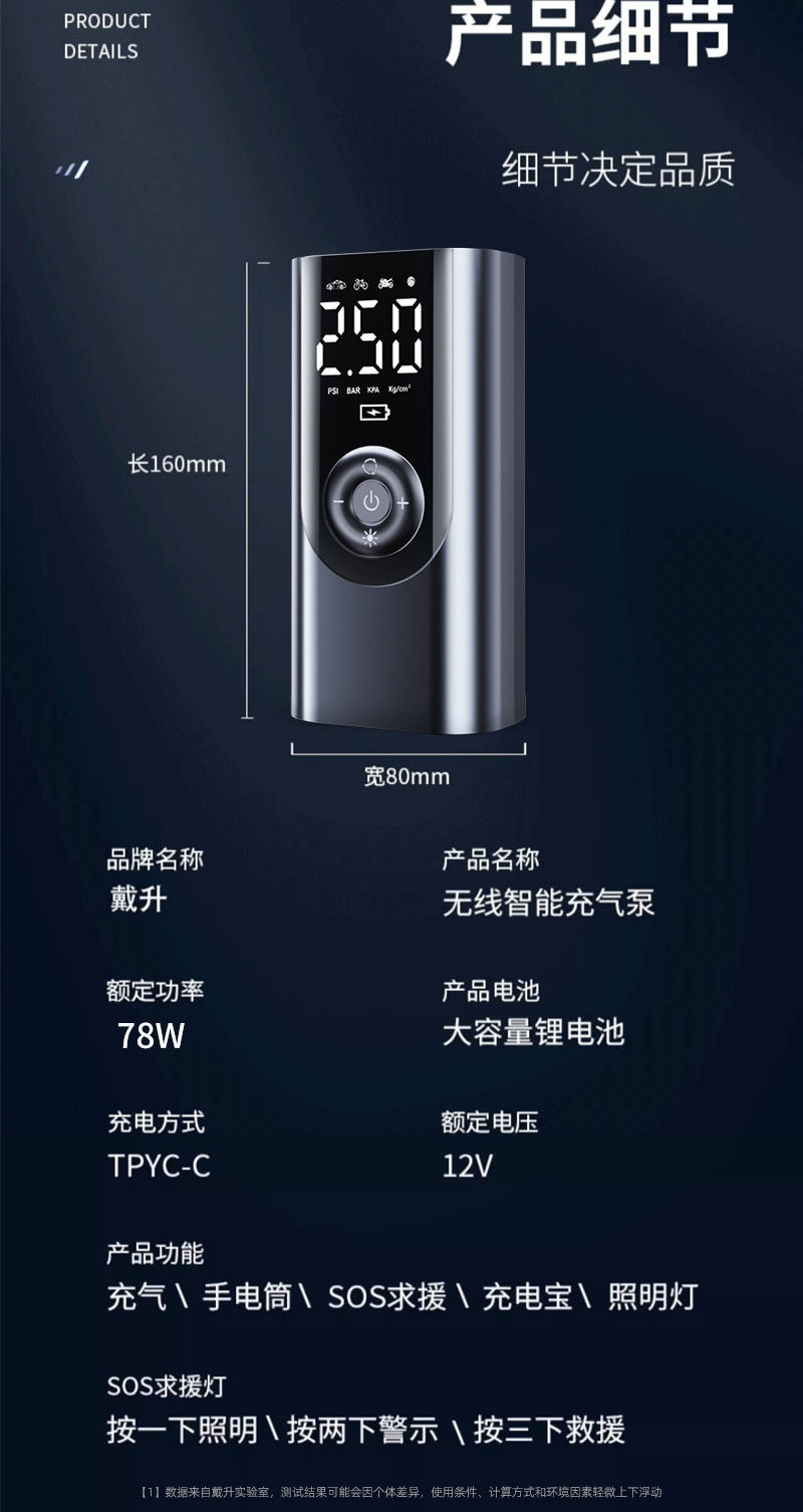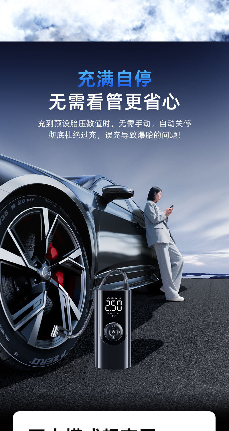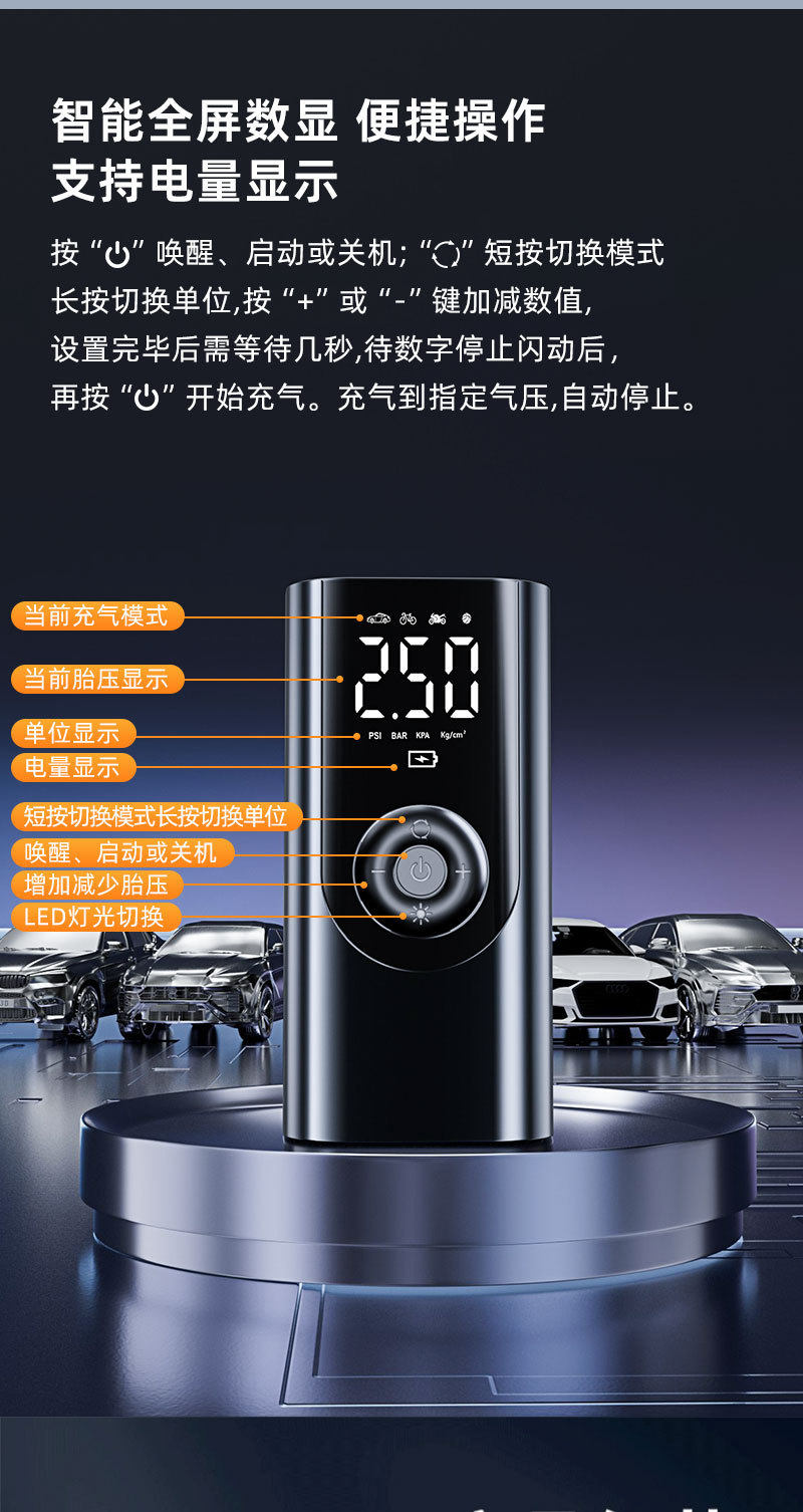 | Additional features | Lighting,Tire pressure gauge,Explosion proof,Warning light,Usb charging,Over heat protection,Anti-slip base,Automatic shutdown,Automatic charging stop,Air pressure alarm,Intelligent pressure monitoring,Tire pressure memory |