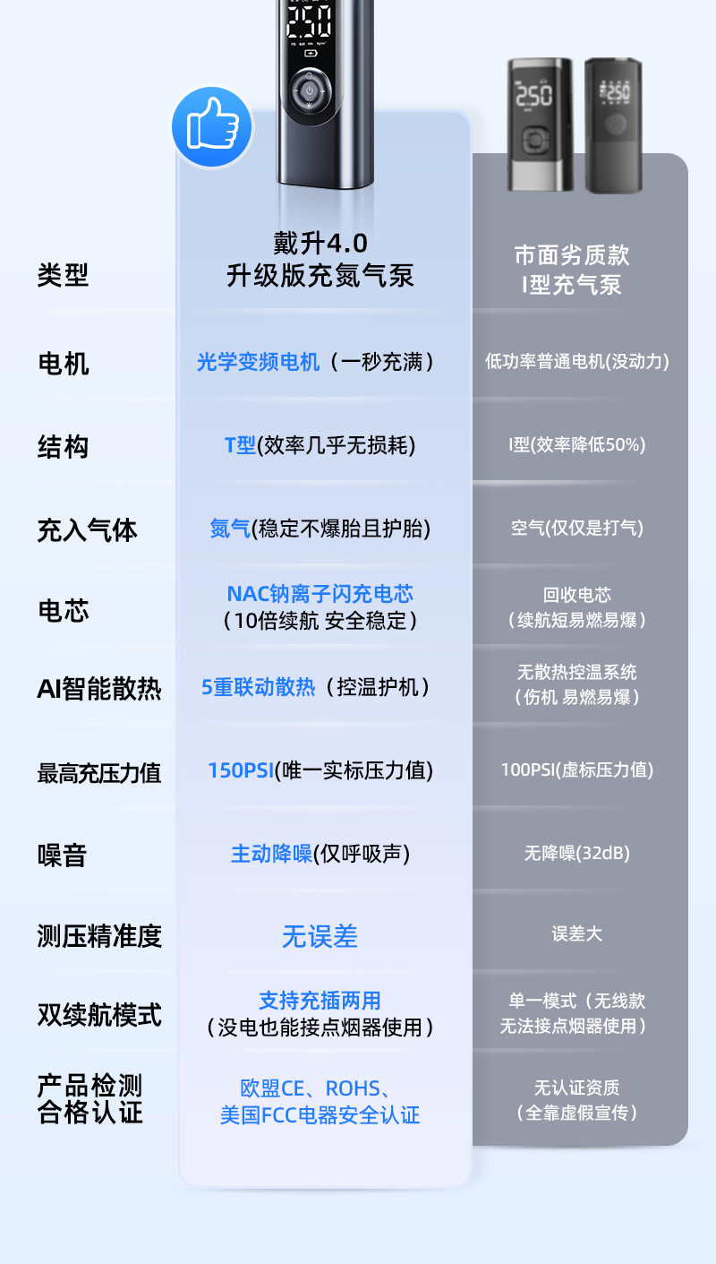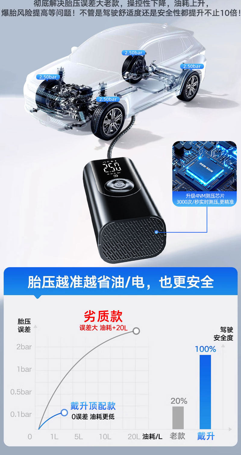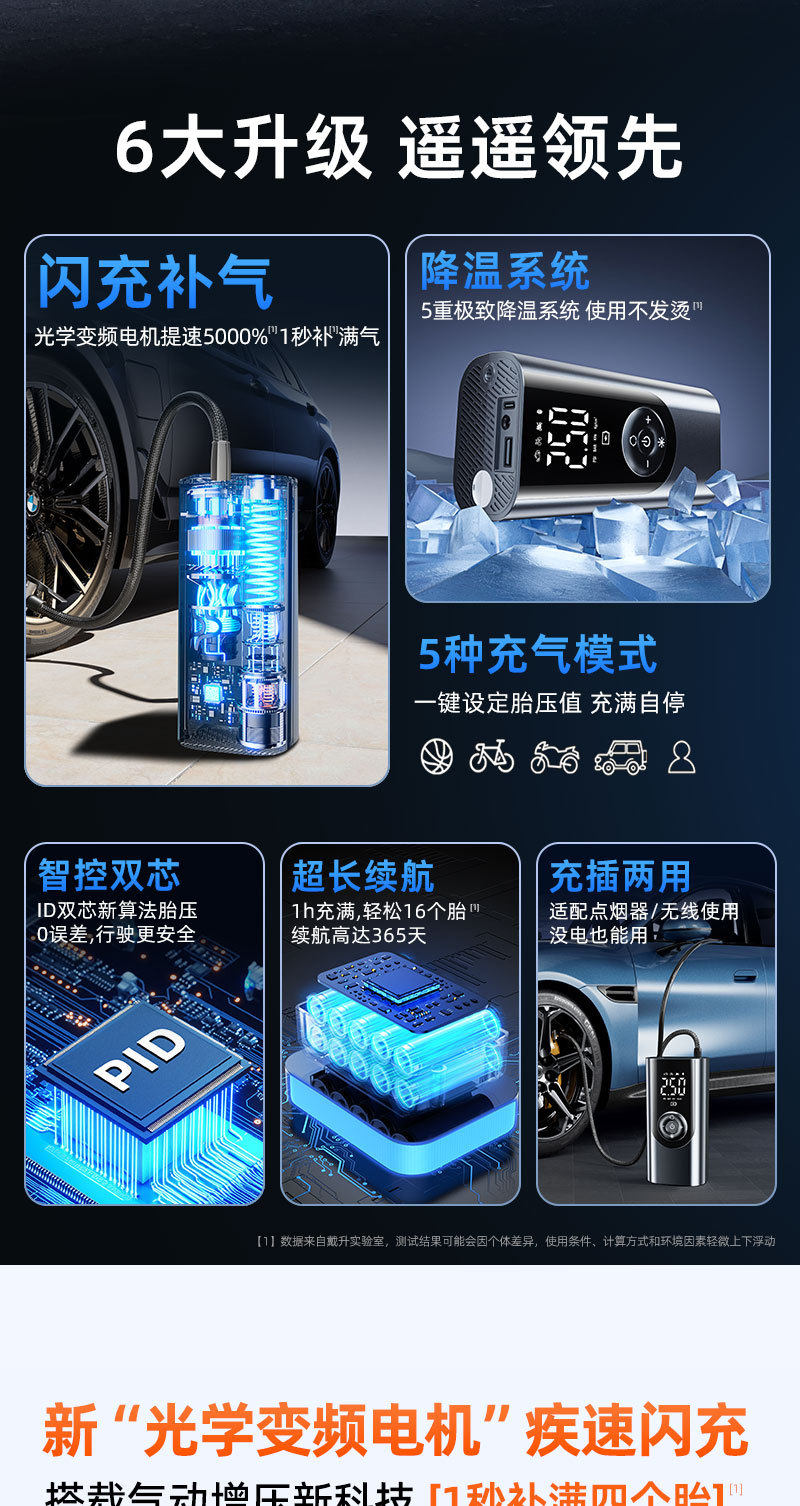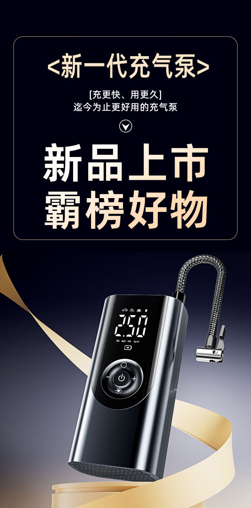 | Additional features | Lighting,Tire pressure gauge,Explosion proof,Warning light,Usb charging,Over heat protection,Anti-slip base,Automatic shutdown,Automatic charging stop,Air pressure alarm,Intelligent pressure monitoring,Tire pressure memory |