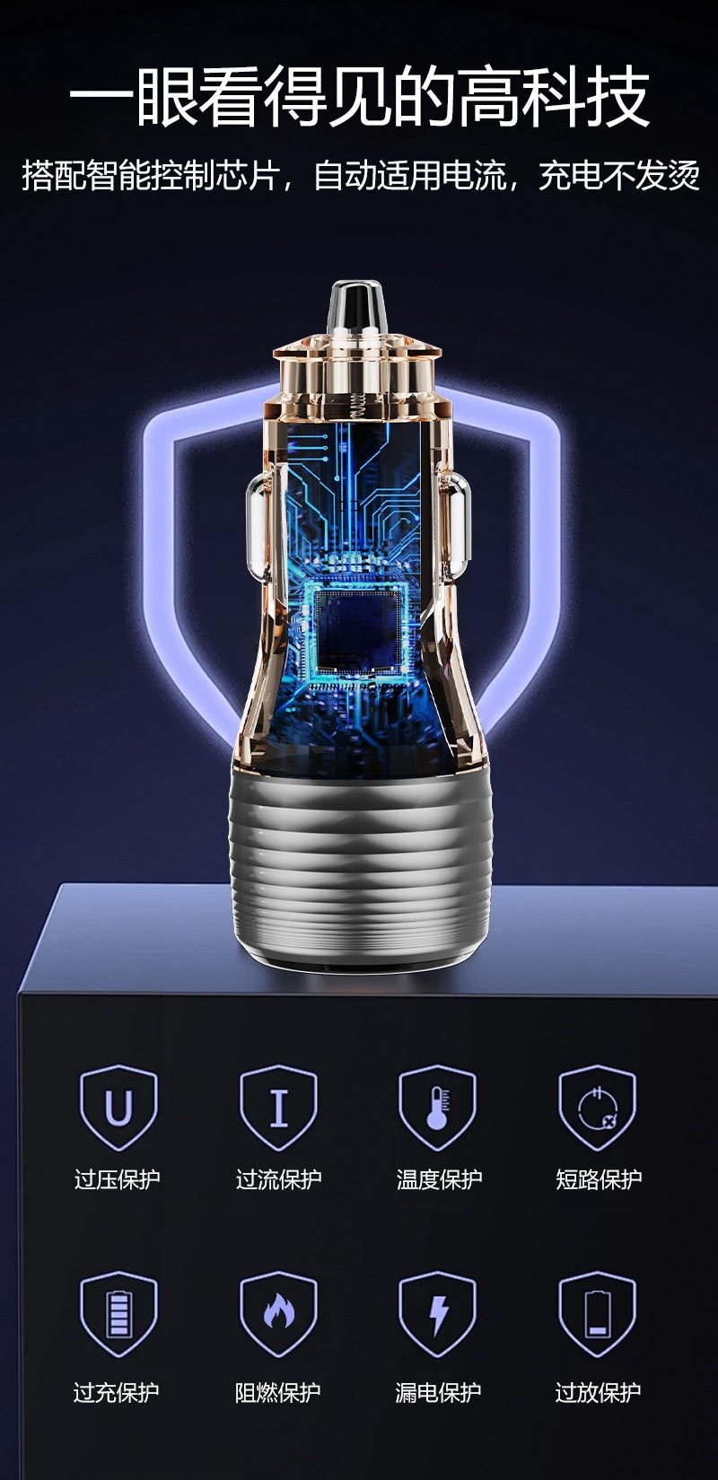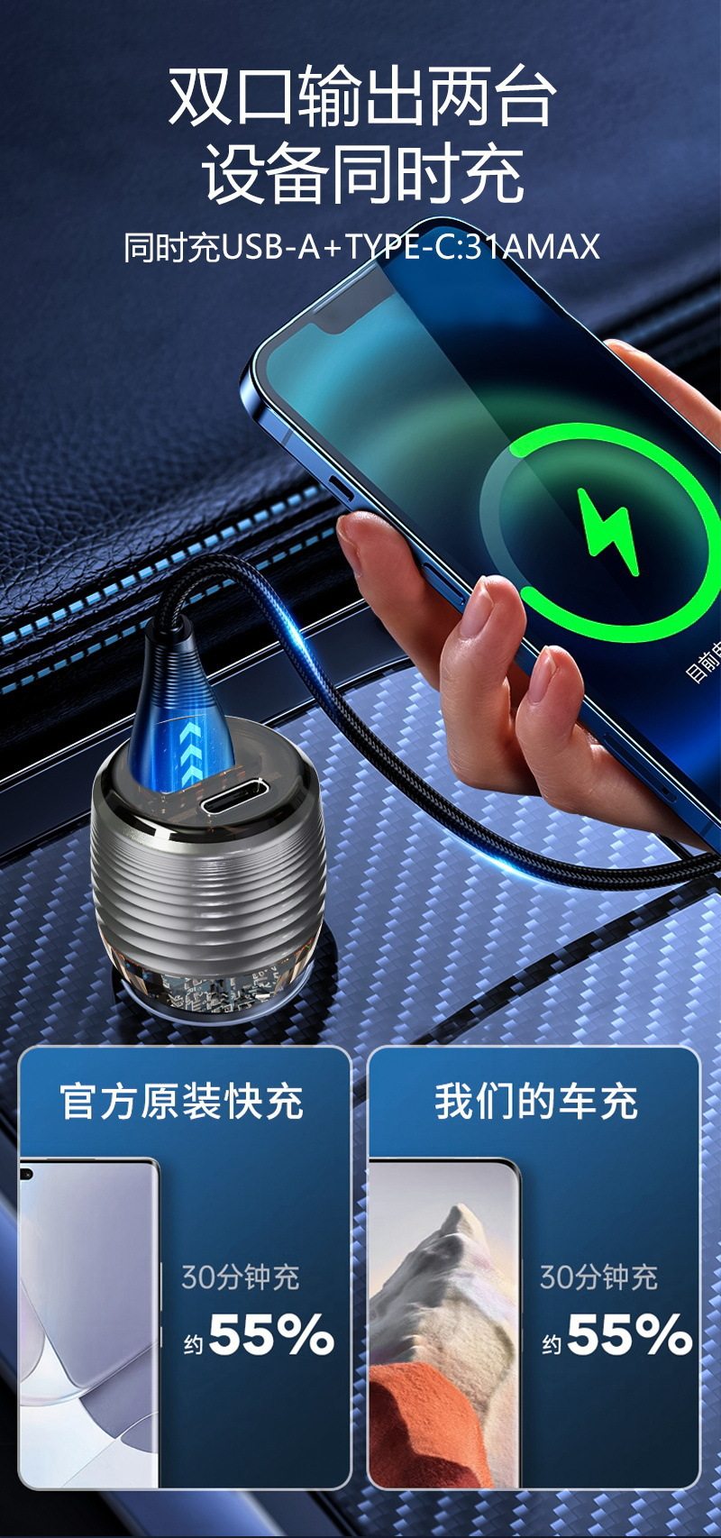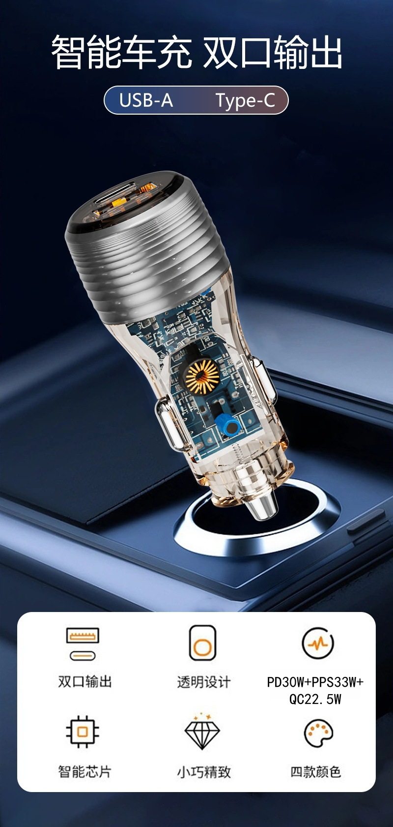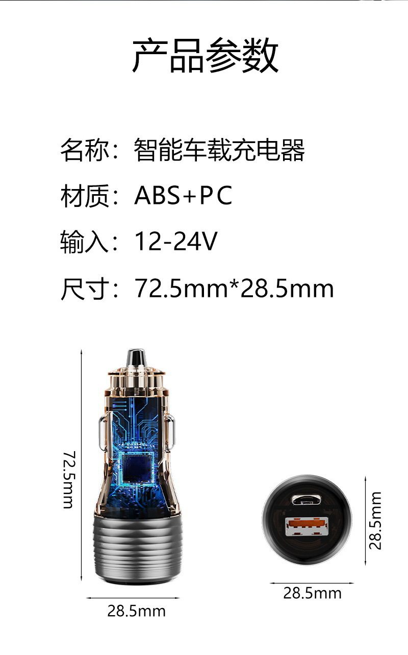 Cross-Border New Transparent Car Charger 55.5W Car Universal Car Charger Super Fast Charging Head Fully Protocol Compatible
