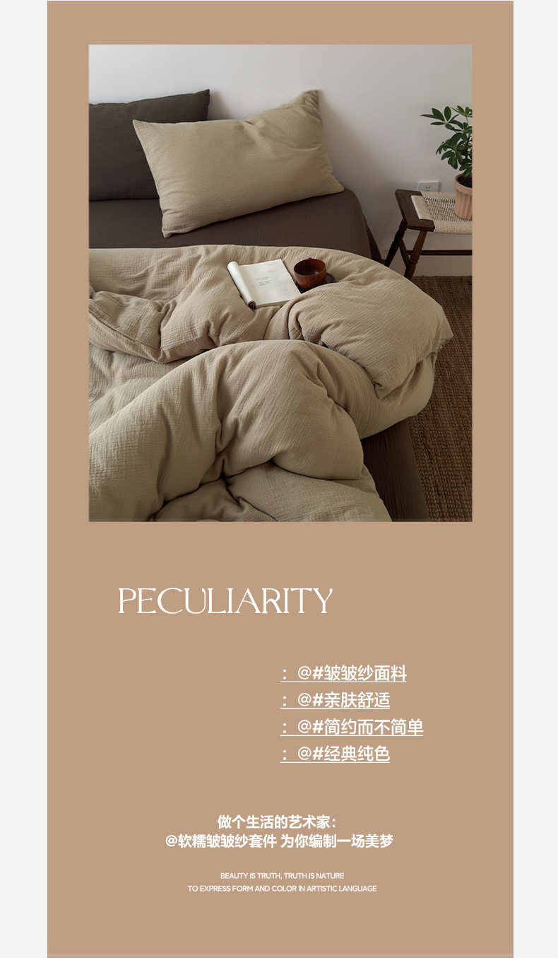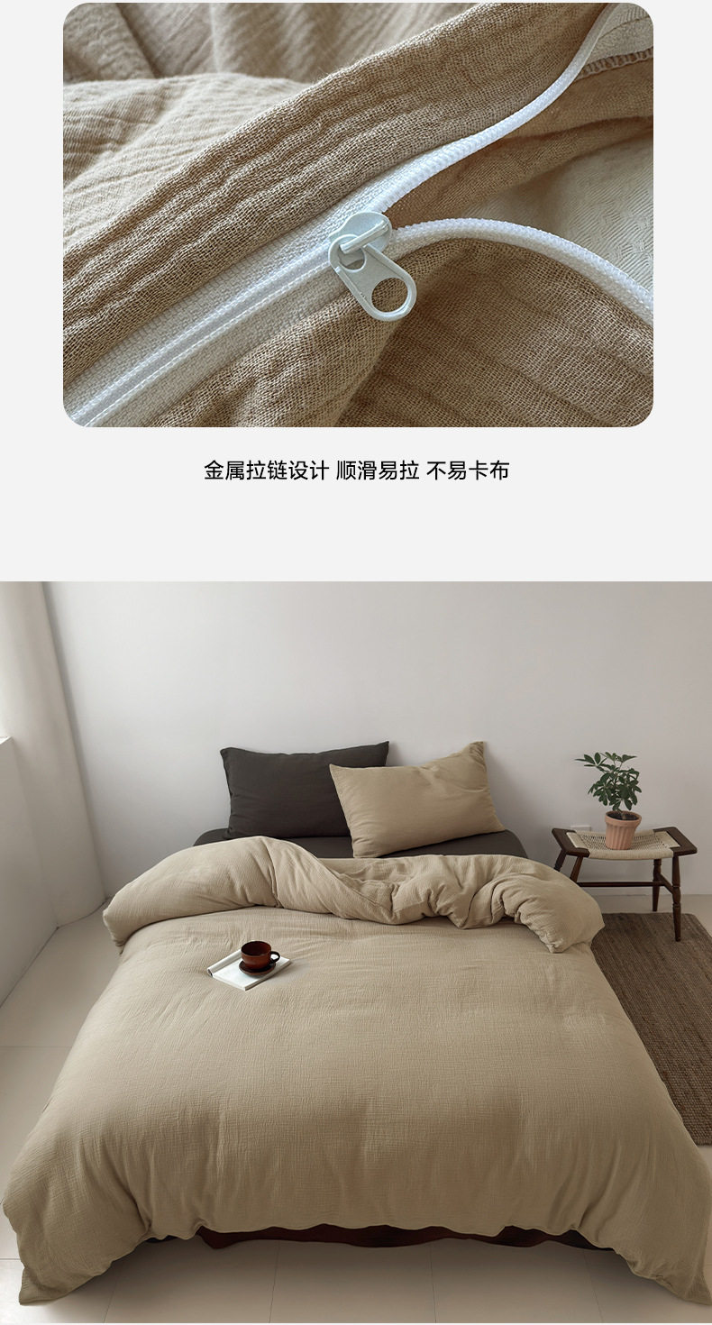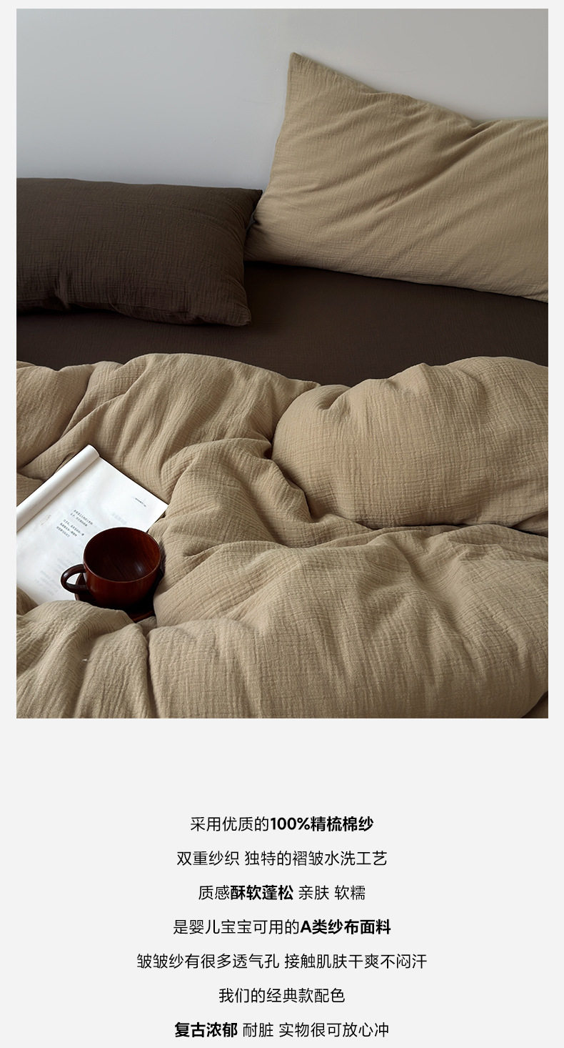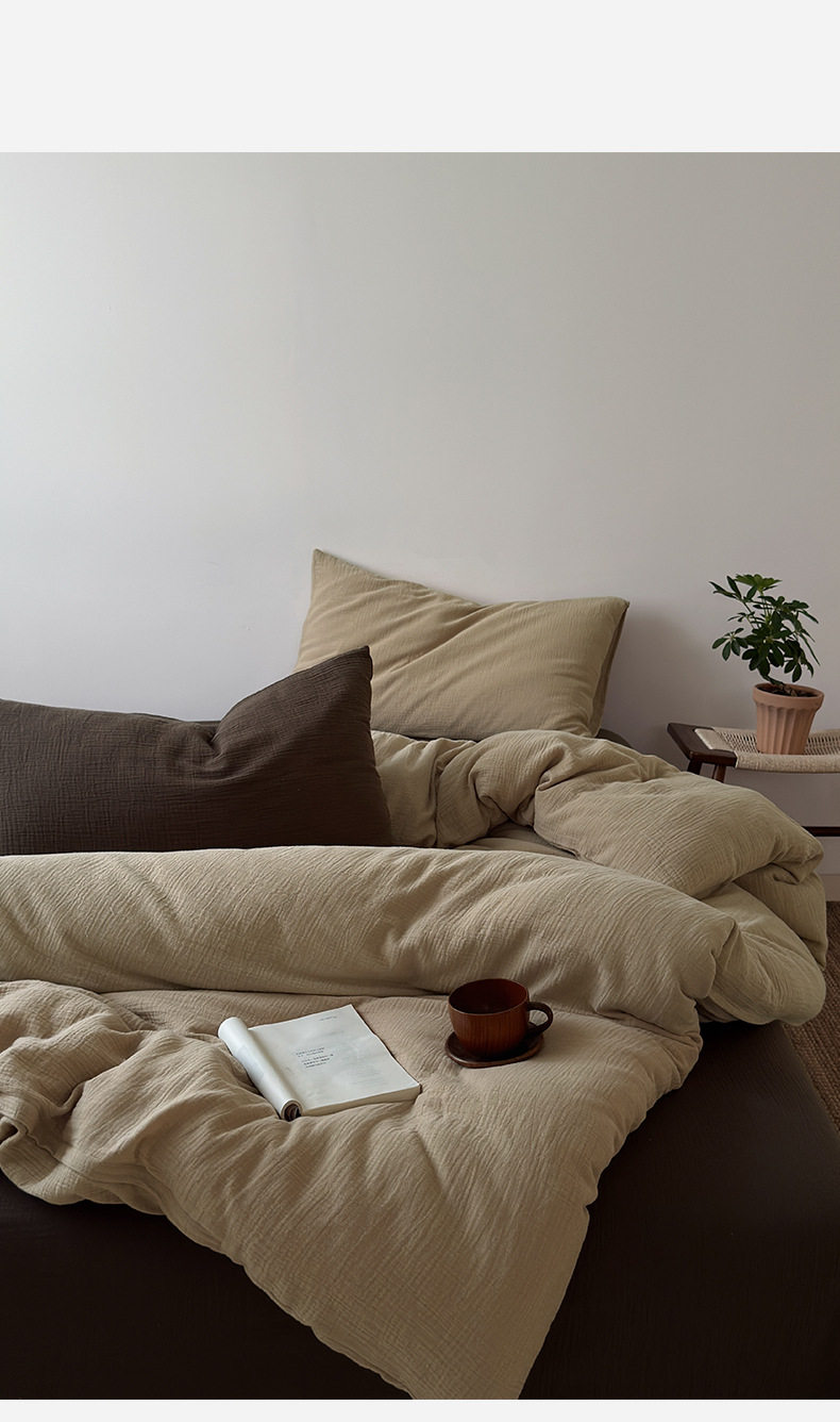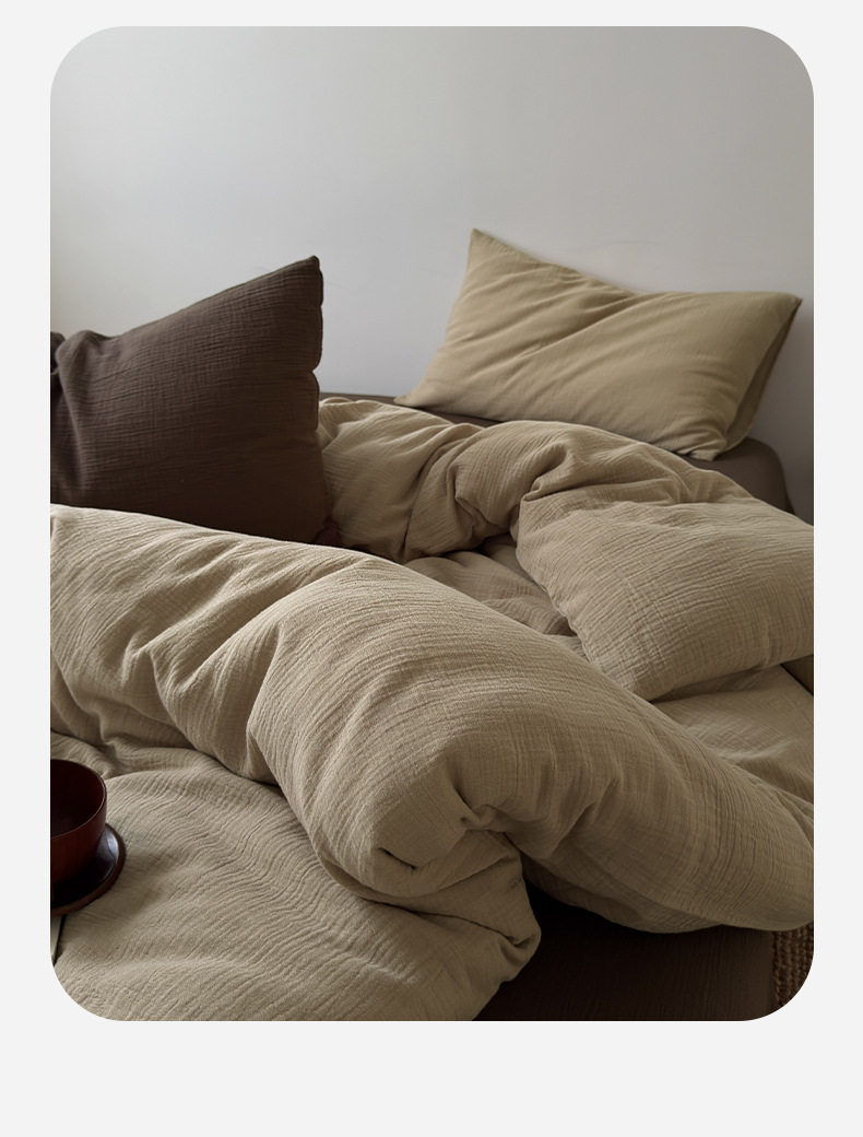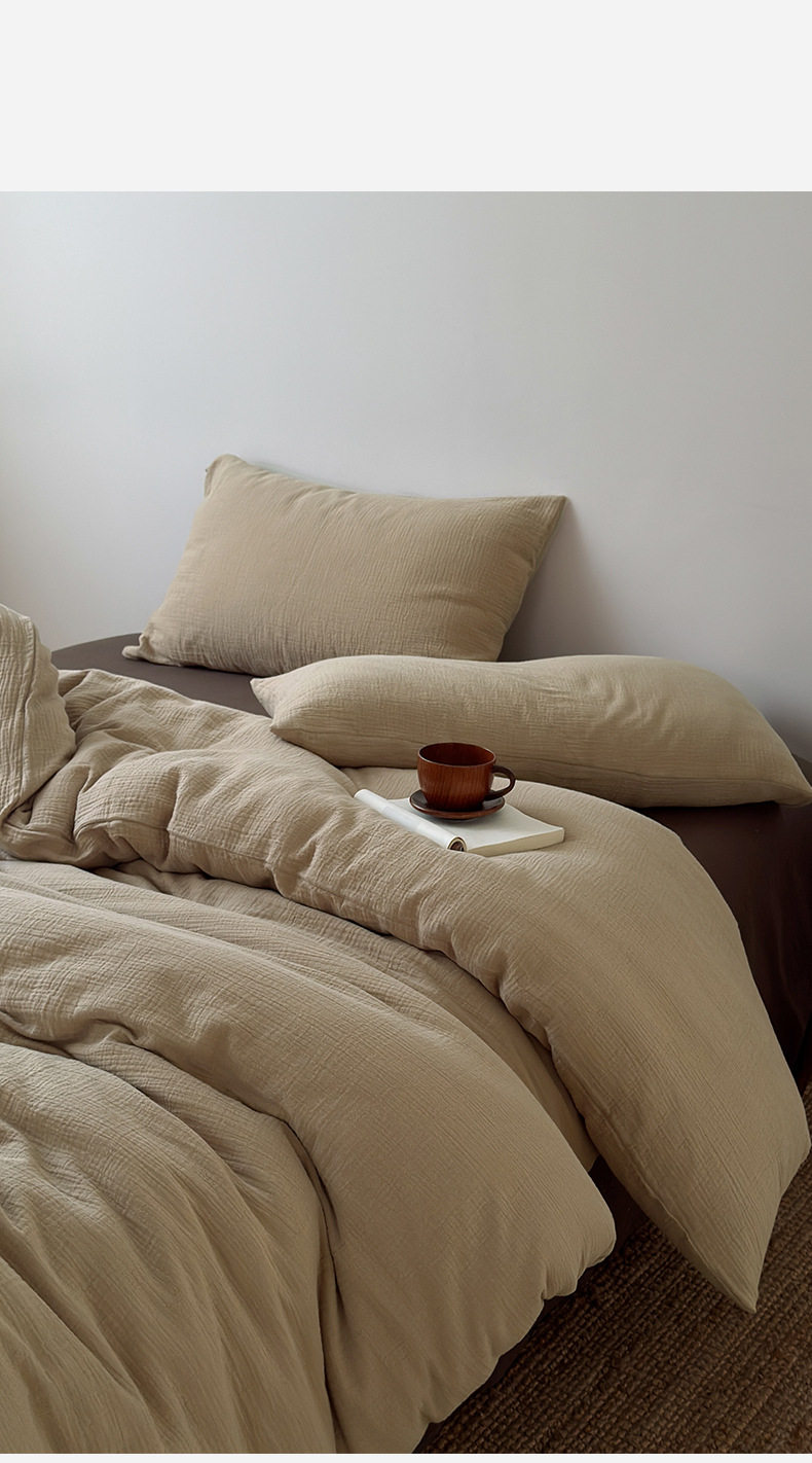 Pure Cotton Wrinkled Yarn Four-Piece Bed Bed Sheets Quilt Cover Bed Bed Sheets Pure Cotton Pure Color Simple Japanese Style Unprinted Style Dormitory Three-Piece Set