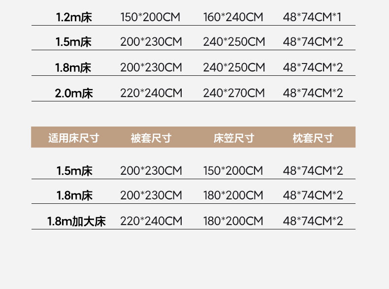 | Size specifications | 1.2m bed sheet three-piece set [quilt cover 150*200cm],1.5m bed sheet four-piece set [quilt cover 200*230cm],1.8m bed sheet four-piece set [quilt cover 200*230cm],2.0m bed sheet four-piece set [quilt cover 220*240cm],1.5m fitted sheet set of four [quilt cover 200*230cm],1.8m fitted sheet set of four [quilt cover 200*230cm],1.8m fitted sheet style quilt cover plus size four-piece set [quilt cover 220*240cm] |