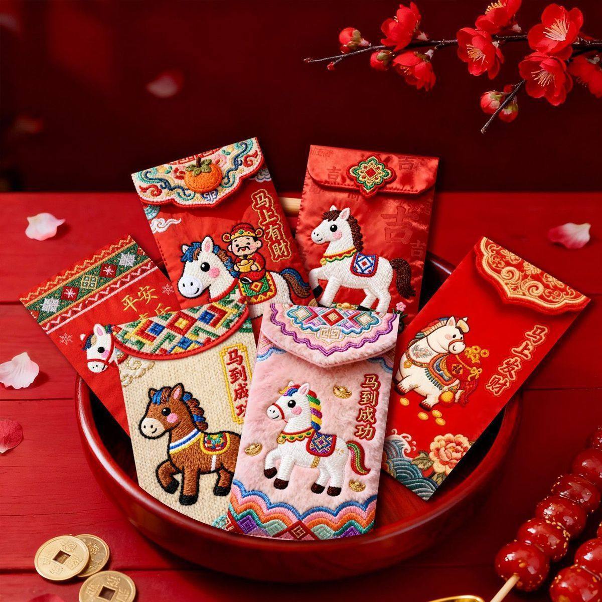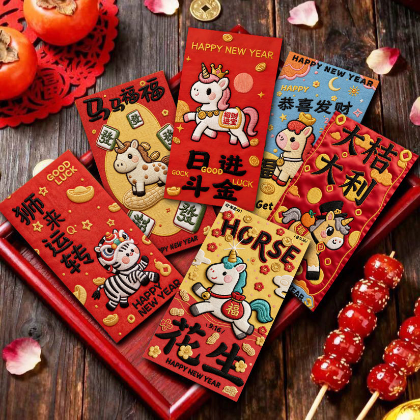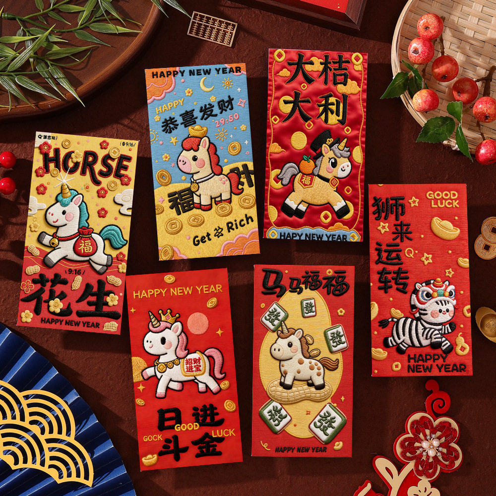 Tiktok Trending 2026 Year of the Horse Faux Flat Embroidery Cartoon Lucky Money Envelopes for Spring Festival Creative New Year Greeting Red Packets