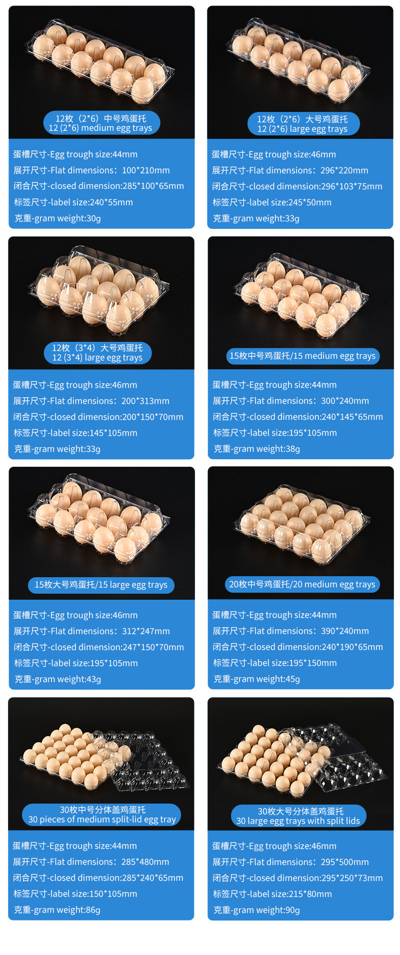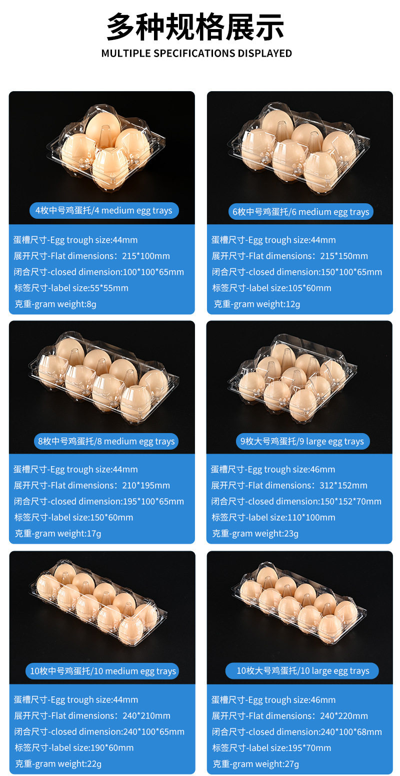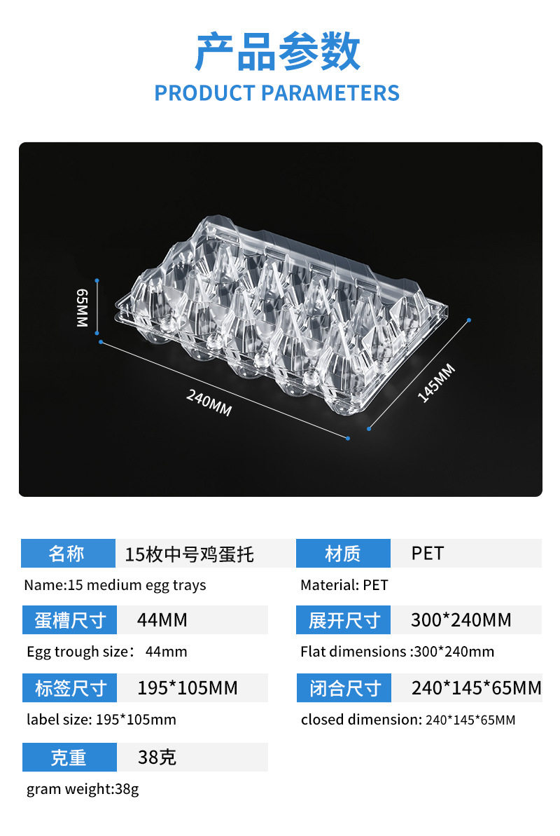 | Specifications and models | 15 medium thickened egg trays-100 pieces; natural color; pet,15 medium thickened egg trays 450-pieces; natural color; pet,15 large thickened egg trays-100 pieces; natural color; pet,15 large thickened egg trays - 450 pieces; natural color; pet |