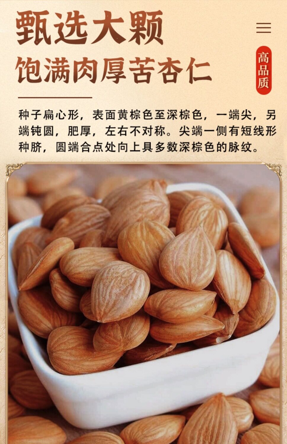 | Packaging specifications | Selected bitter almonds 250g (with skin),Selected bitter almonds 500g (with skin) |
