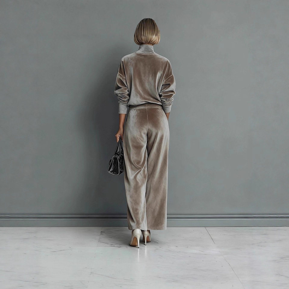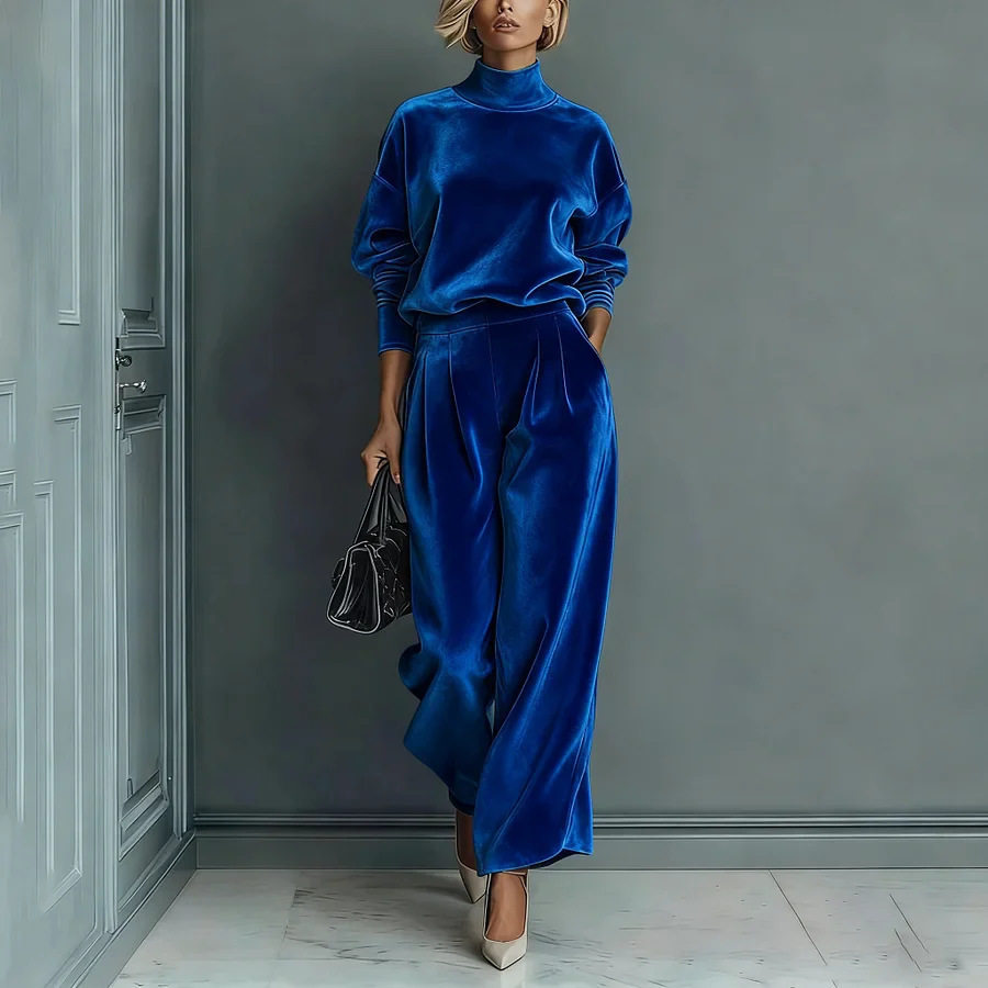 European and American Cross-Border Foreign Trade Women's Clothing Autumn and Winter Fashion Casual Sports Suit Velvet Long-Sleeve Solid Color High-Neck Wide-Leg Pants