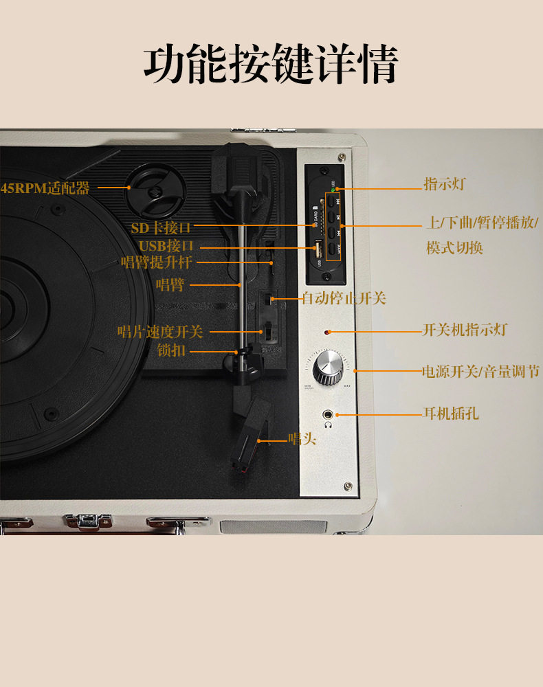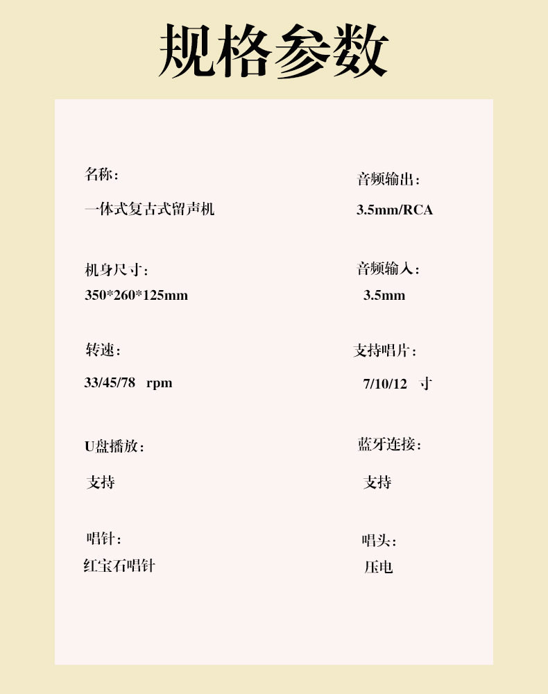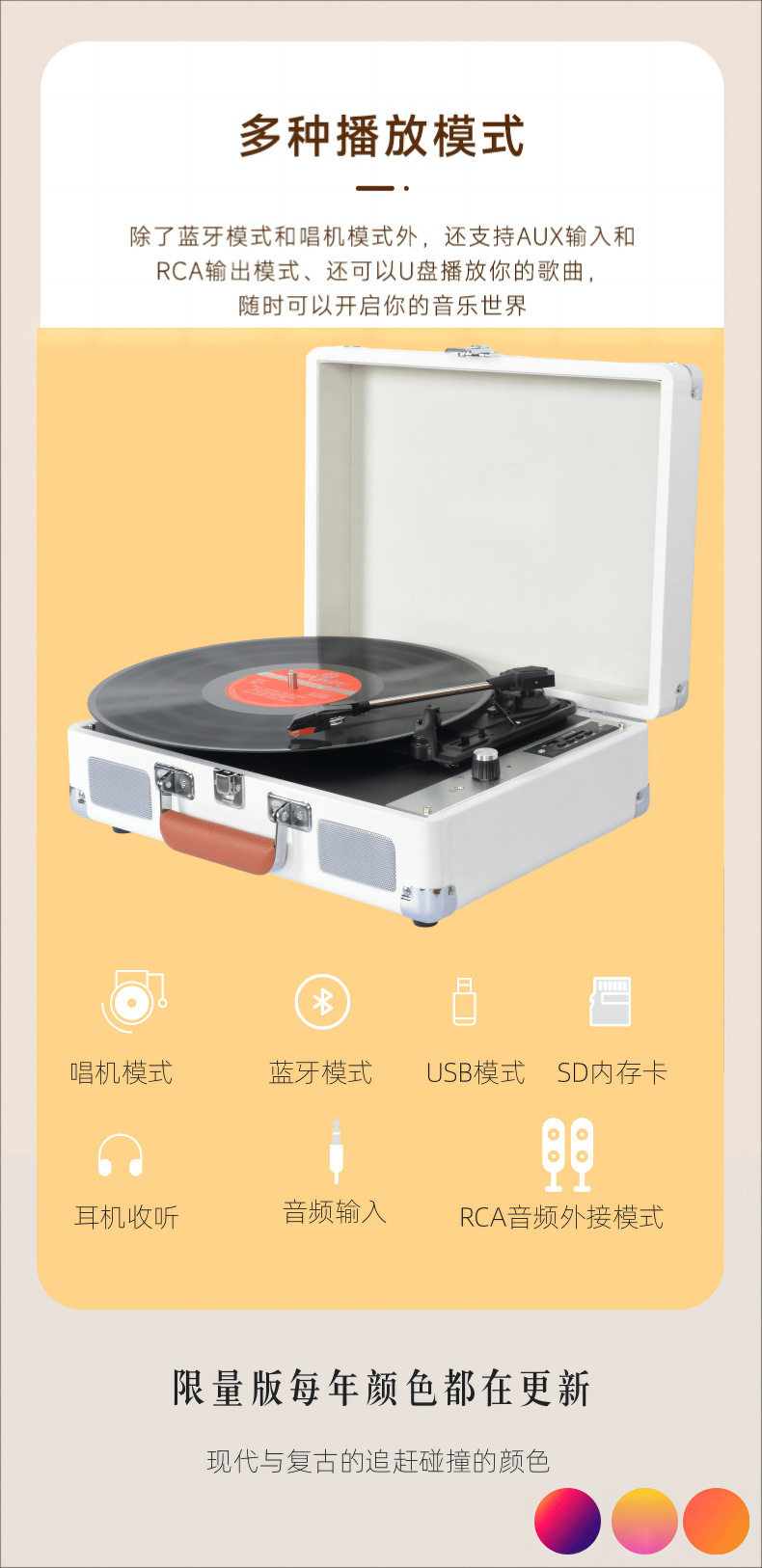 | Supported formats | Phono, bluetooth, usb playback, sd memory card playback, audio input, audio output, rca audio source external connection |