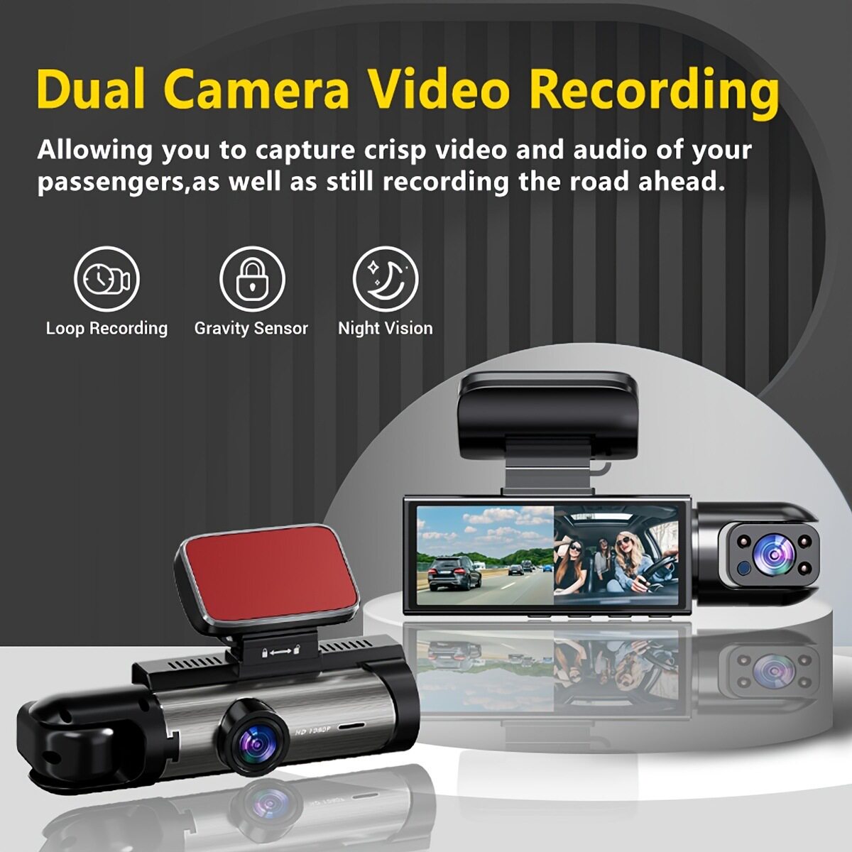 | Specifications | Dual lens [front of the car + inside the car] |