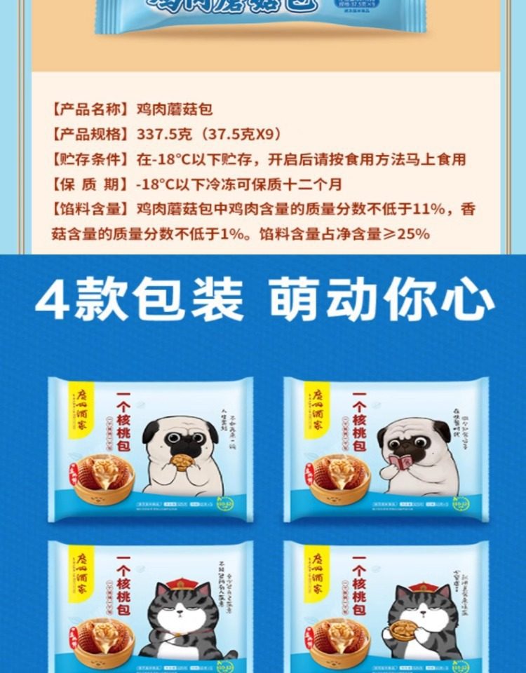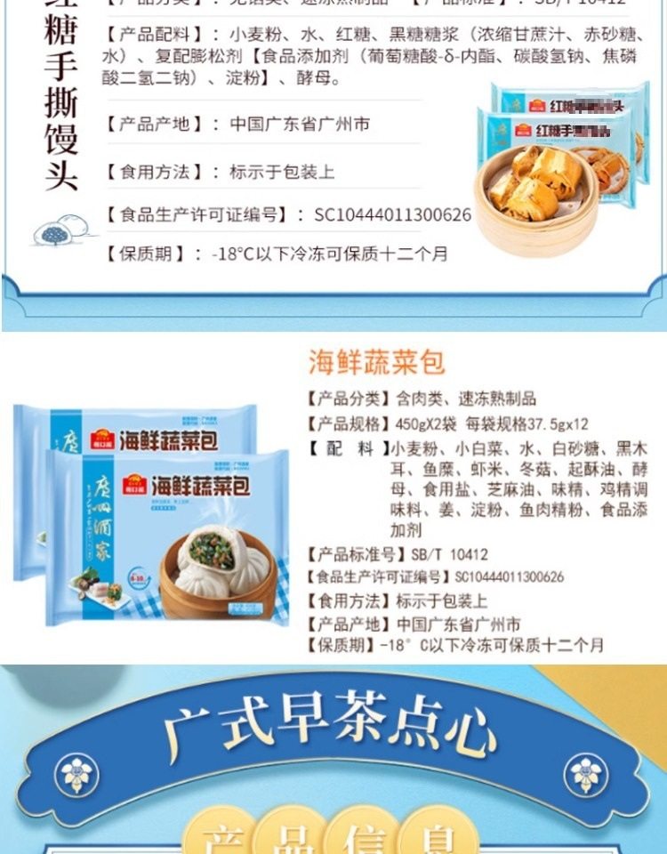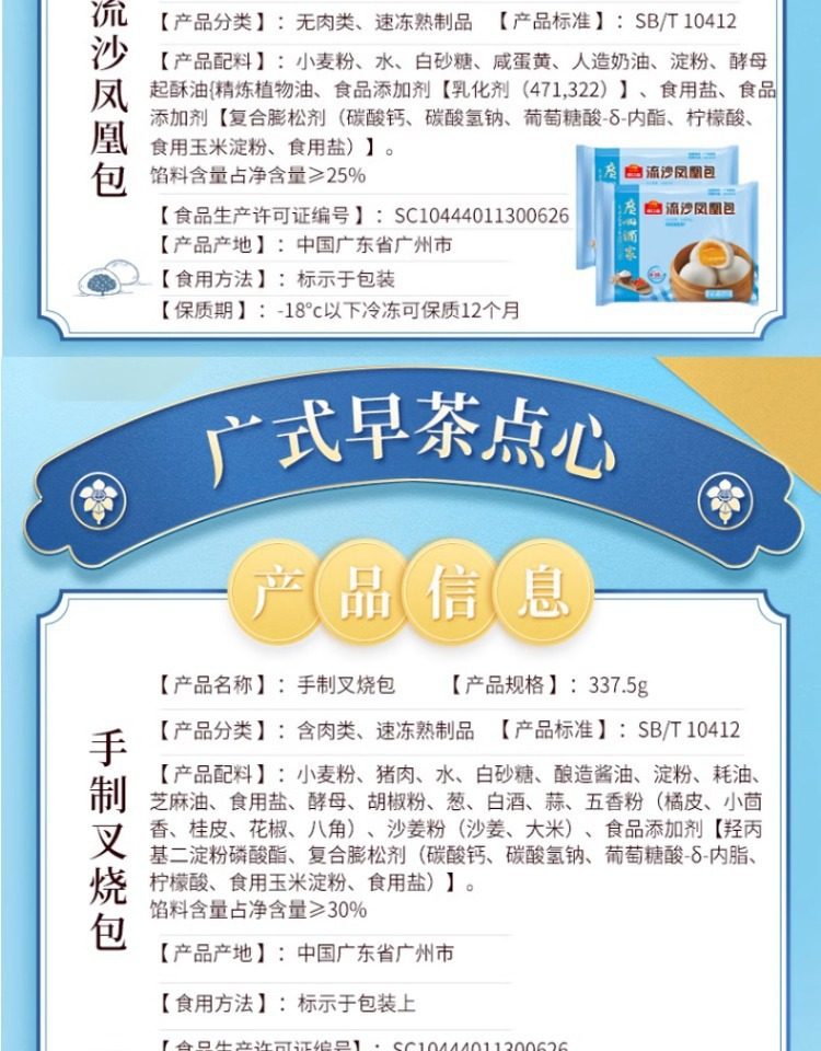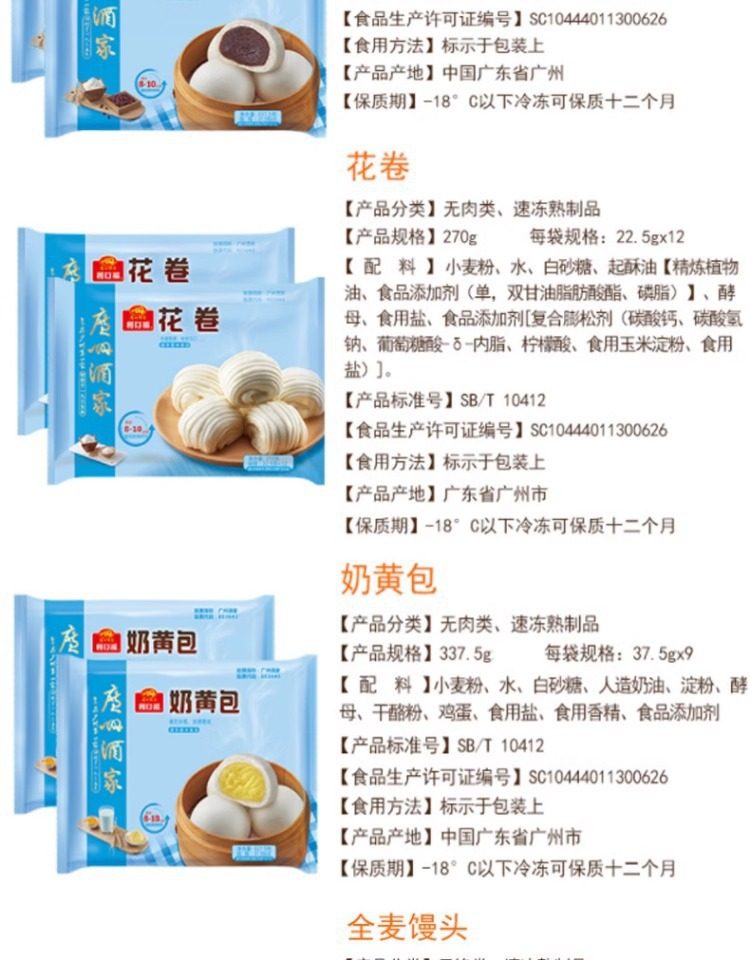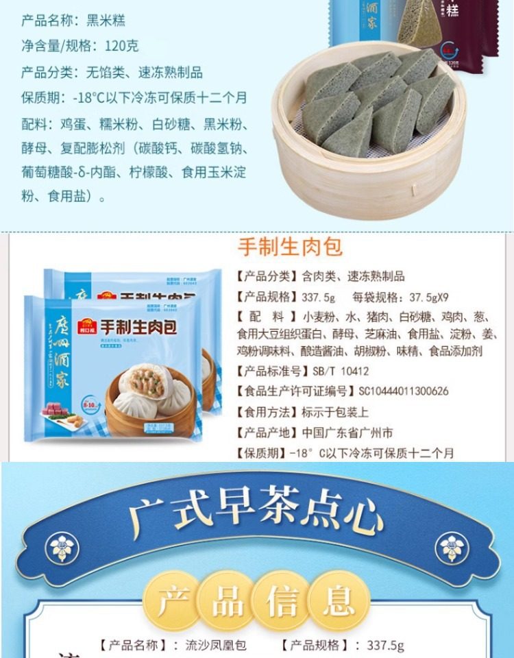 | Packaging specifications | Handmade barbecued pork buns 337.5g*1 pack (9 pieces),Phoenix quicksand bag 337.5g*1 bag (9 pieces),Walnut bag 337.5g*1 bag (9 pieces),Custard buns 337.5g*1 pack (9 pieces),Lotus paste bun 337.5g*1 pack (9 pieces),Bean paste buns 337.5g*1 pack (9 pieces),Handmade raw meat buns 337.5g*1 pack (9 pieces),Wheat-flavored barbecued pork buns 337.5g*1 pack (9 pieces),Shrimp dumplings 160g*1 pack (8 pieces),Fried mushroom and raw meat buns 337.5g*1 pack (9 pieces),Chicken mushroom buns 337.5g*1 pack (9 pieces),Watermelon bag 337.5g*1 bag (9 pieces),Banana bag 150g*1 bag (6 pieces),Seafood vegetable buns 450g*1 pack (12 pieces),Mushroom soup dumplings 300g*1 pack (12 pieces),Honey bbq pork buns 480g*1 pack (6 pieces),Cheese durian buns 225g*1 pack (6 pieces),Cheese bacon buns 225g*1 pack (6 pieces),Open barbecued pork buns 270g*1 pack (6 pieces),Intestine buns 4 pieces 240g*1 pack (4 pieces),Hanamaki 270g*1 pack (12 pieces),Lotus fragrant glutinous rice chicken 540g*1 pack (6 pieces),Dried mushroom steamed siomai 210g*1 pack (12 pieces),Steamed steamed prawns 210g*1 pack (12 pieces),Vegetarian spring rolls 500g*1 pack (20 pieces),Mala cake 360g*1 pack (8 pieces),Black rice cake 120g,Xiaomi cake 120g,Osmanthus cake 130g,Smooth beef balls 200g*1 pack (8 pieces),Crystal cookies (black sesame) 360g*1 pack (12 pieces),Crystal cake (bean paste) 360g*1 pack (12 pieces),Milk steamed buns 600g*1 pack (24 pieces),White steamed buns 400g*1 pack (16 pieces),Whole wheat steamed buns 400g*1 pack (16 pieces),Brown sugar hand-shredded steamed buns 390g*1 pack (6 pieces),Juicy pan-fried dumplings with bone broth (corn and pork flavor) 300g*1 pack,Juicy pan-fried dumplings with bone broth (leek and pork flavor) 300g*1 pack,Shrimp rice roll 185g*1 pack (3 pieces),Barbecued pork rice roll 185g*1 pack (3 pieces),Pork rice roll 185g*1 pack (3 pieces),Beef rice roll 185g*1 pack (3 pieces),Barbecued pork dumplings 300g*1 pack (12 pieces),Chicken feet 250g,Black bean sauce pork ribs 250g*1 pack |
