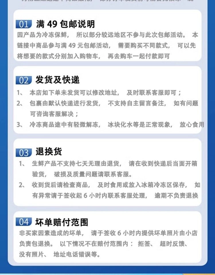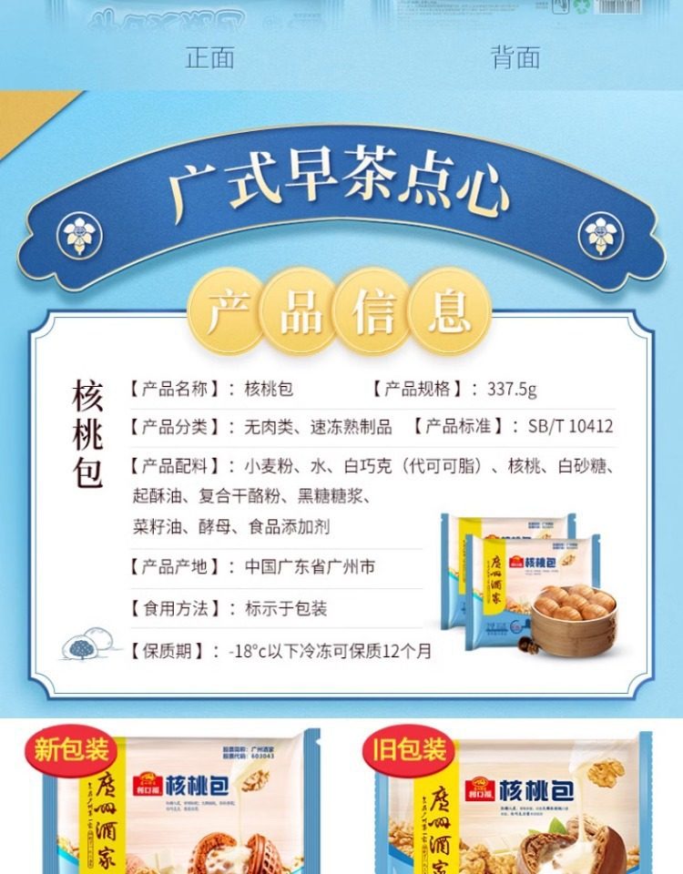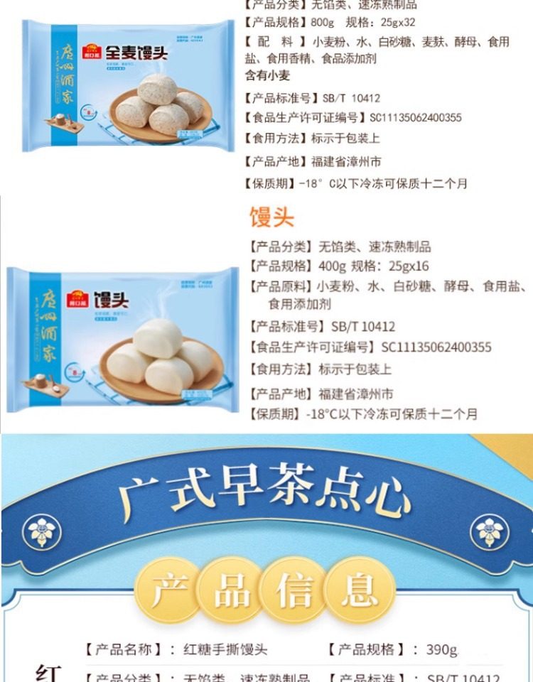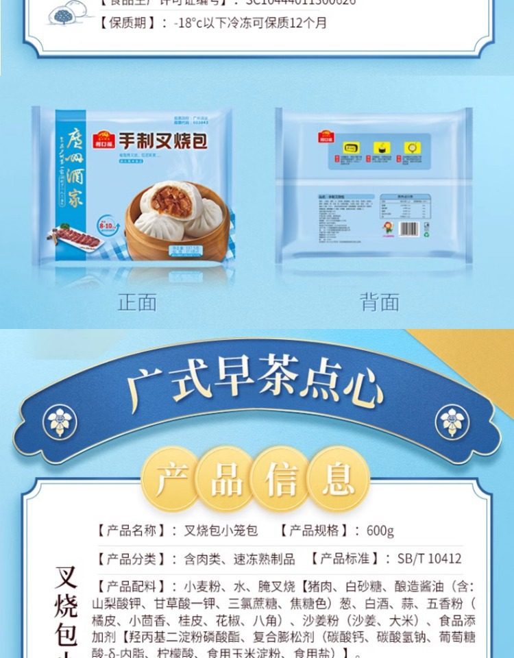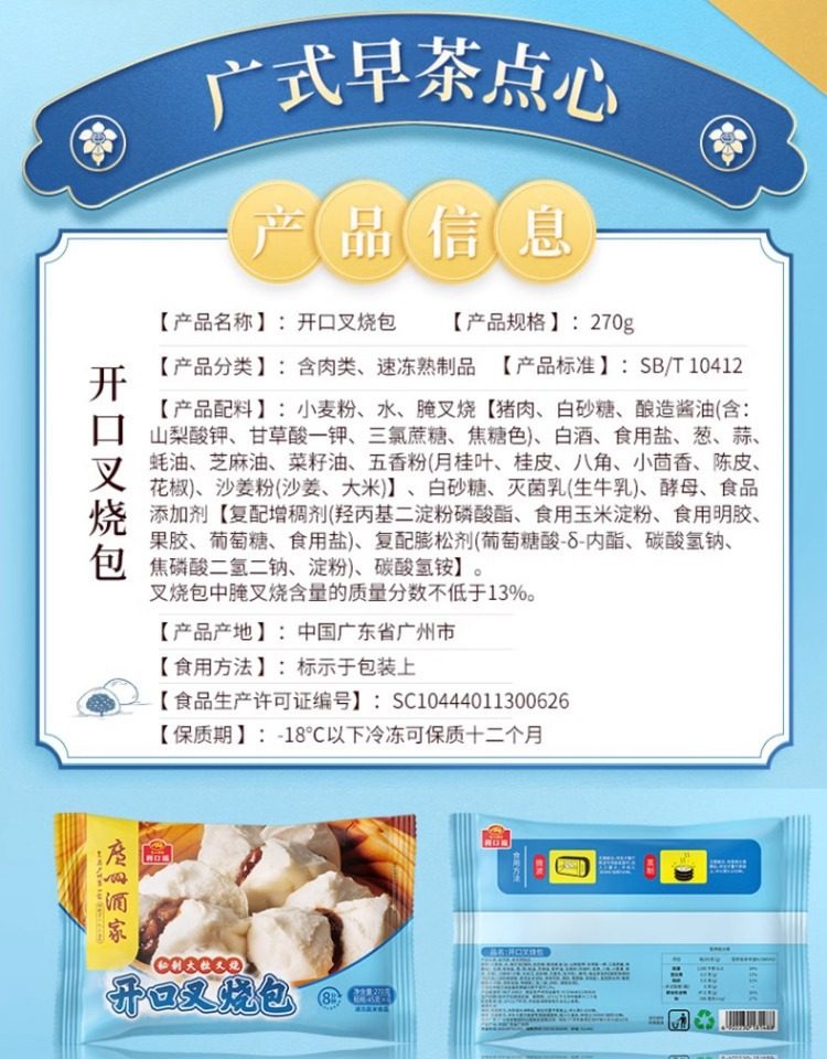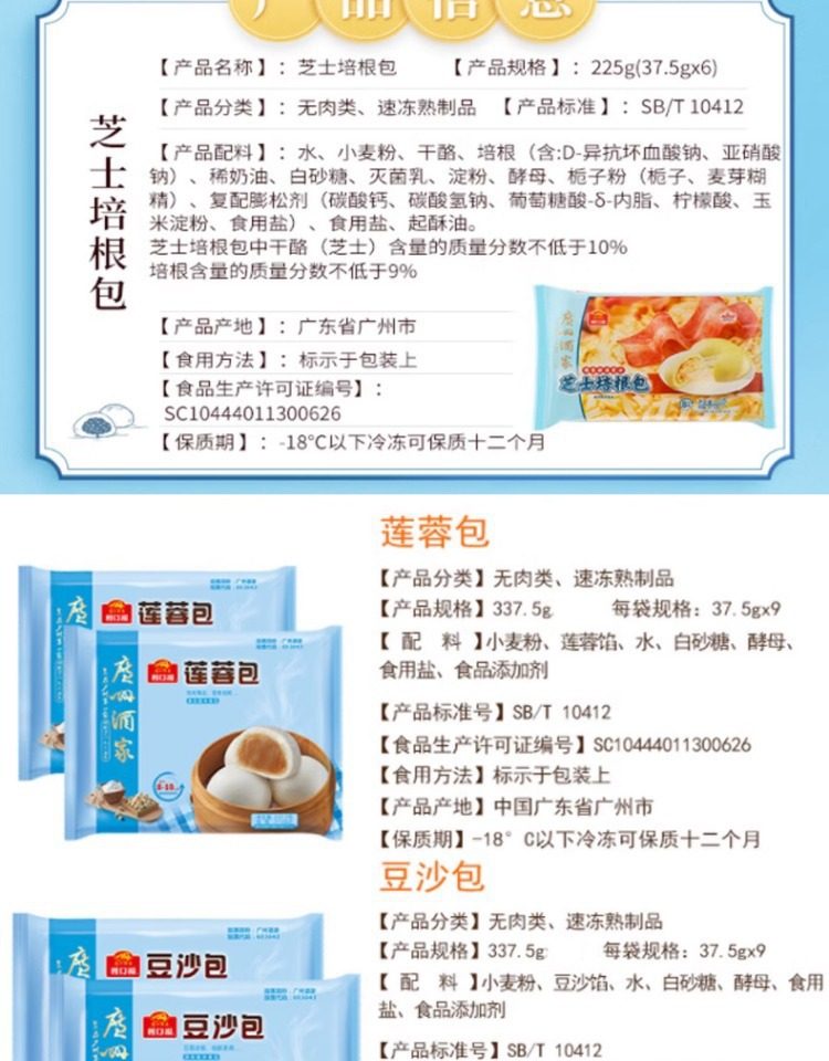 | Packaging specifications | Handmade barbecued pork buns 337.5g*1 pack (9 pieces),Phoenix quicksand bag 337.5g*1 bag (9 pieces),Walnut bag 337.5g*1 bag (9 pieces),Custard buns 337.5g*1 pack (9 pieces),Lotus paste bun 337.5g*1 pack (9 pieces),Bean paste buns 337.5g*1 pack (9 pieces),Handmade raw meat buns 337.5g*1 pack (9 pieces),Wheat-flavored barbecued pork buns 337.5g*1 pack (9 pieces),Shrimp dumplings 160g*1 pack (8 pieces),Fried mushroom and raw meat buns 337.5g*1 pack (9 pieces),Chicken mushroom buns 337.5g*1 pack (9 pieces),Watermelon bag 337.5g*1 bag (9 pieces),Banana bag 150g*1 bag (6 pieces),Seafood vegetable buns 450g*1 pack (12 pieces),Mushroom soup dumplings 300g*1 pack (12 pieces),Honey bbq pork buns 480g*1 pack (6 pieces),Cheese durian buns 225g*1 pack (6 pieces),Cheese bacon buns 225g*1 pack (6 pieces),Open barbecued pork buns 270g*1 pack (6 pieces),Intestine buns 4 pieces 240g*1 pack (4 pieces),Hanamaki 270g*1 pack (12 pieces),Lotus fragrant glutinous rice chicken 540g*1 pack (6 pieces),Dried mushroom steamed siomai 210g*1 pack (12 pieces),Steamed steamed prawns 210g*1 pack (12 pieces),Vegetarian spring rolls 500g*1 pack (20 pieces),Mala cake 360g*1 pack (8 pieces),Black rice cake 120g,Xiaomi cake 120g,Osmanthus cake 130g,Smooth beef balls 200g*1 pack (8 pieces),Crystal cookies (black sesame) 360g*1 pack (12 pieces),Crystal cake (bean paste) 360g*1 pack (12 pieces),Milk steamed buns 600g*1 pack (24 pieces),White steamed buns 400g*1 pack (16 pieces),Whole wheat steamed buns 400g*1 pack (16 pieces),Brown sugar hand-shredded steamed buns 390g*1 pack (6 pieces),Juicy pan-fried dumplings with bone broth (corn and pork flavor) 300g*1 pack,Juicy pan-fried dumplings with bone broth (leek and pork flavor) 300g*1 pack,Shrimp rice roll 185g*1 pack (3 pieces),Barbecued pork rice roll 185g*1 pack (3 pieces),Pork rice roll 185g*1 pack (3 pieces),Beef rice roll 185g*1 pack (3 pieces),Barbecued pork dumplings 300g*1 pack (12 pieces),Chicken feet 250g,Black bean sauce pork ribs 250g*1 pack |