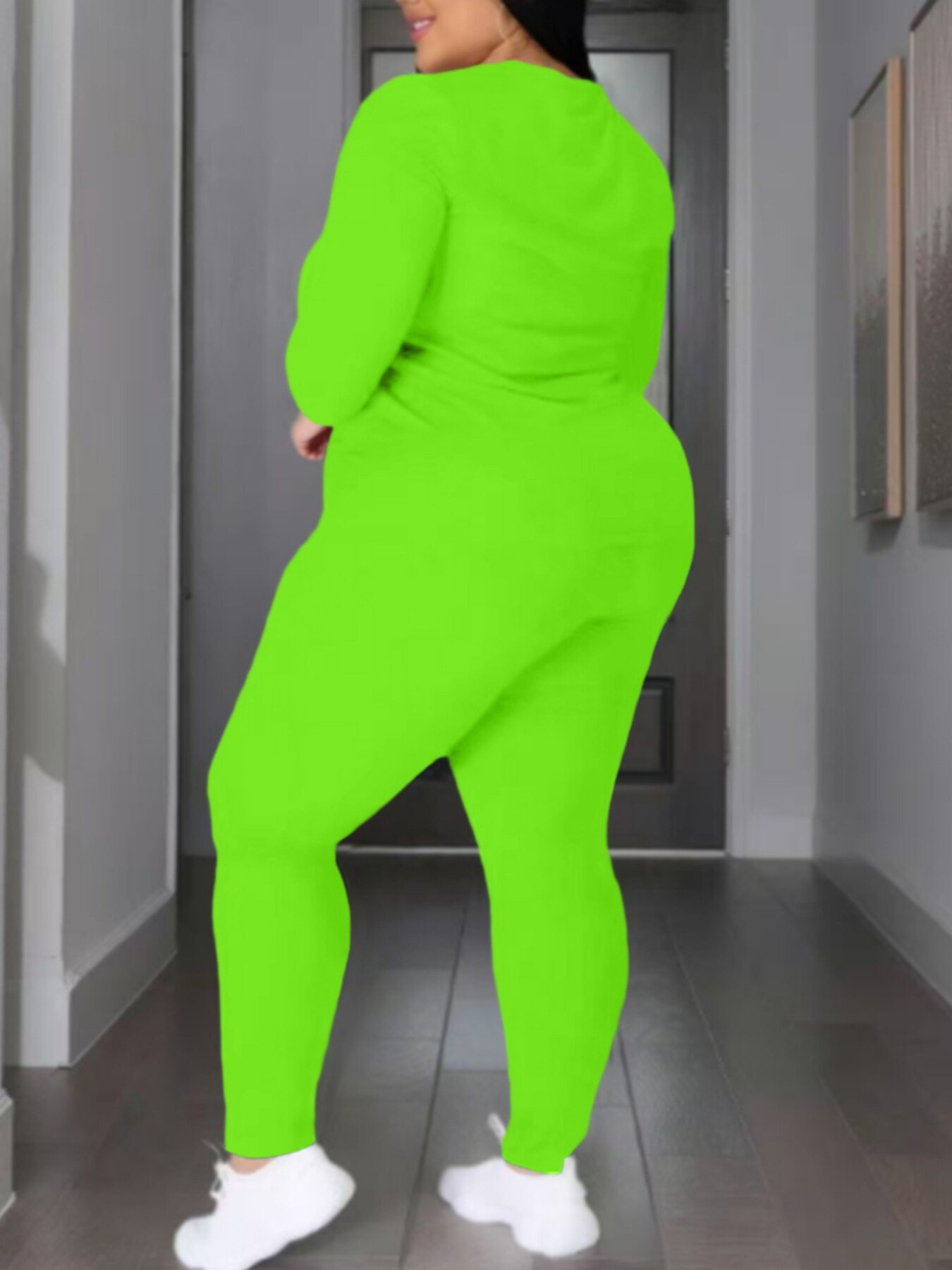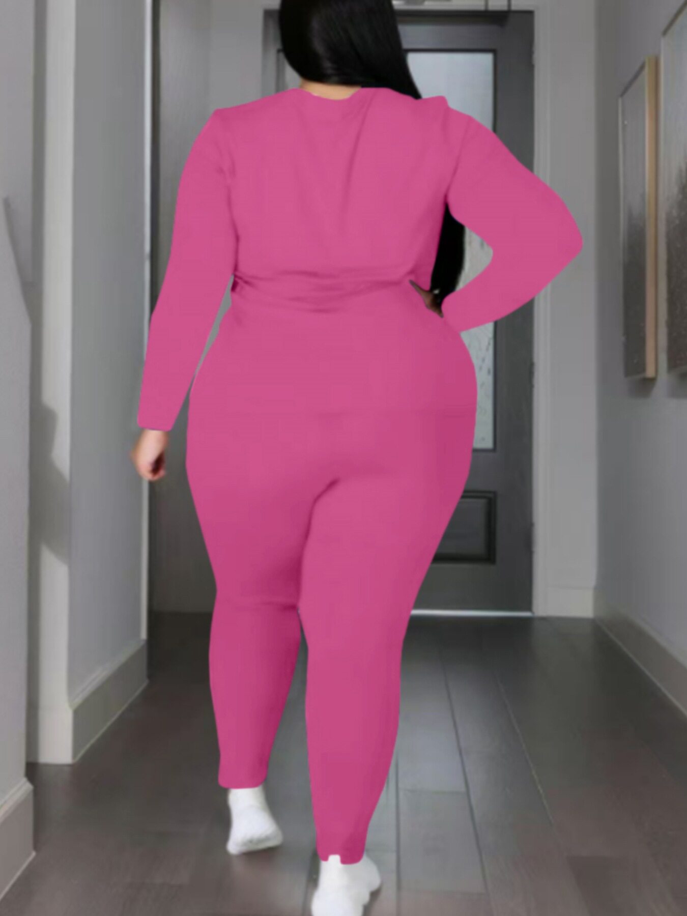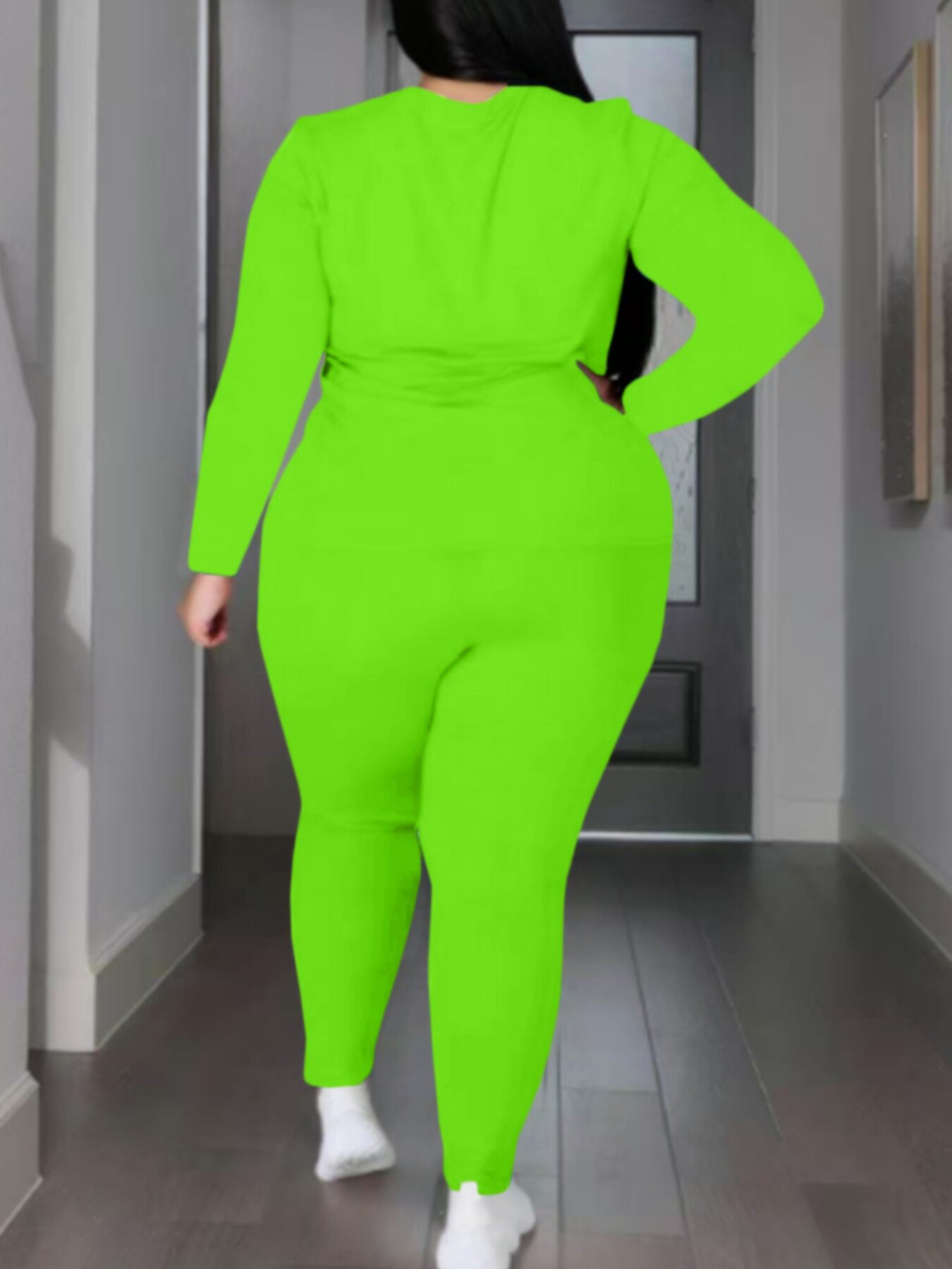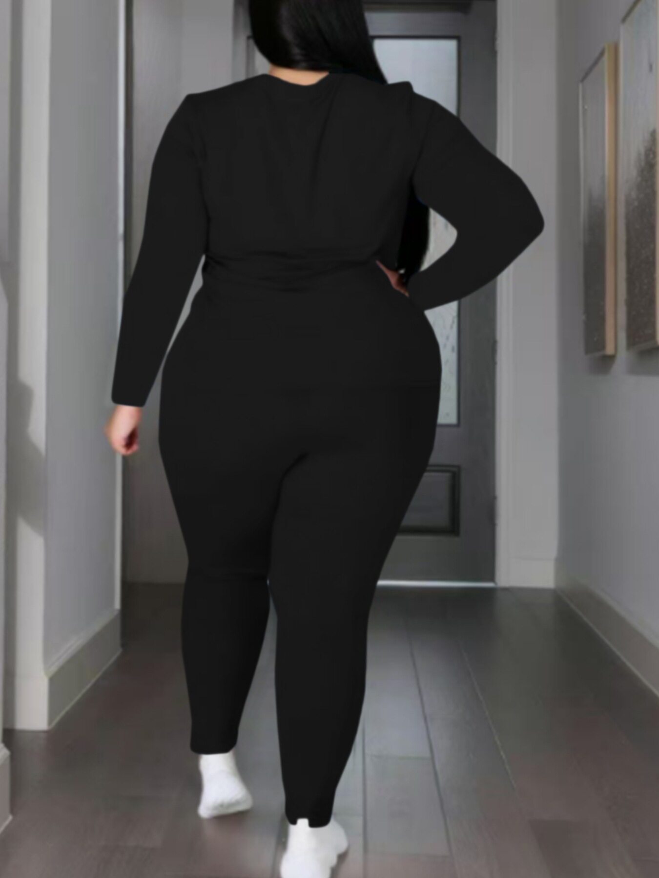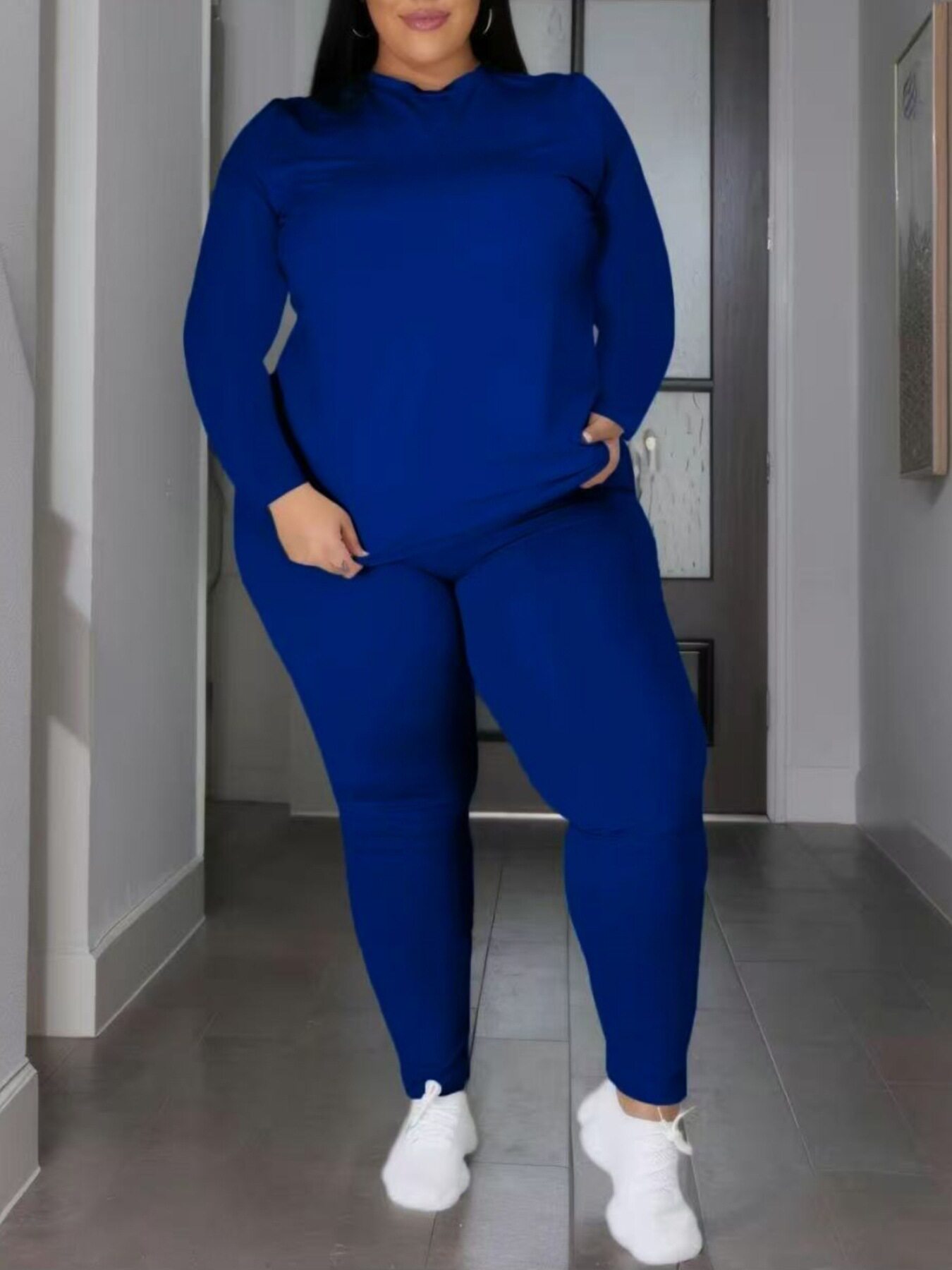 European and American New Large Size Women's Pure Color Two-Piece Suit, Long-Sleeved Round Neck T-Shirt Top and Tights Two-Piece Set