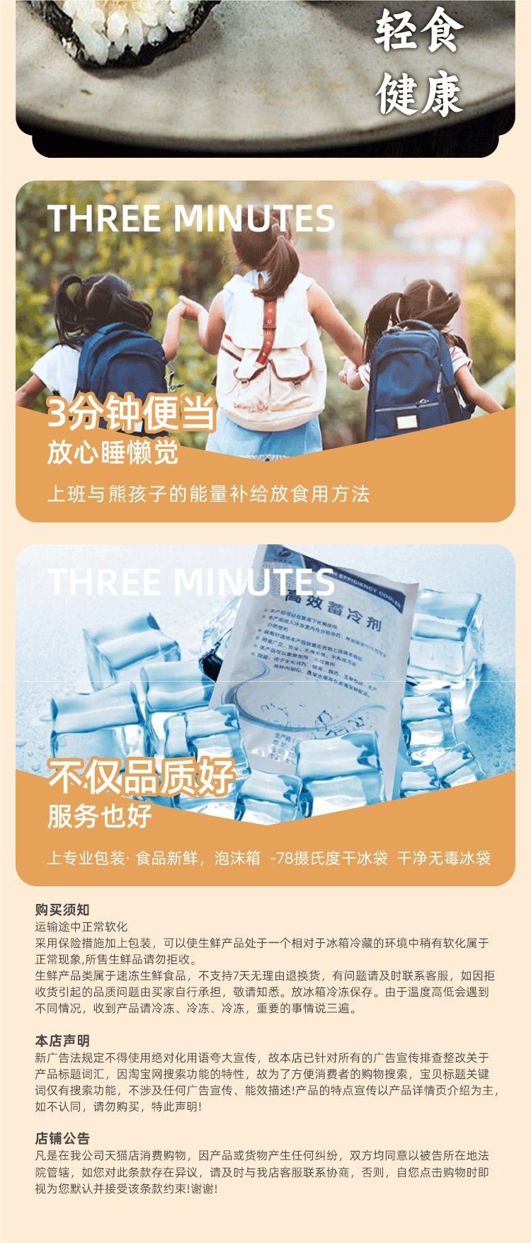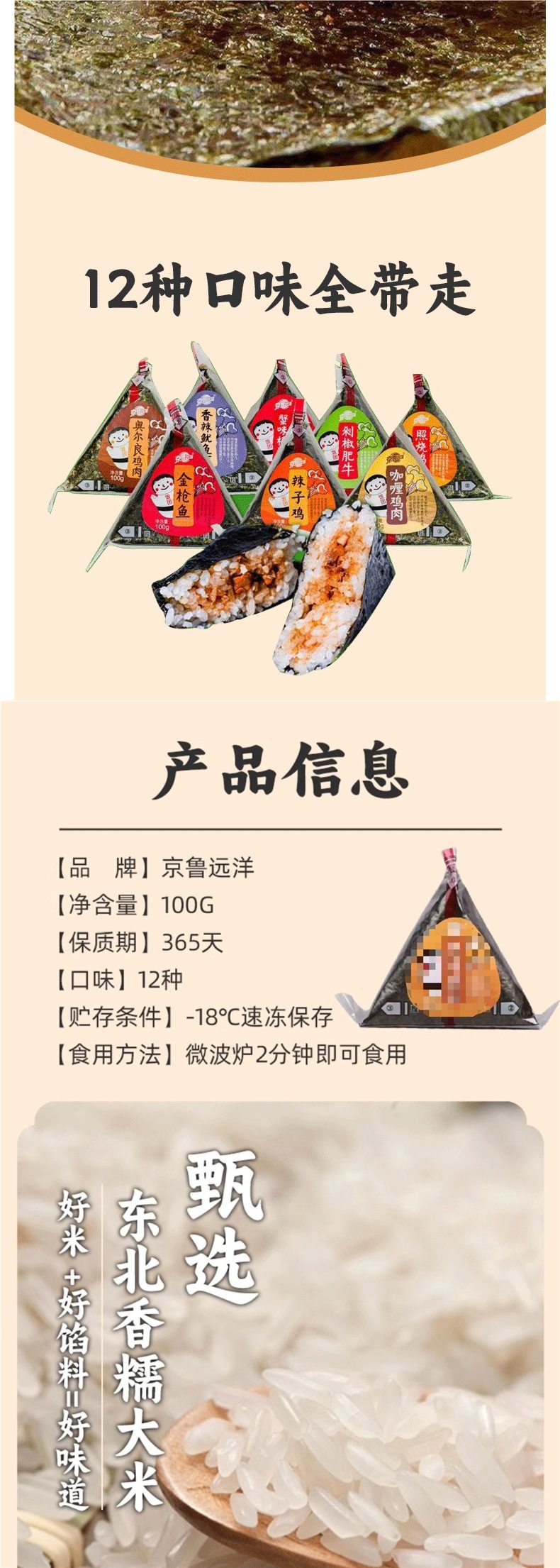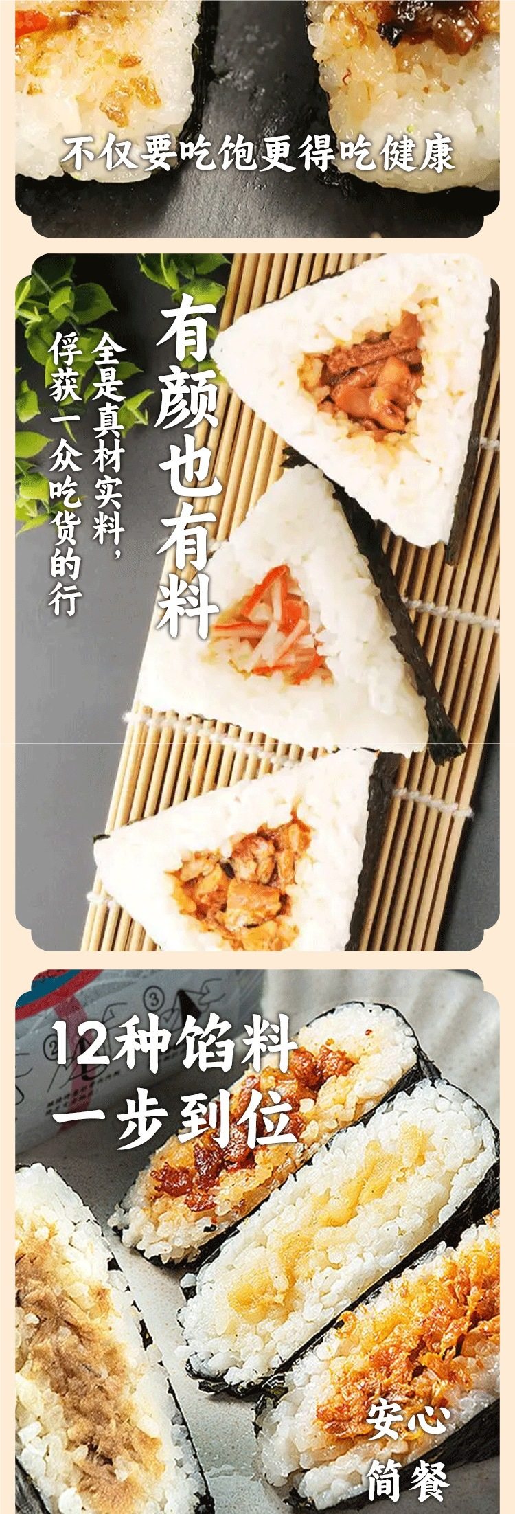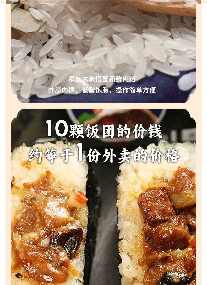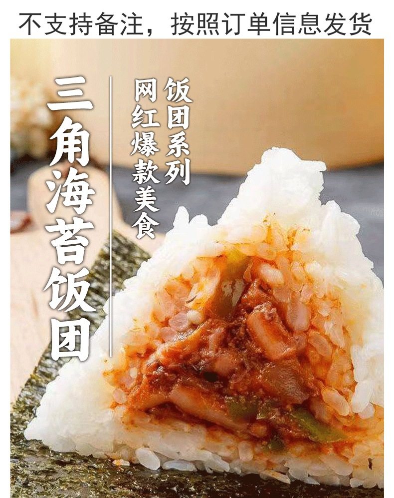 | Packaging specifications | [seaweed sushi] 2 flavors 150g-10 bags (60 pieces),[large quantity] large mouth rice balls-orleans 150g-10 pieces,[large quantity] big mouth rice balls-cheese crab flavor sticks 150g-10 pieces,[large quantity] large mouth rice balls - 5 orleans + 5 cheese crab flavor,[large quantity] big mouth rice balls - tomato beef 150g - 10 pieces,[large quantity] large mouth rice balls - 5 orleans + 5 tomato beef,[large quantity] big mouth rice balls - bbq flavored shrimps 150g - 10 pieces,[large quantity] large mouth rice balls - 5 flavors 150g - 10 pieces,【manchu-han banquet】14 flavors 100g-14 pieces,[children don’t eat spicy food] teriyaki + aoliang + crispy pine + golden gun + curry 2 each,[recommended by regular customers] teriyaki 4+ orleans 4+ curry 2,[taste] orleans 6 pieces + teriyaki 6 pieces (rating is 3 yuan),[cheap and delicious] (pork chop burger + hong kong burger) 120g*6 pieces,[so delicious] (cheese burger + pork chop burger + hong kong burger) 120g*9 pieces,[thin skin and lots of filling] wufang cake 130g*6 pieces,[fast food freedom] (chicken leg burger + chicken roll) 140g*6 pieces,[taste] orleans 6 pieces + curry 6 pieces,[taste] orleans 6 pieces + tuna 6 pieces,[taste] orleans 6 pieces + crispy egg yolk 6 pieces,[taste] 6 orleans + 6 spicy squid,[beef flavor] 6 pieces of black pepper beef + 6 pieces of red braised beef,[taste] orleans 6 pieces + red bean paste 6 pieces,[halal rice balls] orleans 6 pieces + chopped pepper beef 6 pieces,[like spicy food] chopped pepper + spicy + black pepper beef + black pepper chicken + spicy chicken 2 each,[no chicken] 2 each of tuna + crispy egg yolk + beef + squid + crab meat,[just eat chicken] orleans + teriyaki + curry + black pepper chicken + cumin chicken 2 each,[bbq flavor] orleans + teriyaki + cumin + black pepper chicken + black pepper beef 2 each,[shao mai breakfast] purple rice shaomai 800g (16 pieces) + sanding shaomai 800g (16 pieces),[quick breakfast] cheese hot dog sticks 195g-3 bags (9 sticks in total),[full of filling and delicious] rice burger-teriyaki chicken steak 150g-10 pieces,[full of filling and delicious] rice burger-curry chicken 150g-10 pieces,[full of filling and delicious] rice burger-2 flavors 150g-10 pieces,Triangular rice balls - orleans chicken 100g - 10 pieces,Triangular rice balls-tuna 100g*10 pieces,Triangular rice balls-teriyaki chicken steak 100g*10 pieces,Triangular rice balls-crispy egg yolks 100g*10 pieces,Triangular rice balls-curry chicken 100g*10 pieces,Triangular rice balls-crab meat salad dressing 100g*10 pieces,Triangular rice balls-spicy diced squid 100g*10 pieces,Triangular rice balls-black pepper beef 100g*10 pieces,Triangular rice balls-cumin chicken 100g*10 pieces,Triangular rice balls-black pepper chicken 100g*10 pieces,Triangular rice balls-red braised beef 100g*10 pieces,Triangular rice balls-chopped pepper beef 100g*10 pieces,Triangular rice balls-spicy chicken 100g*10 pieces,Triangular rice balls-red bean paste 100g*10 pieces,[do not shoot] activity introduction: 20 15% off +30 20% off +60 25% off +120 30% off (10 rice ball sets),[large quantity] large mouth rice balls - crispy egg yolks 150g - 10 pieces,[large quantity] large mouth rice balls - 5 orleans + 5 crispy egg yolks |