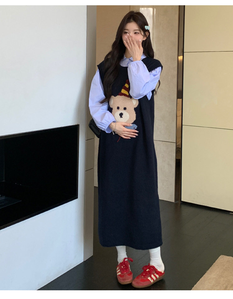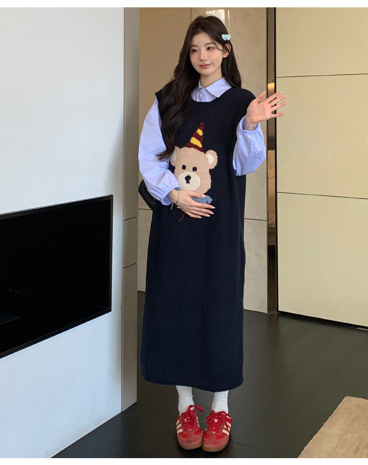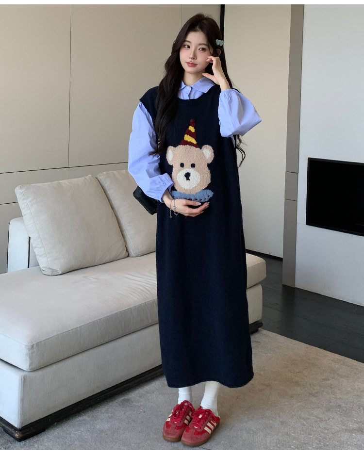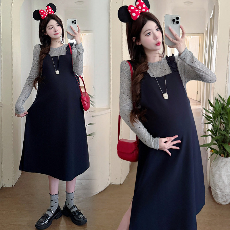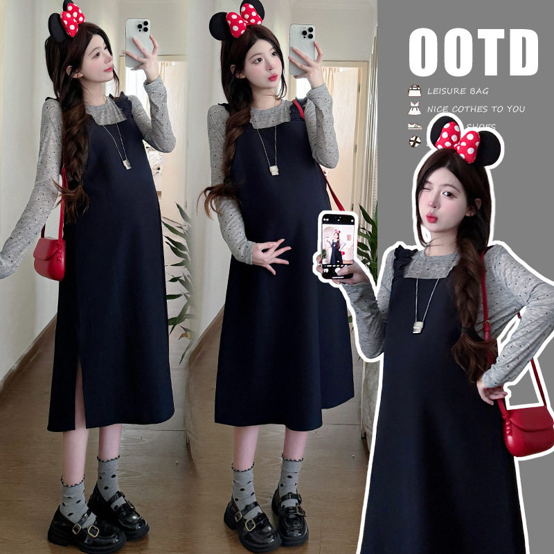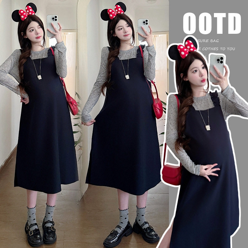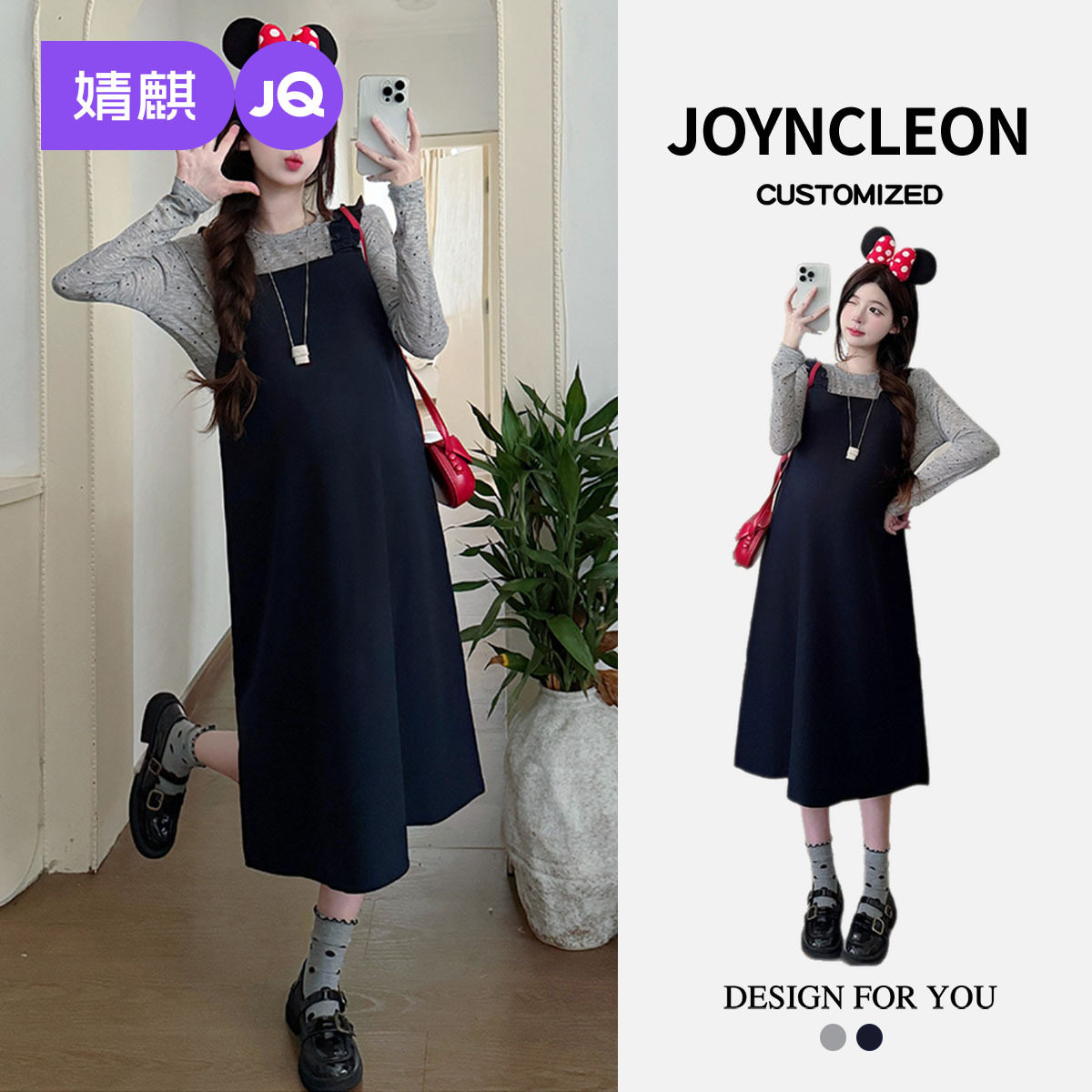 Jingqi Maternity Dress Set New Stylish Casual Loose Bear Suspender Skirt Shirt Two-Piece Set
