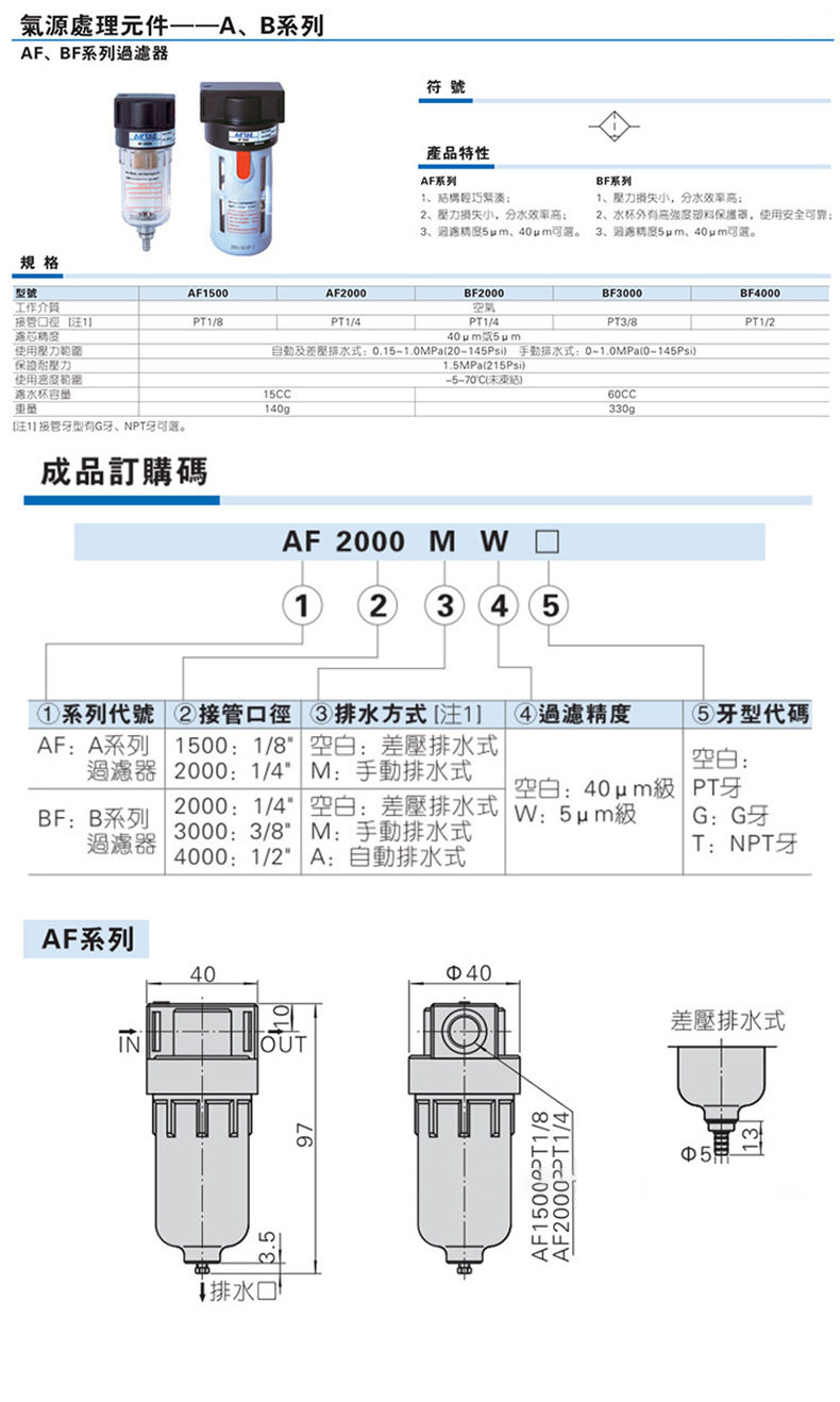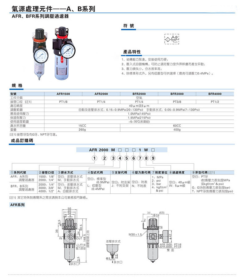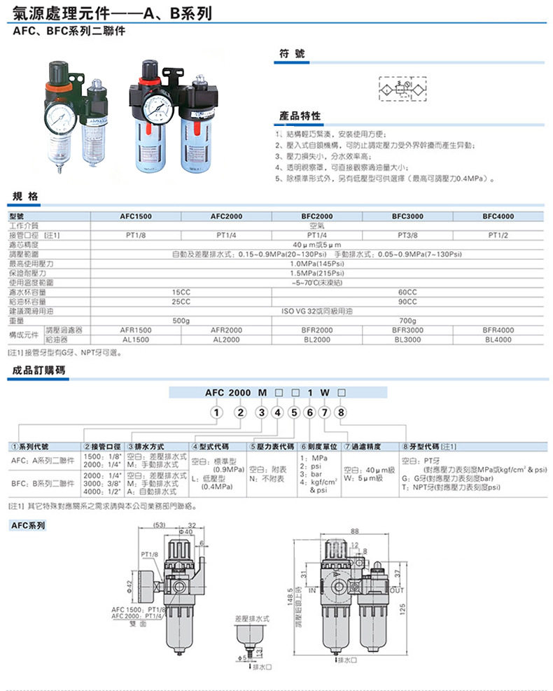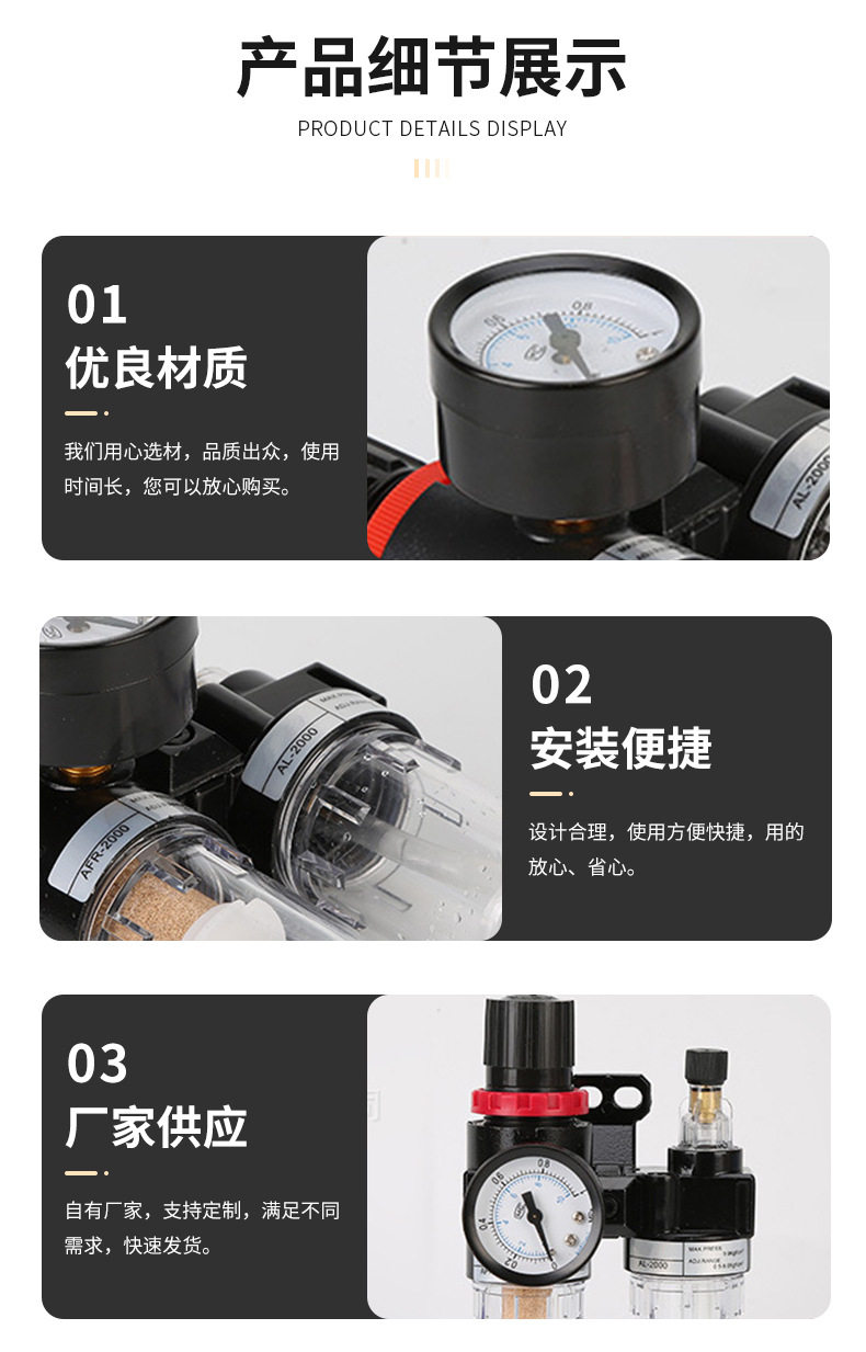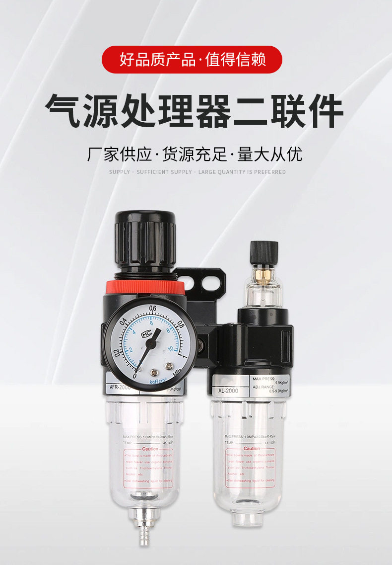 | Product specifications | Two-piece afc2000 fiber filter element,Two-piece afc2000 copper filter element,Triple piece ac2000 fiber filter element,Triple piece ac2000 copper filter element,Pressure regulating filter afr2000 fiber filter element,Pressure regulating filter afr2000 copper filter element,Pressure regulating valve ar2000,AF2000,Af2000 copper core,AL2000,Al2000 copper core |
