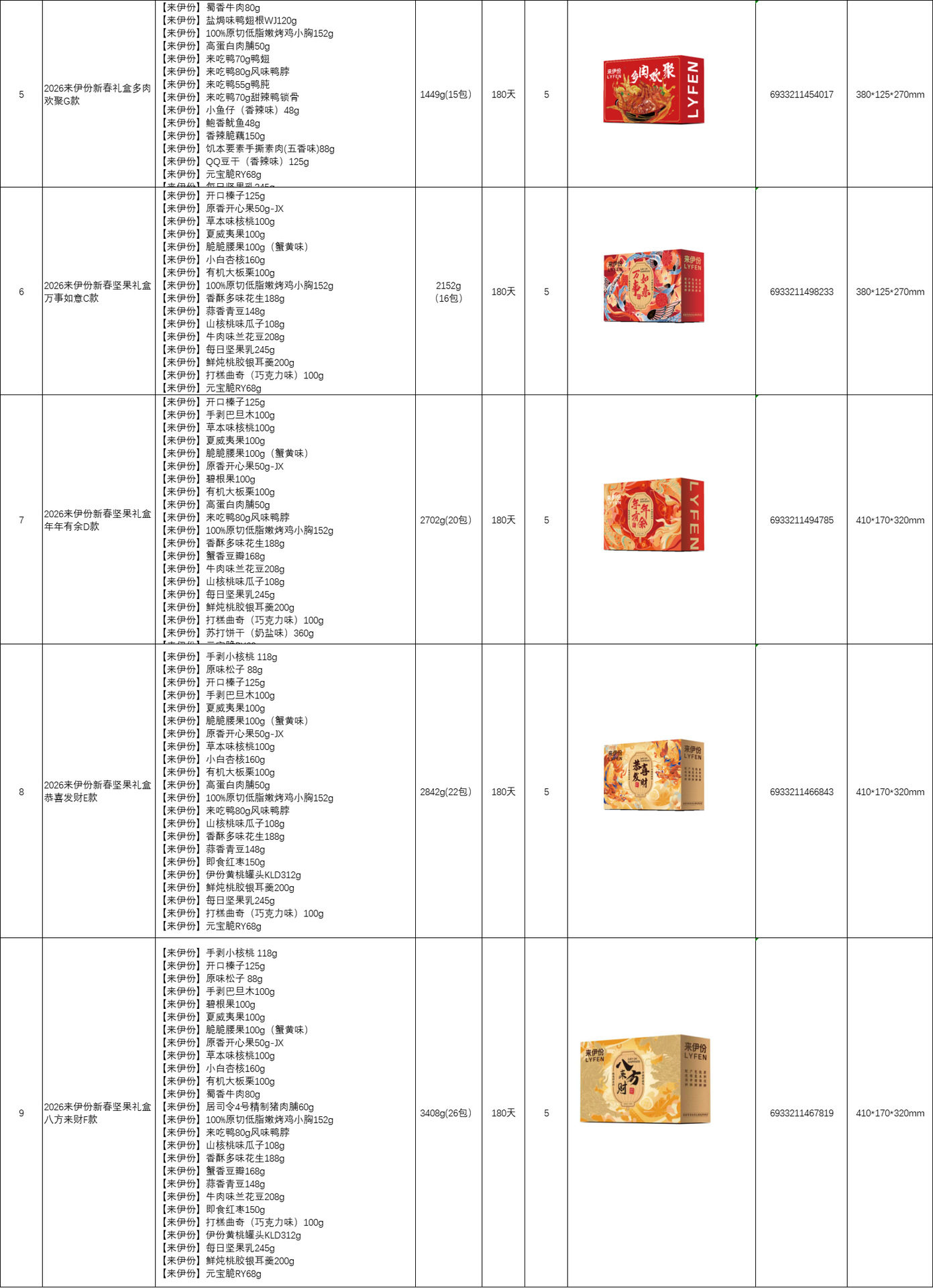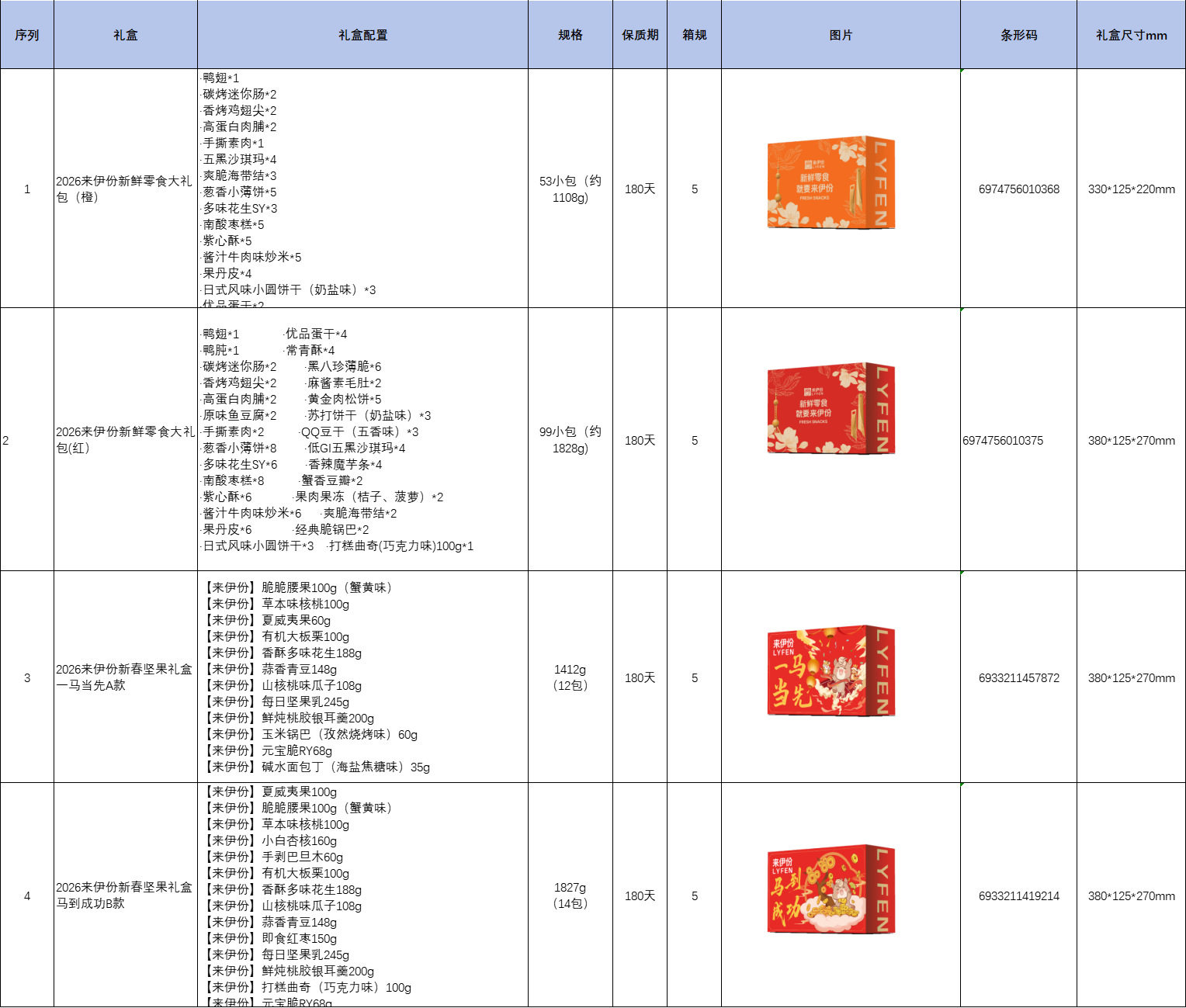 | Packaging specifications | 2026 laiyifen fresh snacks gift pack (orange),2026 laiyifen fresh snacks gift pack (red),2026 laiyifen new year nut gift box takes the lead in type a,2026 laiyifen new year nut gift box instant success model b,2026 laiyifen new year gift box succulent gathering g style,2026 laiyifen new year nut gift box all the best c style,2026 laiyifen new year nuts gift box more than enough every year d style,2026 laiyifen new year nut gift box gong xi fa cai e style,2026 laiyifen new year nut gift box bafanglaicai f style |