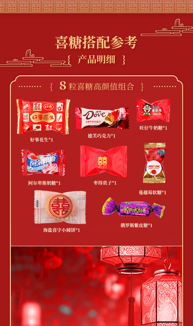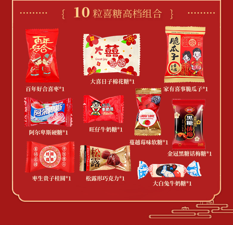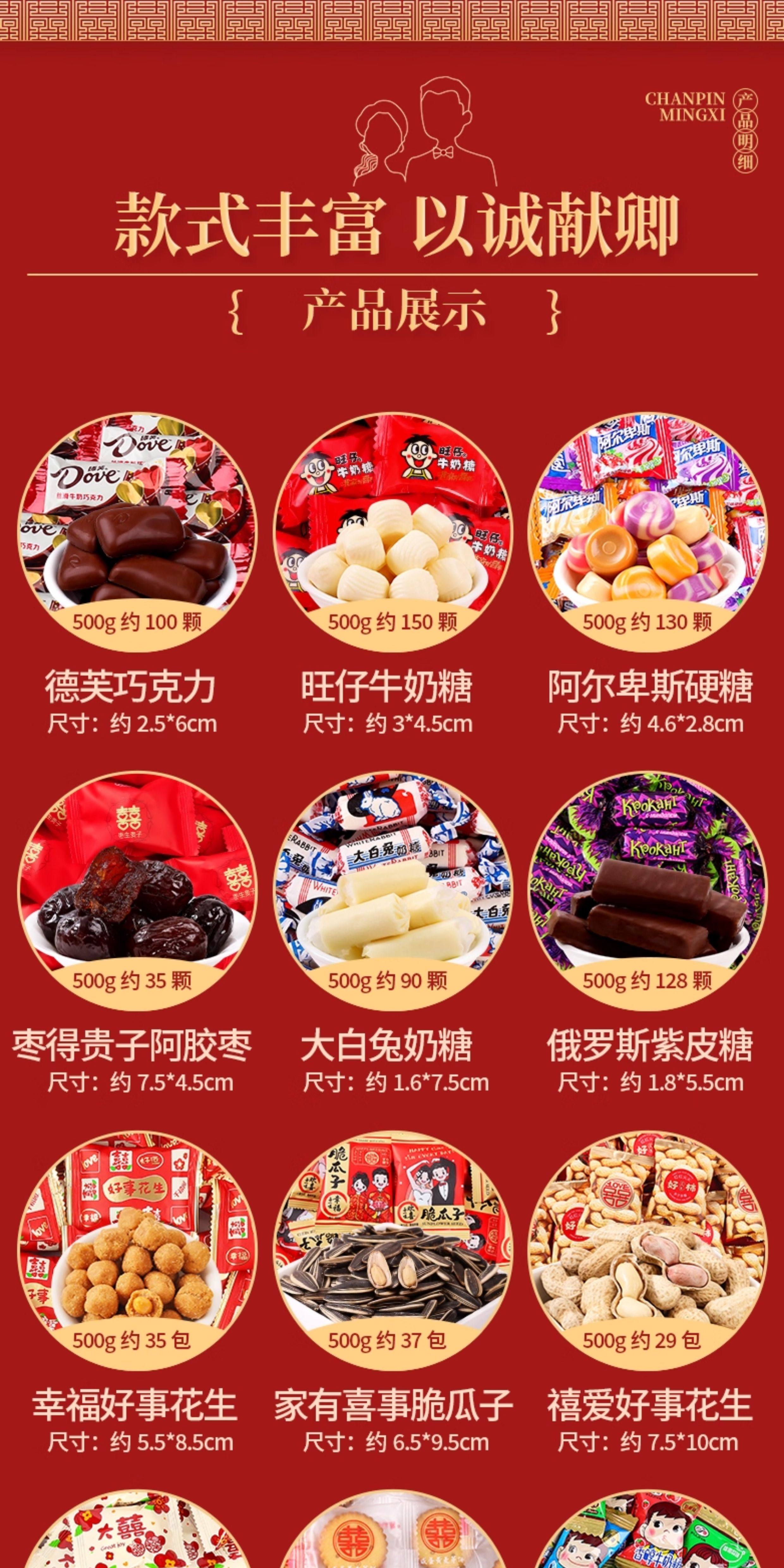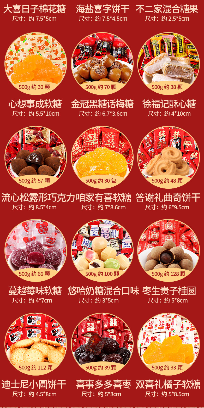 | Packaging specifications | Wedding candy-haohe xizao 500g [about 30 pieces],Wedding candy-multi-brand mixed candy 500g [package a],Wedding candy-double happiness early baby 500g [about 36 pieces],Wedding candy-wangzai milk candy 500g [about 145 pieces],Wedding candy-new packaging dove chocolate 500g [about 100 pieces],Wedding candy-happiness and goodness peanuts 500g [about 35 packs],Wedding candy-alpine hard candy mix 500g [about 130 pieces],Wedding candy-white rabbit milk candy 500g [about 90 pieces],Wedding candy-russian kdv purple sugar 500g [about 70 pieces],Wedding candy-fujia mixed candy 500g [about 120 pieces],Wedding candy-jia you xi shi crispy melon seeds 500g [about 37 packs],Wedding candy-xinxiangshi orange gummy candy 500g [about 29 pieces],Wedding candy-multi-brand mixed candy 500g [package b],Wedding candy-multi-brand mixed candy 500g [package c],Wedding candy-jubilee love shelled good peanuts 500g [about 29 packs],Wedding candy-marshmallows for the big day 500g [about 65 pieces],Wedding candy-happy events duoduo xizao 500g [about 36 pieces],Wedding candy-pre-child cheese dates 500g [about 35 pieces],Wedding candy - zaosheng guizi longan happy fruit 500g [about 115 pieces],Wedding candy-double happiness honey flavored twist 500g [about 66 pieces],Wedding candy-hsu fu chi heart shaped gummy candy 500g [about 56 pieces],Wedding candy-mei hao time tangerine peel plum cake 500g [about 50 pieces],Wedding candy - happy events prune preserved fruit 500g [about 55 pieces],Wedding candy-xile mei shao chen pi sour date cake 500g [about 42 pieces],Wedding candy-fugui man yuan dried longan 500g [about 110 pieces],Wedding candy - yoha milk candy mixed flavor 500g [about 100 pieces],Wedding candy-alpine hard candy 500g [about 130 pieces],Wedding candy-golden crown brown sugar plum candy 468g [about 68 pieces],Wedding candy-cranberry snowflake crispy 500g [about 42 pieces],Wedding candy-truffle shaped chocolate 500g [about 90 pieces],Wedding candy - joyful praline nougat 500g [about 40 pieces],Wedding candy-colorful bean chocolate 500g [about 40 packs],Wedding candy-disney round cookies 500g [about 112 packs],Wedding candy-almond cookies chocolate 500g [about 42 pieces],Wedding candy-happy events fruit juice gummies 500g [about 50 pieces],Wedding candy-xiwang chocolate cookies 500g [about 43 packs],Wedding candy-tiantian happy peanuts 500g [about 33 packs],Wedding candy-happy peanuts peanut crispy 500g [about 48 pieces],Wedding candy-good luck hard candy 500g [about 68 pieces],Wedding candy-lava heart ice cream chocolate 500g [about 39 pieces],Wedding candy-happy cranberry qq gummies 500g [about 66 pieces],Wedding candy-bear chocolate filled cookies 500g [about 42 packs],Wedding candy-almond egg cake 500g [about 44 pieces],Wedding candy - blessing peanut crispy 500g [about 46 pieces],Wedding candy - wedding day wheat crispy pastry 500g [about 75 pieces],Wedding candy-multi-layer chocolate wafer biscuits 500g [about 52 pieces],Wedding candy-huanxi cranberry snowflake crispy 500g [about 38 packs],Wedding candy-cookie cookies for the bride and groom 500g [about 41 pieces],Wedding candy-egg roasted biscuits 500g [about 52 packs],Wedding candy-my family happy juice gummy candy 500g [about 32 packs],Wedding candy-hao shi xiang peanut crispy candy 500g [about 45 pieces],Wedding candy-we are getting married gummies 500g [about 34 packs],Wedding candy-happy events heart-shaped rice krispie chocolate 500g [about 58 pieces],Wedding candy - small gifts and good luck fish skin peanuts 500g [about 28 packs],Wedding candy-hsu fu chi crispy candy 500g [about 38 pieces],Wedding candy-hsu fuji fruity gummy candy 500g [about 35 packs],Wedding candy-xu fuji love wedding candy 500g [about 100 pieces],Wedding candy-my family youxi pistachios 500g [about 30 packs],Wedding candy-xixi accompanying wafer biscuits 500g [about 85 pieces],Wedding candy-xi word white peach flavored hard candy 500g [about 90 pieces],Wedding candy-taoxi milk crisp candy 500g [about 50 pieces],Wedding candy-my family youxi small round biscuits 500g [about 88 pieces],Wedding candy-we are getting married milk lollipop 500g [about 40 pieces],Wedding candy-chinese red date snowflake crispy 500g [about 36 pieces],Wedding candy-zhanzhan xiqi nougat 500g [about 48 pieces],Wedding candy-strawberry mousse pie snowflake crispy 500g [about 38 pieces],Wedding candy-cranberry gummy candy 500g [about 65 pieces],Wedding candy - big day lollipop 500g [about 38 pieces],Wedding candy-wedding gift snowflake crispy 500g [about 40 pieces],Wedding candy-haohe cranberry snowflake crispy 500g [about 38 packs],Wedding candy-white peach flavored juice lollipops 500g [about 40 pieces],Wedding candy-gui zai perfect longan flavor gummy candy 500g [about 50 pieces],Wedding candy - freeze-dried strawberry milk crisp 500g [about 58 pieces],Wedding candy - orange good luck fruit hard candy 500g [about 94 pieces],Wedding candy - thick coconut filled hard candy 500g [about 74 pieces],Wedding candy-xiyue chocolate 500g [about 95 pieces],Wedding candy-my family youxi fruit gummies 500g [about 48 pieces],Wedding candy-haohe xian melon seeds 500g [about 38 packs],Wedding candy-xiti wedding fruit juice gummies 500g [about 29 pieces],Wedding candy-hazelnut chocolate spread heart cookies 500g [about 38 pieces],Wedding candy-[xitian fubao] 9 assorted candies mixed pack 500g,Wedding candy-[housewarming] 9 assorted candies mixed pack 500g,Wedding candy-happy colorful bean crispy gummy candy 500g [about 26 packs],Wedding candy-my family youxi red bean milk crisp 500g [about 54 pieces],Wedding candy-hao shiduoduo crispy candy 500g [about 45 pieces],Wedding candy-good things are born wedding cake 500g [about 80 packs],Wedding candy-salted egg yolk flavor good luck rice crackers 500g [about 68 packs],Wedding candy - jubilee happens crispy corners 500g [about 35 packs],Wedding candy-good things happen nut peanut crisp 500g [about 46 pieces],Wedding candy-dragon and phoenix with crisp