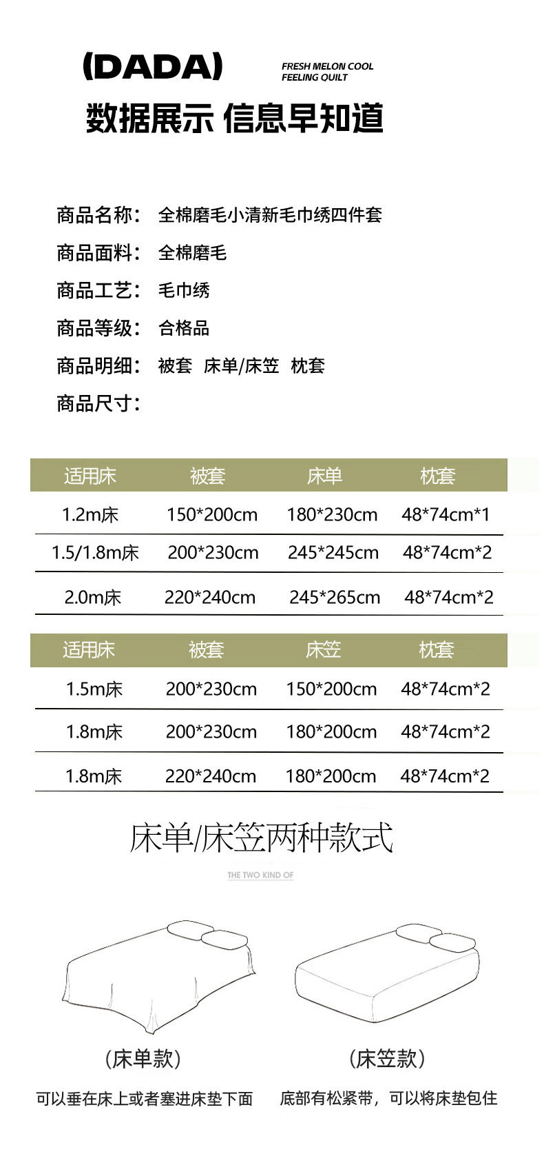 | Size specifications | [sheet style] 0.9 three-piece set - quilt cover 150x200,[sheet style] 1.2 three-piece set - quilt cover 150x200,【bed sheet style】1.5m four-piece bedding set - duvet cover 200x230 cm,【bed sheet style】1.8m four-piece bedding set - duvet cover 200x230 cm,[bed sheets] 2.0 four-piece set - quilt cover 220x240,【fitted sheet style】1.5m four-piece bedding set - duvet cover 200x230 cm,【fitted sheet style】1.8m four-piece bedding set - duvet cover 200x230 cm,[fitted sheet] 1.8 four-piece set - quilt cover 220x240 |
