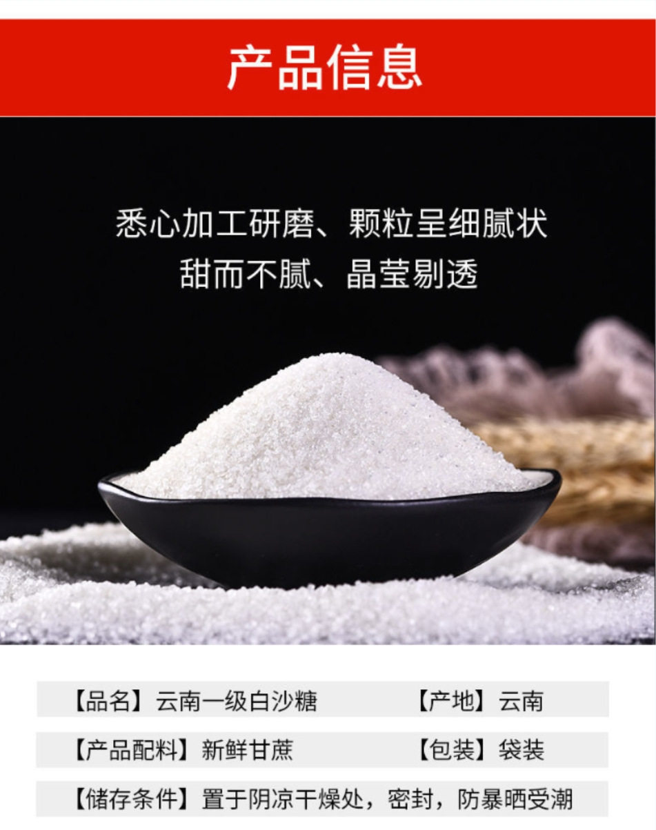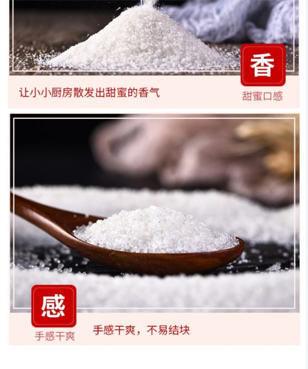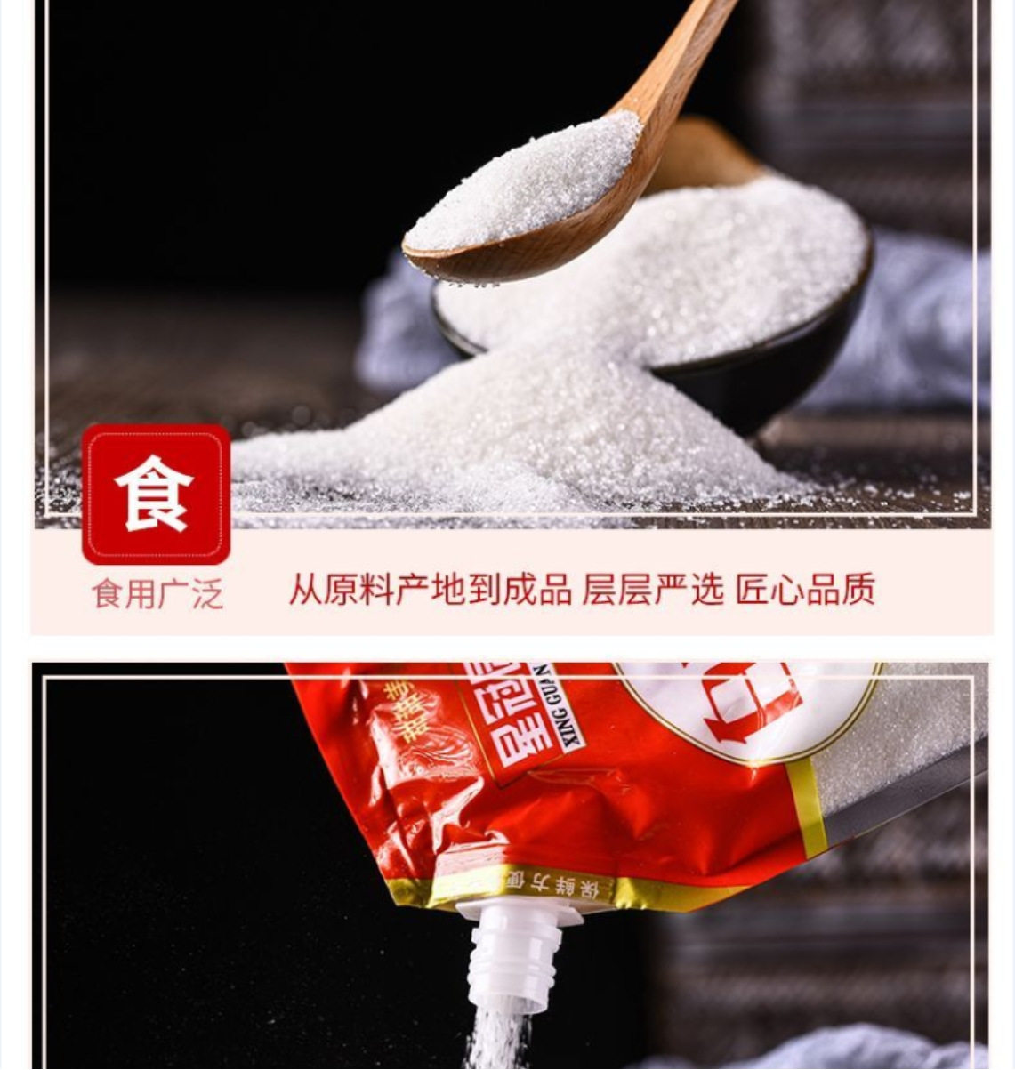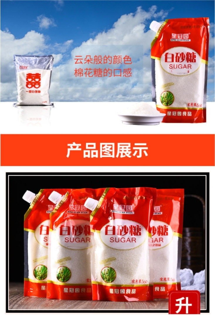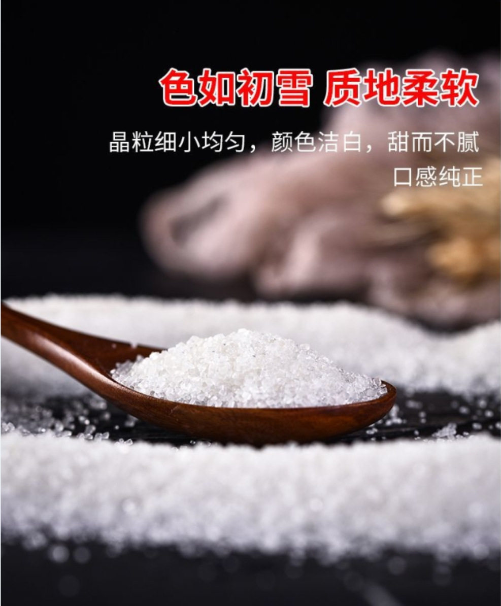 | Packaging specifications | Supermarket selected white sugar with spout and spiral mouth 350g*1 bag,Supermarket selected white sugar with spout and spiral mouth 500g*3 bags,Supermarket selected exquisite bagged white sugar 200g*3 bags,Supermarket selected white sugar with spout and spiral mouth 500g*1 bag,Supermarket selected exquisite bagged white sugar 100g*1 bag,Supermarket selected white sugar with spout and spiral mouth 350g*3 bags |