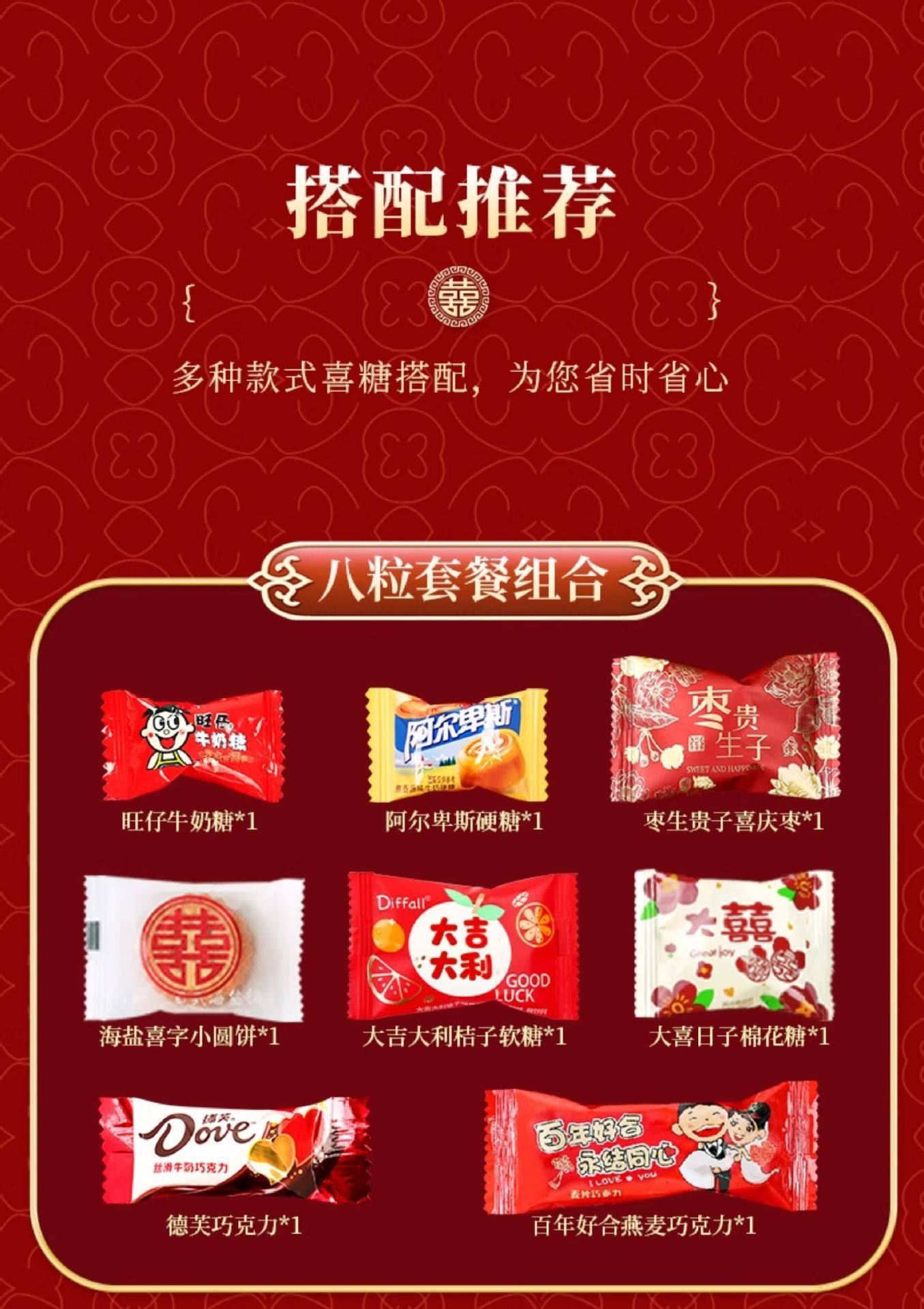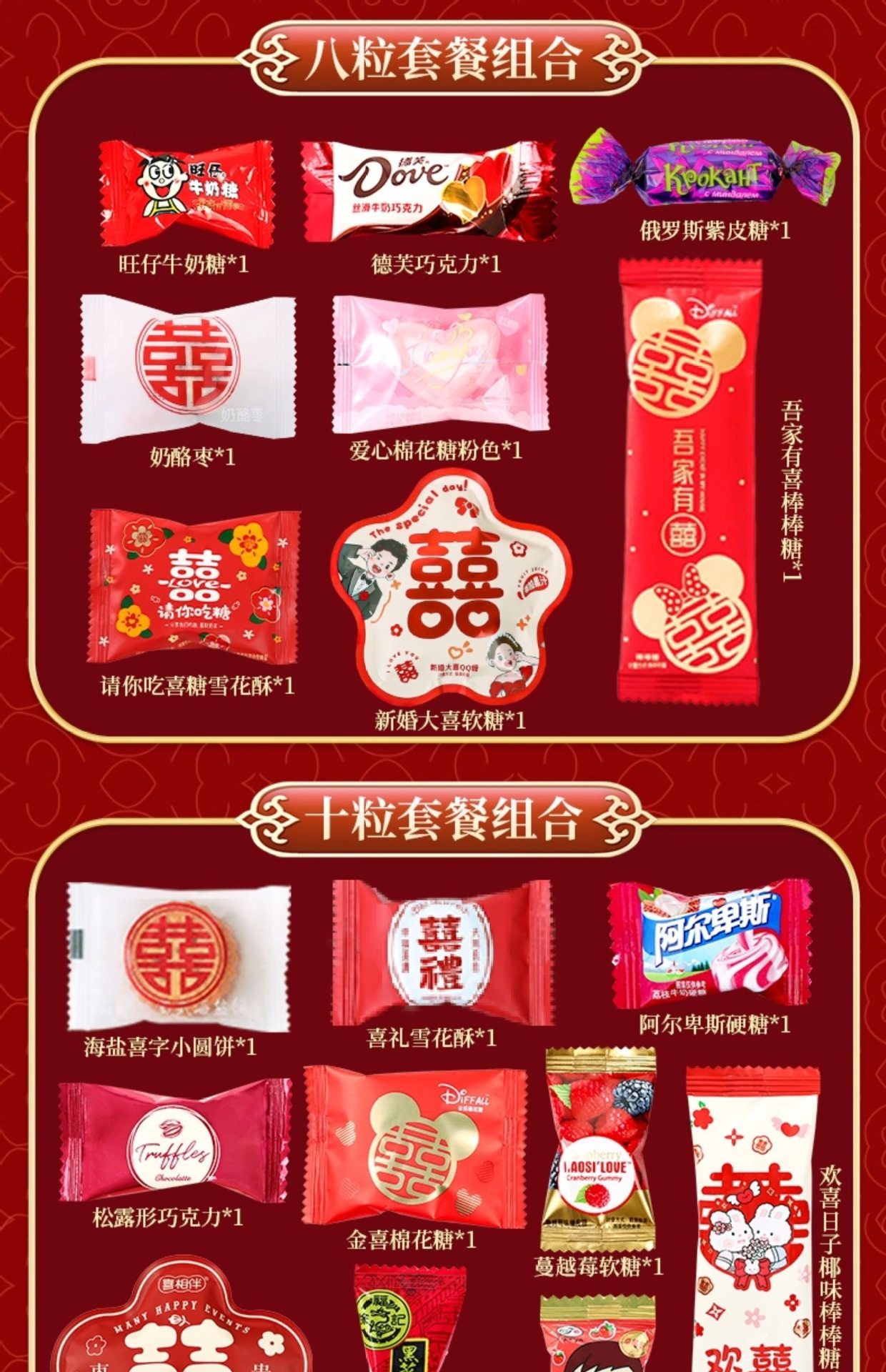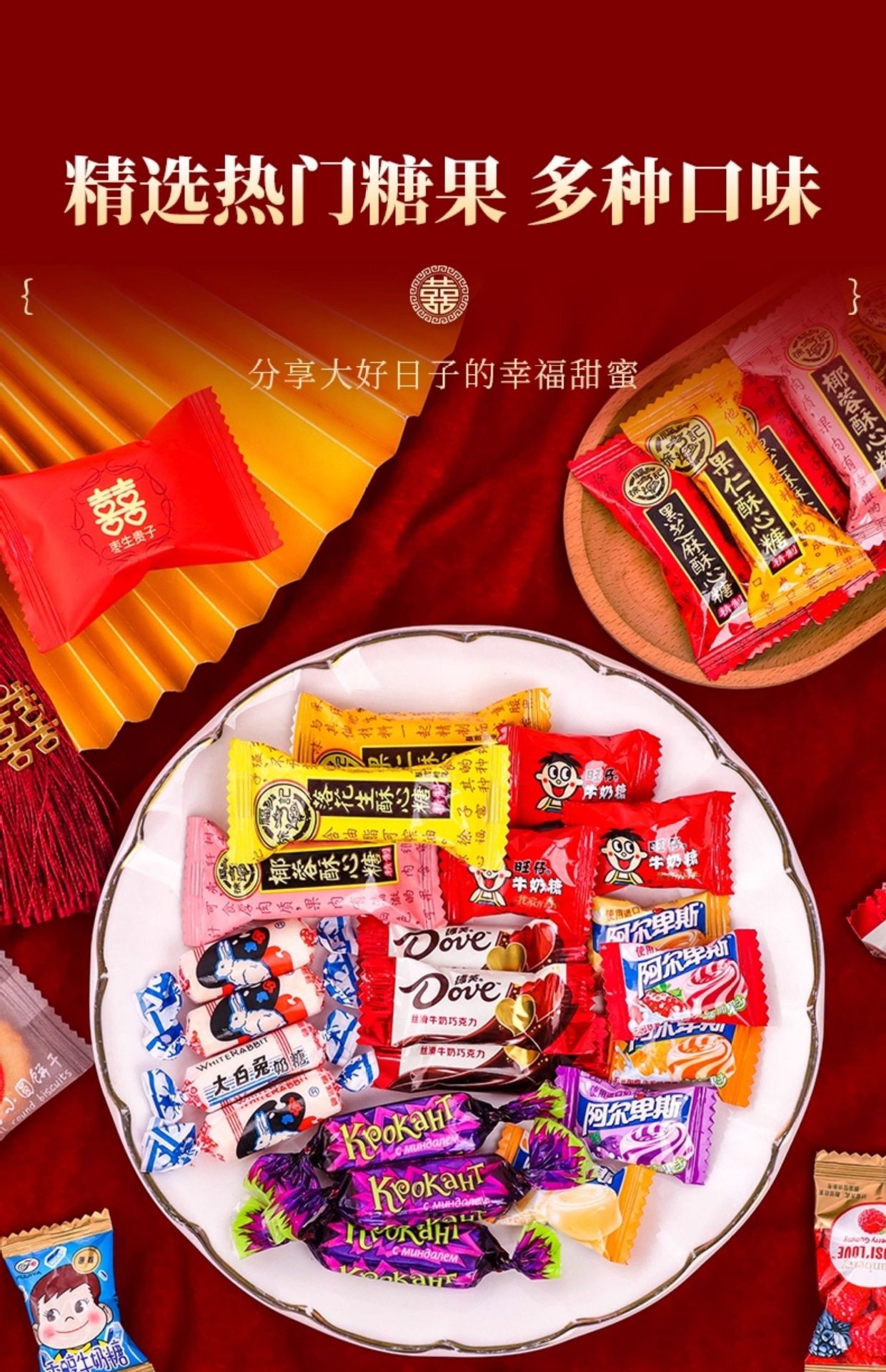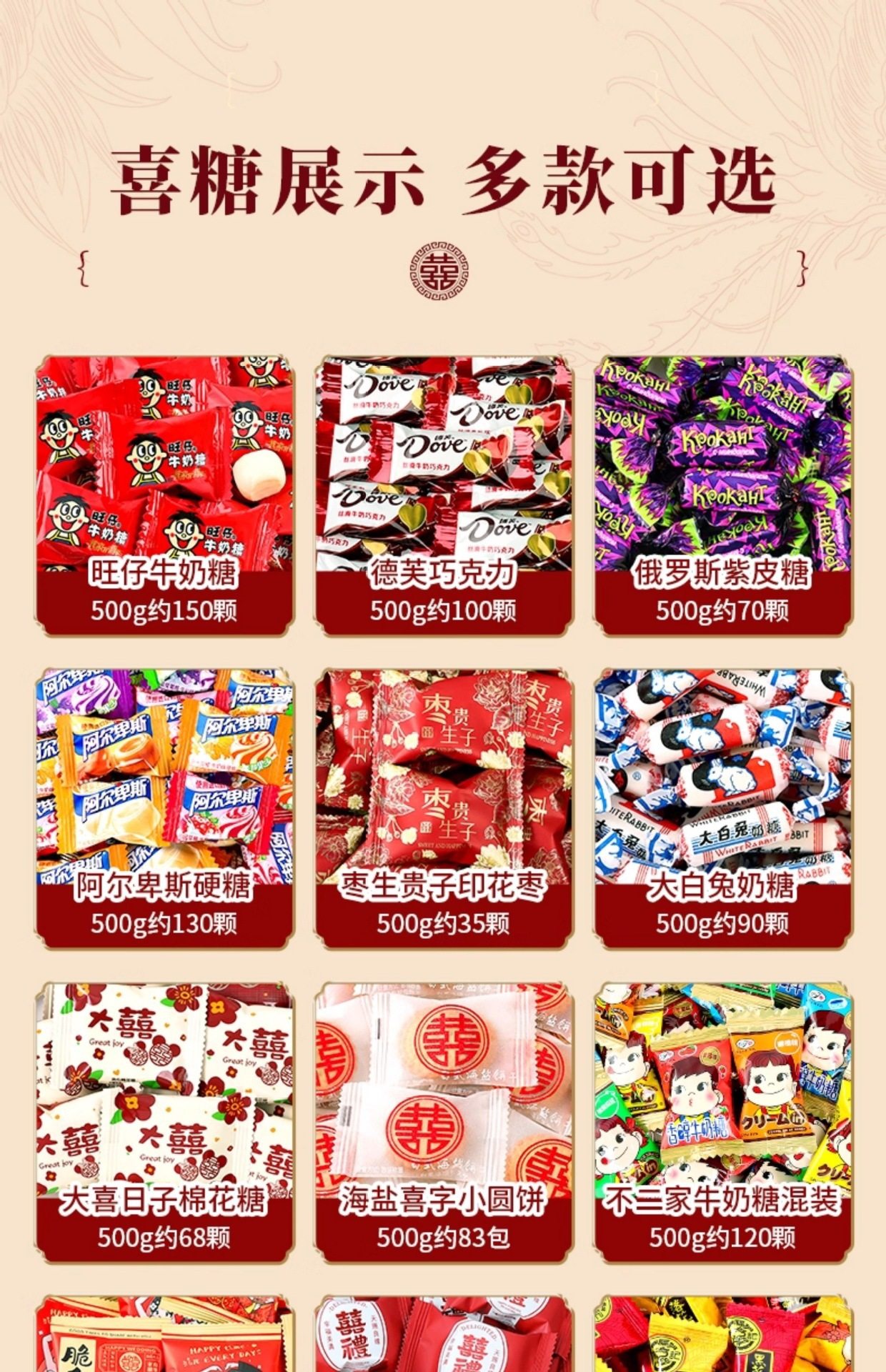 | Packaging specifications | Happy events candy [please see the big picture for size] - 10 brands of candy mixed 500g [random flavors],Happy events and candies [please see the big picture for size] - zaosheng guizi double happiness dates 500g [about 38 pieces],Happy event candy [please see the big picture for size] - wangzai milk candy 500g [about 150 pieces],Happy event candy [please see the big picture for size] - dove chocolate 500g [about 100 pieces],Happy event candy [please see the large picture for size] - hard candy mixed flavor 500g [about 130 pieces],Happy event candy [please see the big picture for size] - white rabbit milk candy 500g [about 90 pieces],Happy events and candies [please see the large picture for size] - purple sugar imported from russia 500g [about 70 pieces],Happy events and candies [please see the large picture for size] - hsu fu chi crispy candies 500g [about 38 pieces],Candy for happy events, please see the large picture for size - 囍character caramel flavored hard candy 500g, about 130 pieces,Happy event candy [please see the big picture for size] - big day marshmallows 500g [about 68 pieces],Happy events and candies [please see the large picture for size] - japanese-style sea salt pancakes with happy characters 500g [about 83 pieces],Happy events candy [please see the big picture for size] - happy events white peach flavor hard candy 500g [about 100 pieces],Wedding candy [please see the big picture for size] - malisin 500g [about 160 pieces],Wedding candy [please see the big picture for size] - wedding gift cranberry snowflake crispy 500g [about 40 pieces],Happy event candy [please see the big picture for size] - haohe oatmeal chocolate 500g [about 38 pieces],Happy event candy [please see the large picture for size] - cranberry gummy candy 500g [about 68 pieces],Happy event candy [please see the big picture for size] - love marshmallow pink 500g [about 73 pieces],Wedding candy [please see the big picture for size] - truffle-shaped chocolate 500g [about 90 pieces],Happy events and candies [please see the big picture for size] - haohe ejiao xizao 500g [about 30 pieces],Happy event candy [please see the big picture for size] - my family youxi lollipop 500g [about 43 pieces],Happy events and candies [please see the big picture for size] - lucky orange flavored gummies 500g [about 61 pieces],Happy event candy [please see the big picture for size] - we are getting married strawberry swiss candy 500g [about 70 pieces],Wedding candy [please see the big picture for size] - treat you to wedding candy milk fu snowflake crispy 500g [about 40 pieces],Happy event candy [please see the big picture for size] - fujiya milk candy mixed pack 500g [about 120 pieces],Happy event candy [please see the big picture for size] - yoha milk candy 500g [about 100 pieces],Happy events and candies [please see the big picture for size] - hsu fu chi peanut crispy candies 500g [about 50 pieces],Happy event candy [please see the big picture for size] - hsu fu chi heart-shaped gummy candy 500g [about 60 pieces],Happy event candy [please see the large picture for size] - jinxi sandwich marshmallow 500g [about 66 pieces],Wedding candy [please see the large picture for size] - sesame, date and walnut 500g [about 60 pieces],Happy event candy [please see the large picture for size] - brown sugar plum sugar 500g [about 54 pieces],Happy event candy [please see the big picture for size] - my family happy event milk candy 500g [about 72 pieces],Happy event candy [please see the big picture for size] - zaosheng guizi cheese dates 500g [about 35 pieces],Wedding candy [please see the big picture for size] - treat you to 500g of wedding candy hard candy [about 53 pieces],Happy event candy [please see the big picture for size] - love chocolate 500g [about 72 pieces],Happy event candy [please see the large picture for size] - water drop chocolate truffles 500g [about 102 pieces],Happy Candy Please see the large picture for size - 囍Cranberry QQ Gummy 500g, about 66 pieces,Happy event candy [please see the big picture for size] - we are getting married hard candy 500g [about 70 pieces],Happy events and candies [please see the large picture for size] - hsu fu chi fruit juice gummies 500g [about 35 packs],Wedding candy [please see the big picture for size] - snowflake crispy for big day 500g [about 43 pieces],Happy event candy [please see the big picture for size] - brand mixed candy 500g [package b],Happy event candy [please see the big picture for size] - brand mixed candy 500g [package c],Happy event candy [please see the big picture for size] - early child flower jujube 500g [about 21 packs],Happy events candy [please see the big picture for size] - good things peanut beans 500g [about 35 packs],Happy events and candies [please see the big picture for size] - wealth and perfection happy fruit 500g [about 112 pieces],Happy events and candies [please see the big picture for size] - happy events melon seeds 500g [about 37 packs],Wedding candy [please see the big picture for size] - yake mixed assorted candies 2.5kg pack [about 310 pieces] (recommended for presentation),Wedding candy [please see the large picture for size] - mixed wedding candy 2.5kg pack [about 260 pieces] (recommended for presentation),Happy events candy [please see the large picture for size] - double happiness peanut happy candy 500g [about 40 pieces],Happy event candy [please see the big picture for size] - my family youxi crispy candies 500g [about 41 pieces],Happy events candy [please see the large picture for size] - happy days gummy candy 500g [about 32 packs],Wedding candy [please see the big picture for size] - wedding nougat 500g [about 50 pieces],Wedding candy [please see the large picture for size] - cranberry peanut nougat 500g [about 48 pieces],Happy events and candies [please see the big picture for size] - happy days wafer biscuits 500g [about 53 packs],Happy event candy [please see the large picture for size] - huatian pe