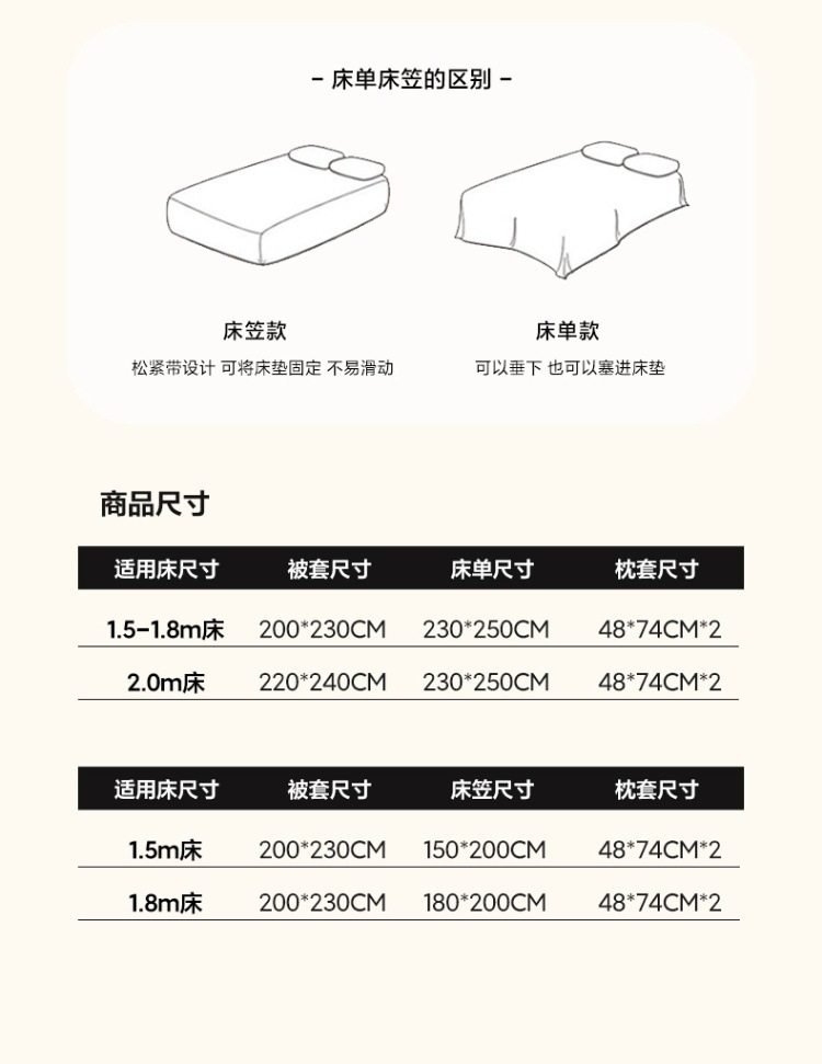 | Size specifications | 150x200cm single quilt cover [double-sided thickened, comfortable for sleeping naked],200x230cm single quilt cover [double-sided thickened, comfortable for sleeping naked],220x240cm single quilt cover [double-sided thickened, comfortable for sleeping naked],1.2m bed [three-piece bed sheet set] - suitable for 150x200cm quilt core,1.5m bed [sheet set of four] - suitable for 200x230cm quilt core,1.8m bed [sheet set of four] - suitable for 200x230cm quilt core,2.0m bed [sheet set of four] - suitable for 220x240cm quilt core,1.5m bed [four-piece fitted sheet set] - suitable for 200x230cm quilt core,1.8m bed [four-piece fitted sheet set] - suitable for 200x230cm quilt core |