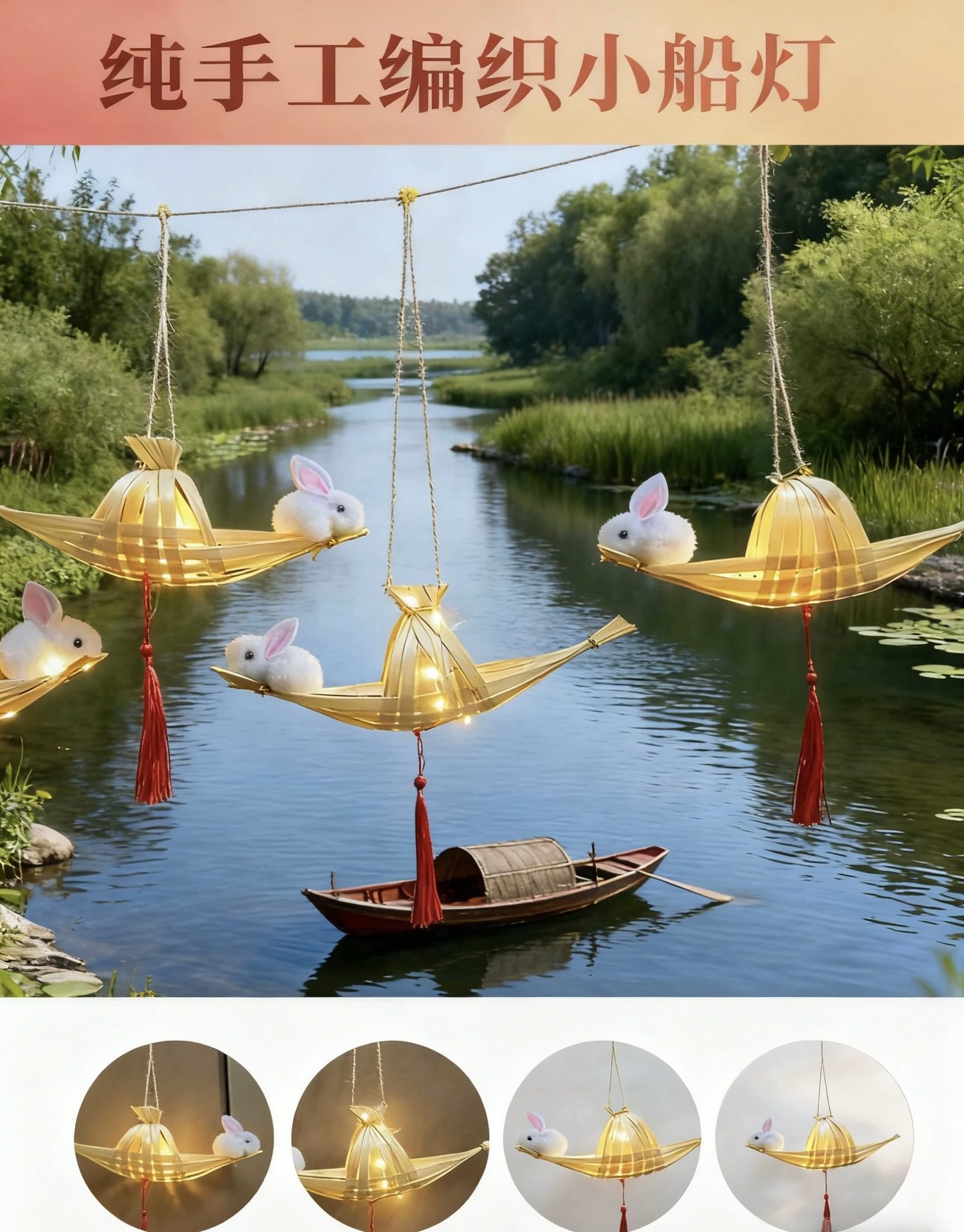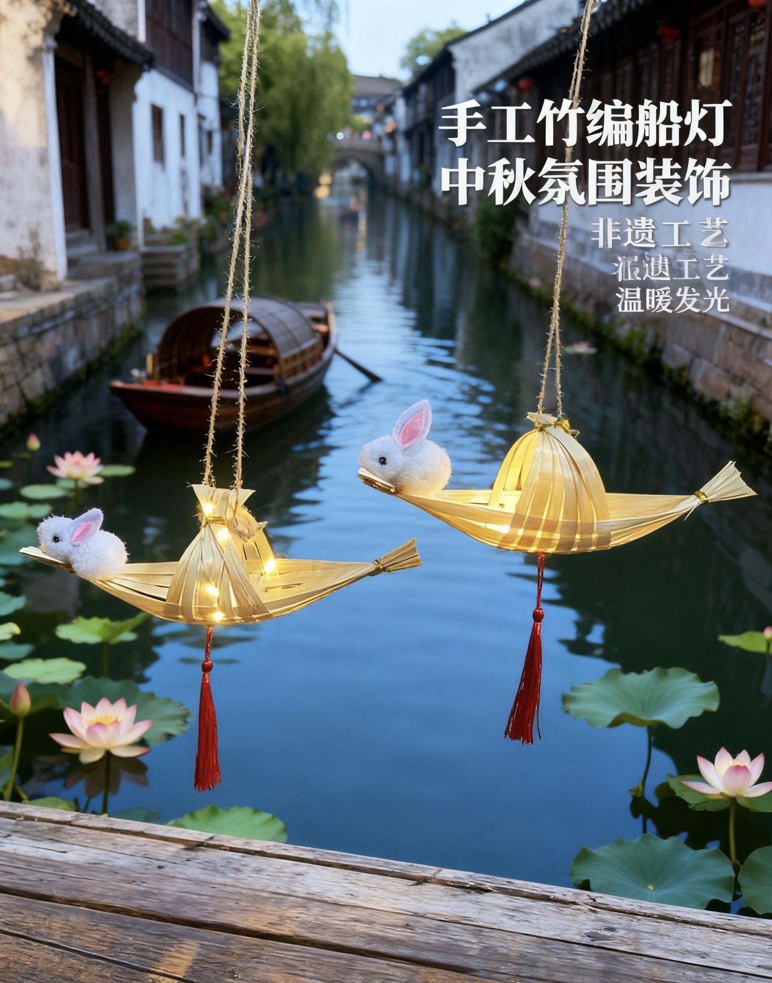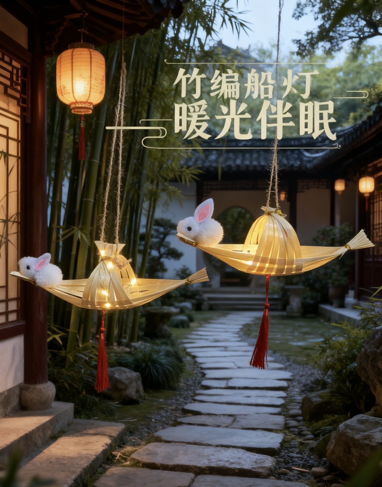 Bamboo Moon Boat Rabbit Lantern Mid-Autumn Festival Chinese Style Lantern Creative Ancient Style Lantern Portable Outdoor Holiday Pendant