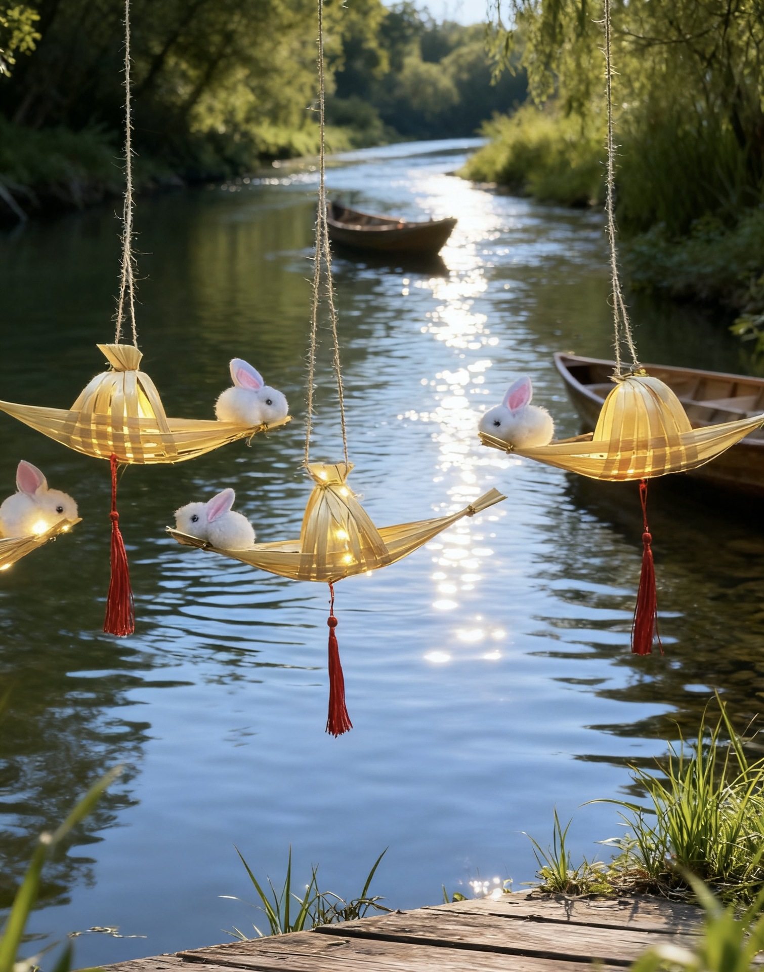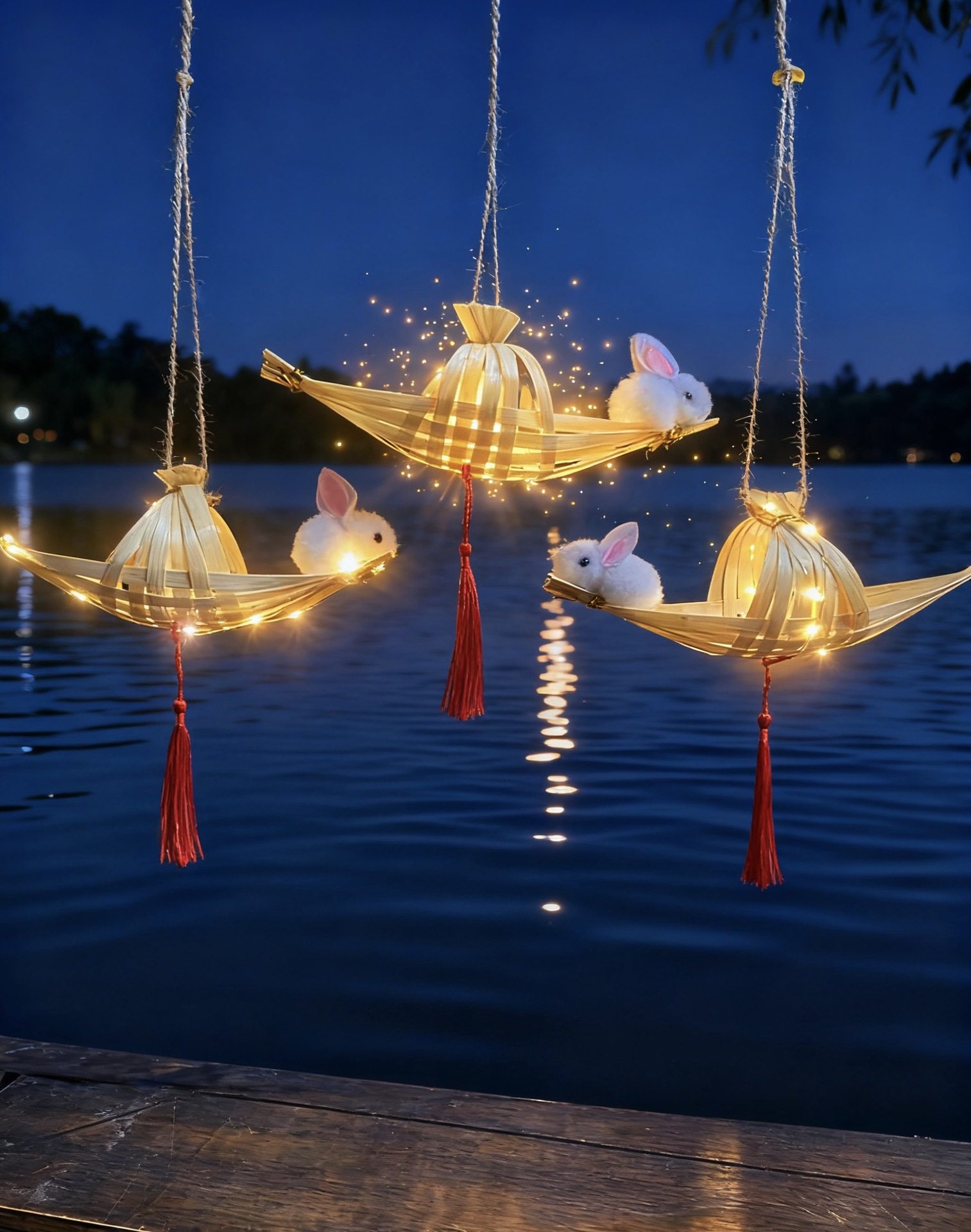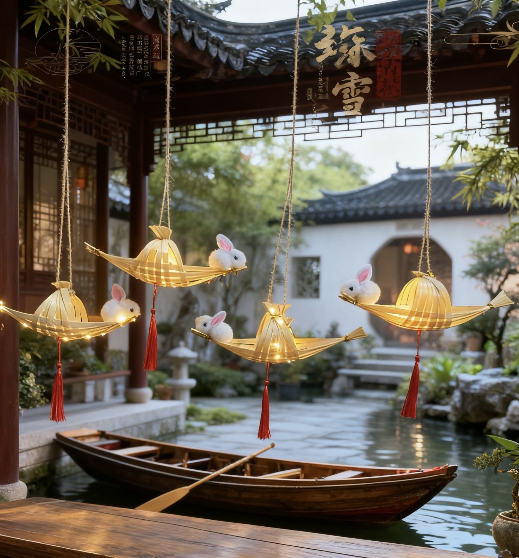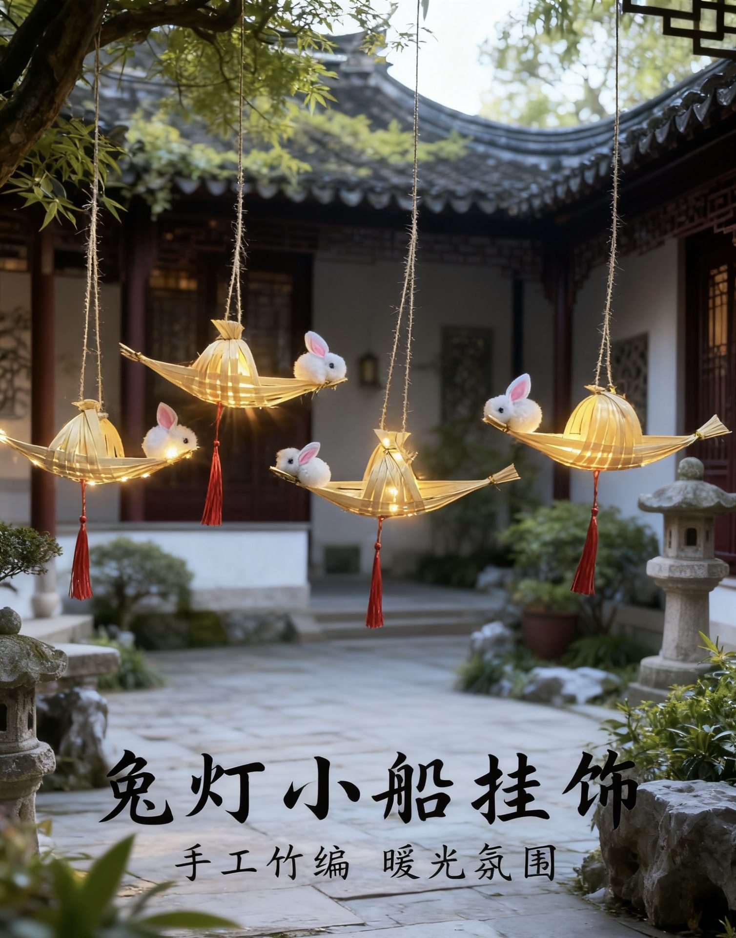 Bamboo Moon Boat Rabbit Lantern Mid-Autumn Festival Chinese Style Lantern Creative Ancient Style Lantern Portable Outdoor Holiday Pendant