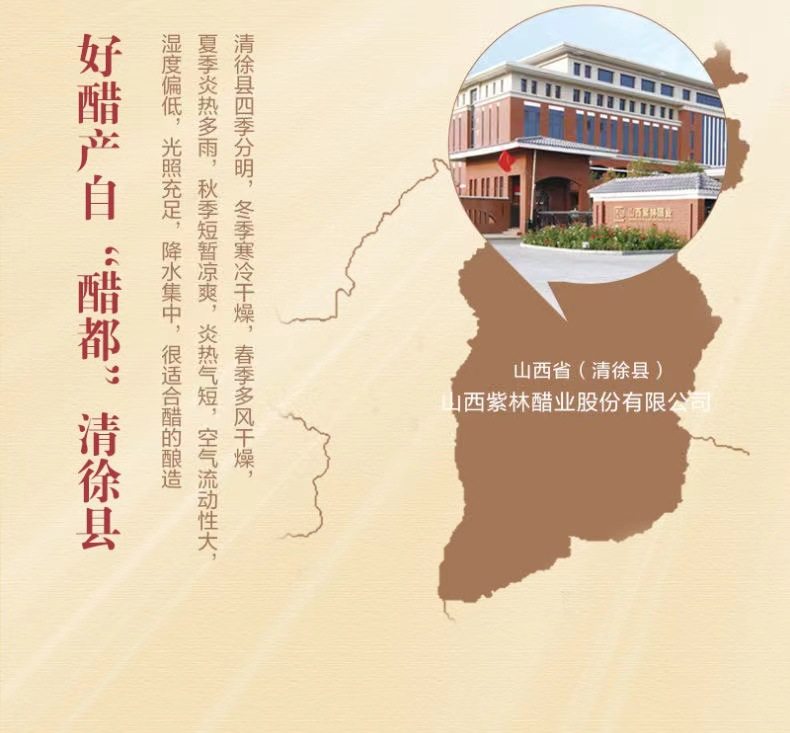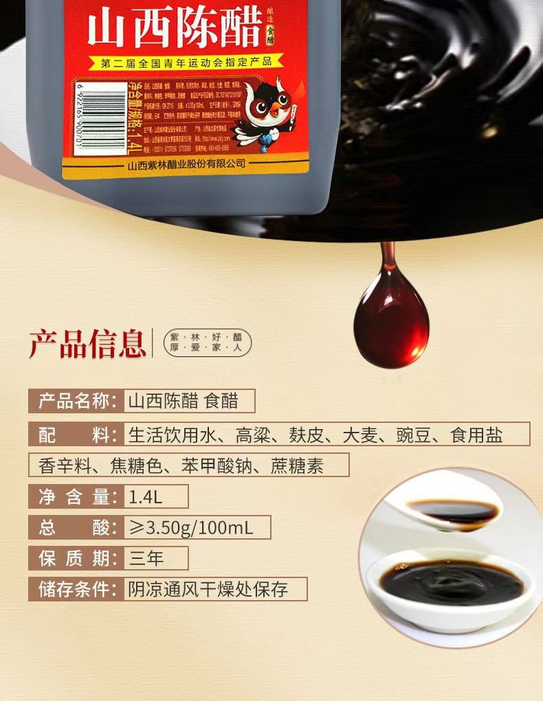 | Packaging specifications | Zilin shanxi mature vinegar 1400ml,Purple forest balsamic vinegar 2000ml,Zilin shanxi mature vinegar 2500ml,Zilin mature vinegar 160ml*3 bottles,Zilin 0 added five-year-old vinegar 1200ml,Shuita jin qingyuan shanxi mature vinegar 800ml,Shuita jin qingyuan shanxi mature vinegar 2300ml |
