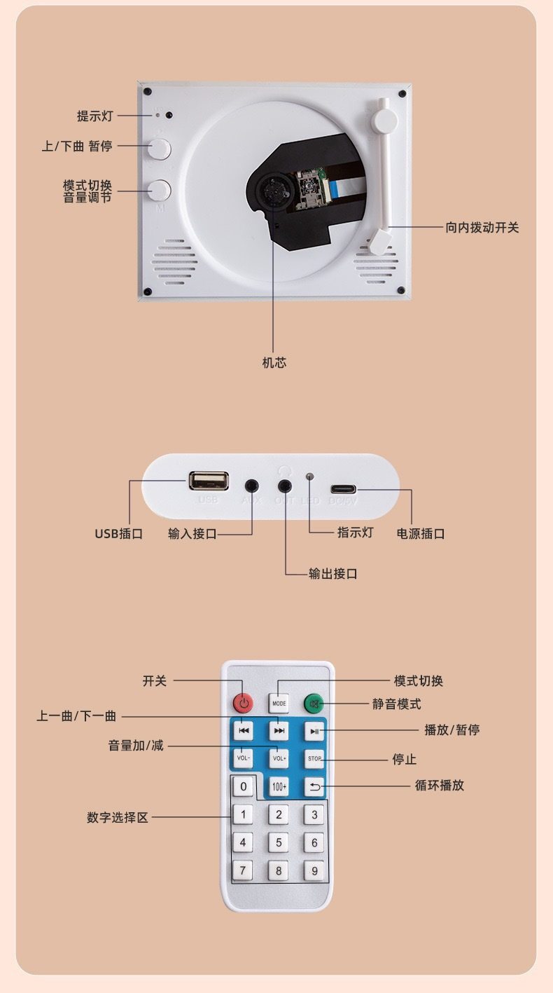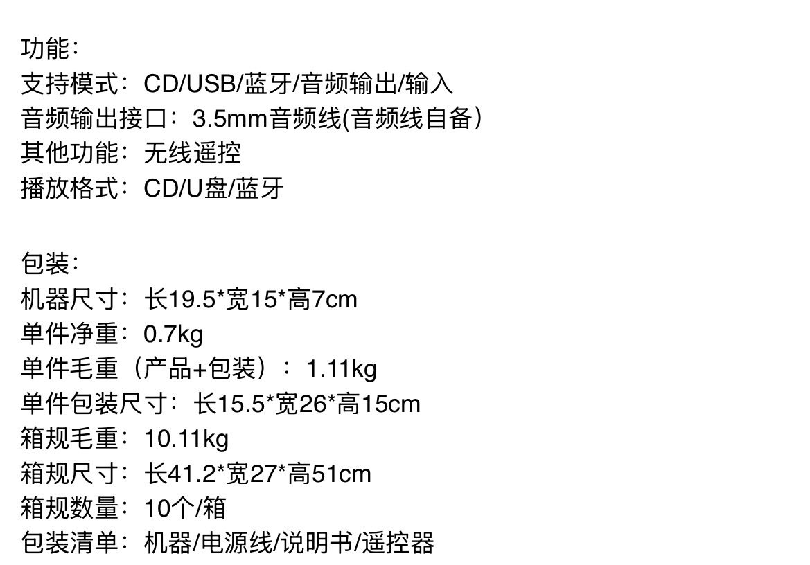 | Package list | Cd player, remote control, audio cable, charging cable, headphone cable, manual |