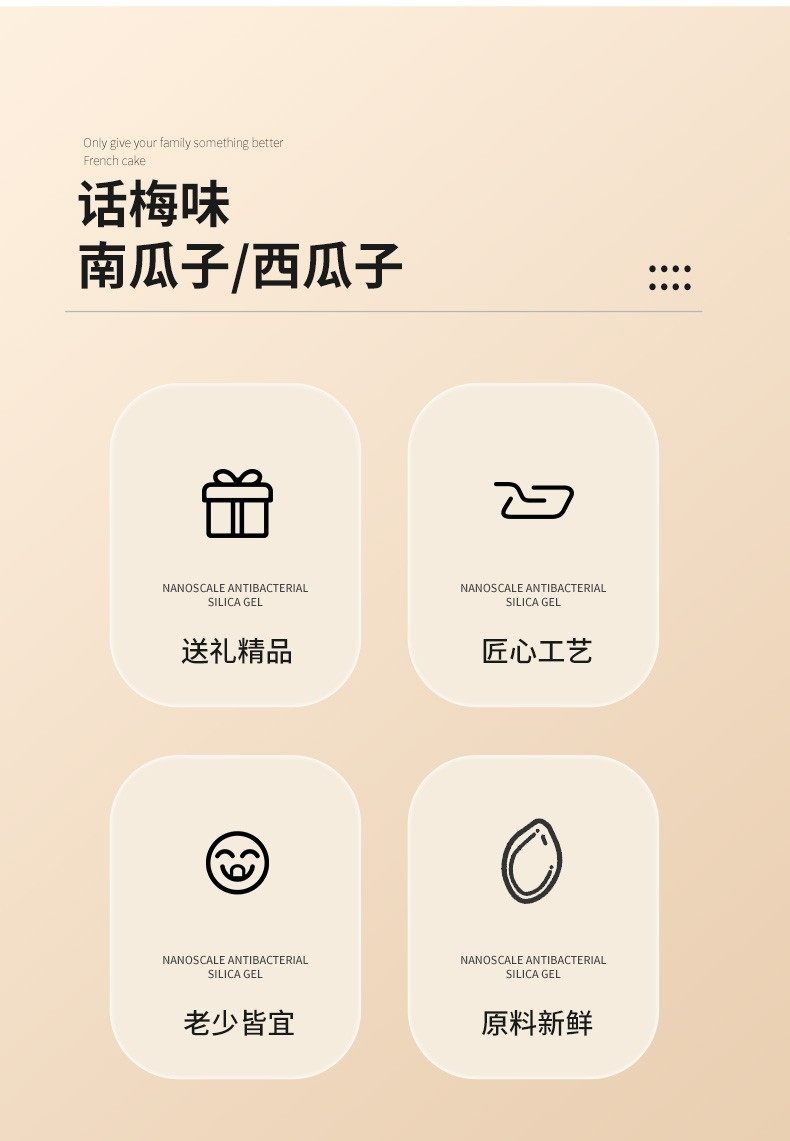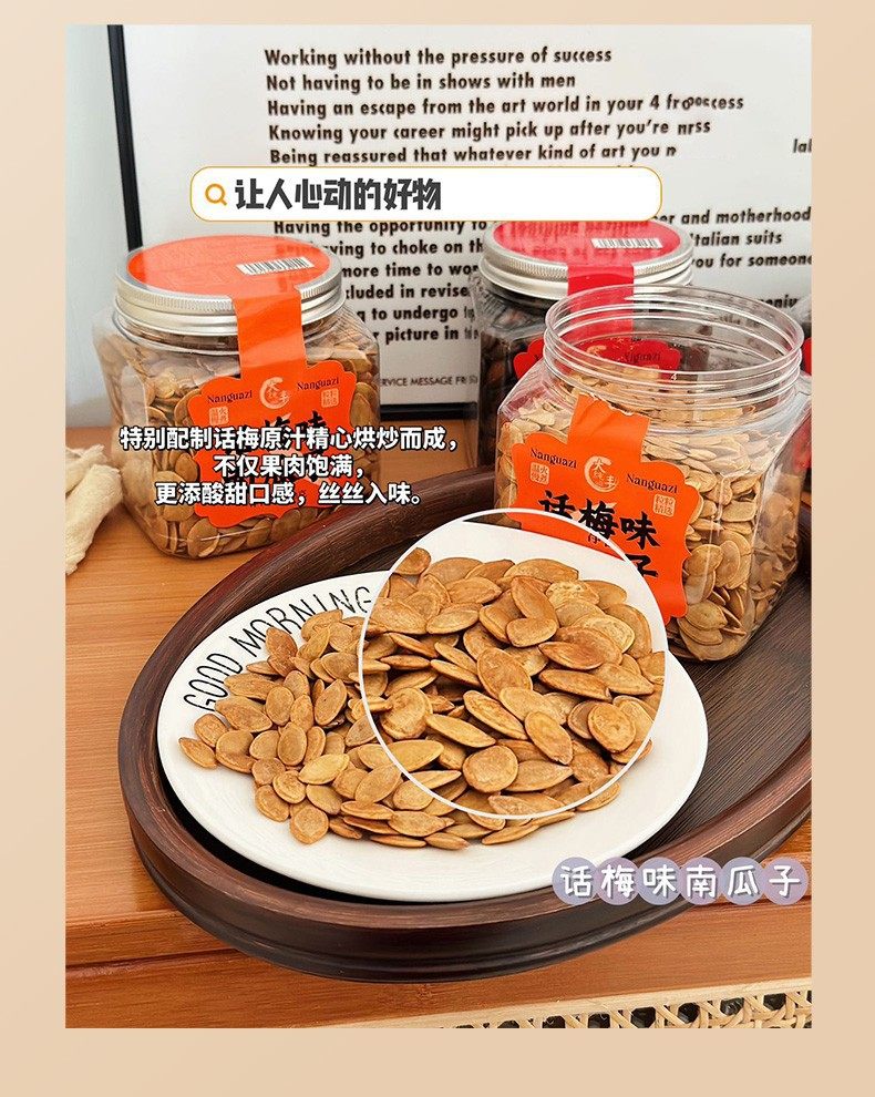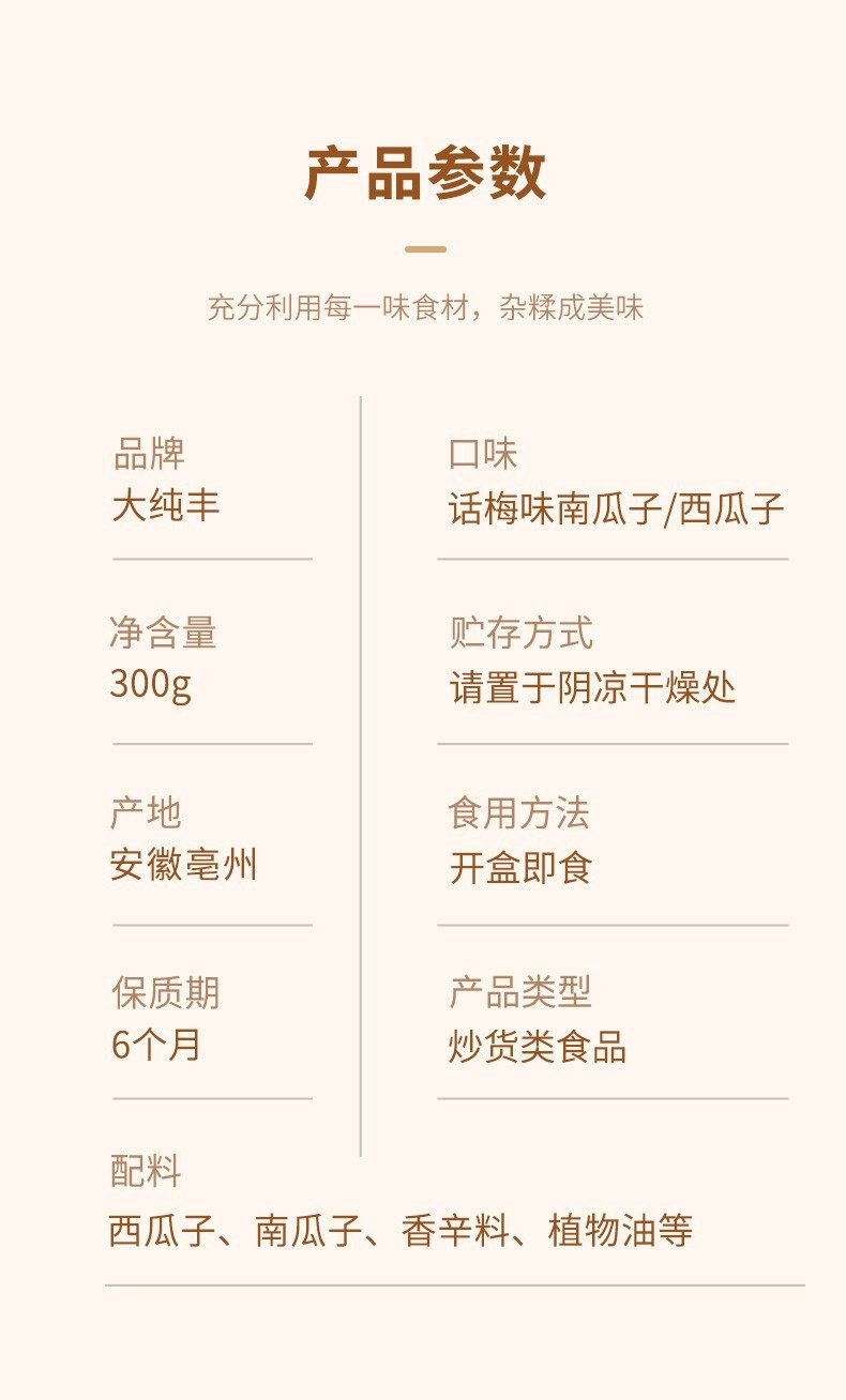 | Taste | Plum flavored watermelon seeds 300g,Plum flavored pumpkin seeds 300g |