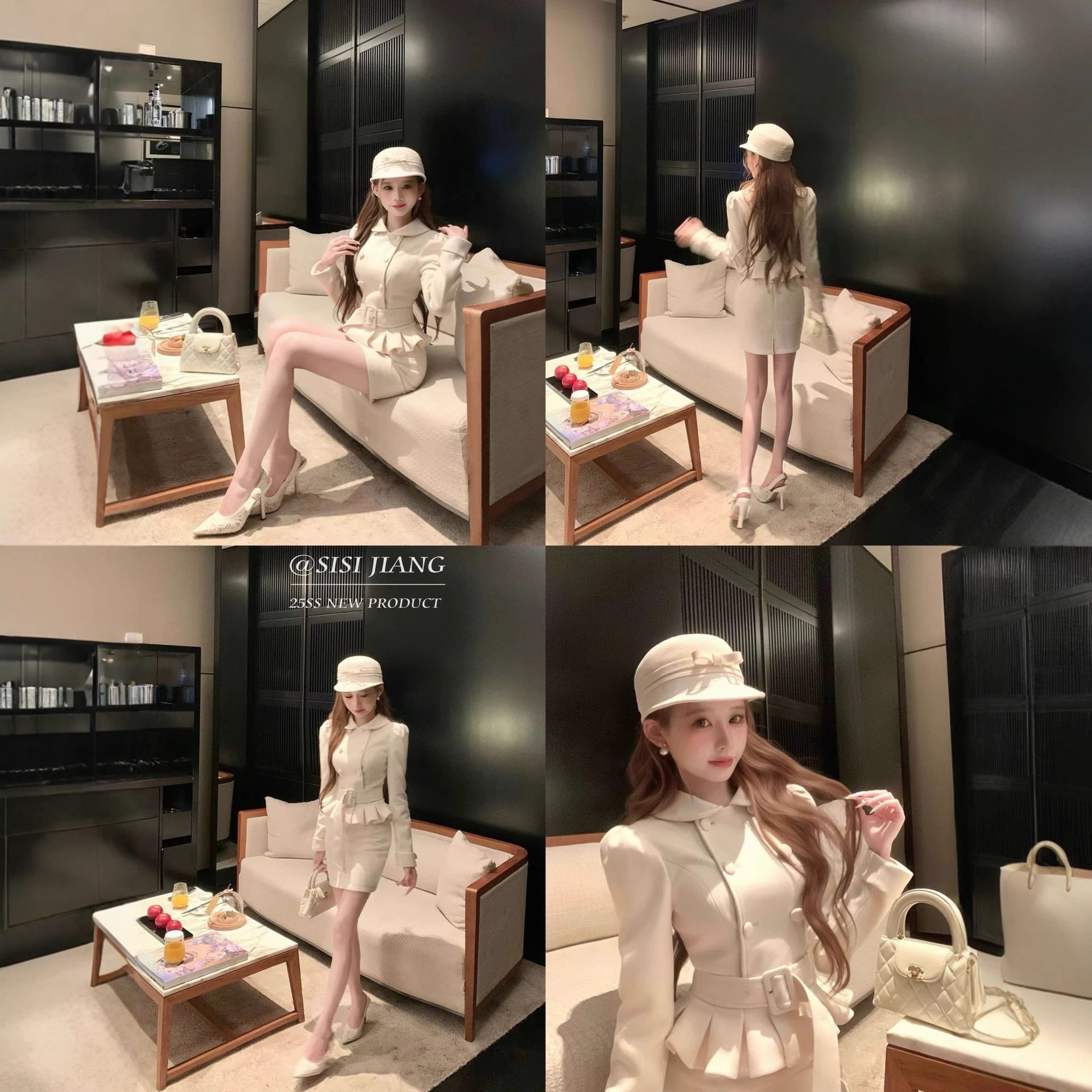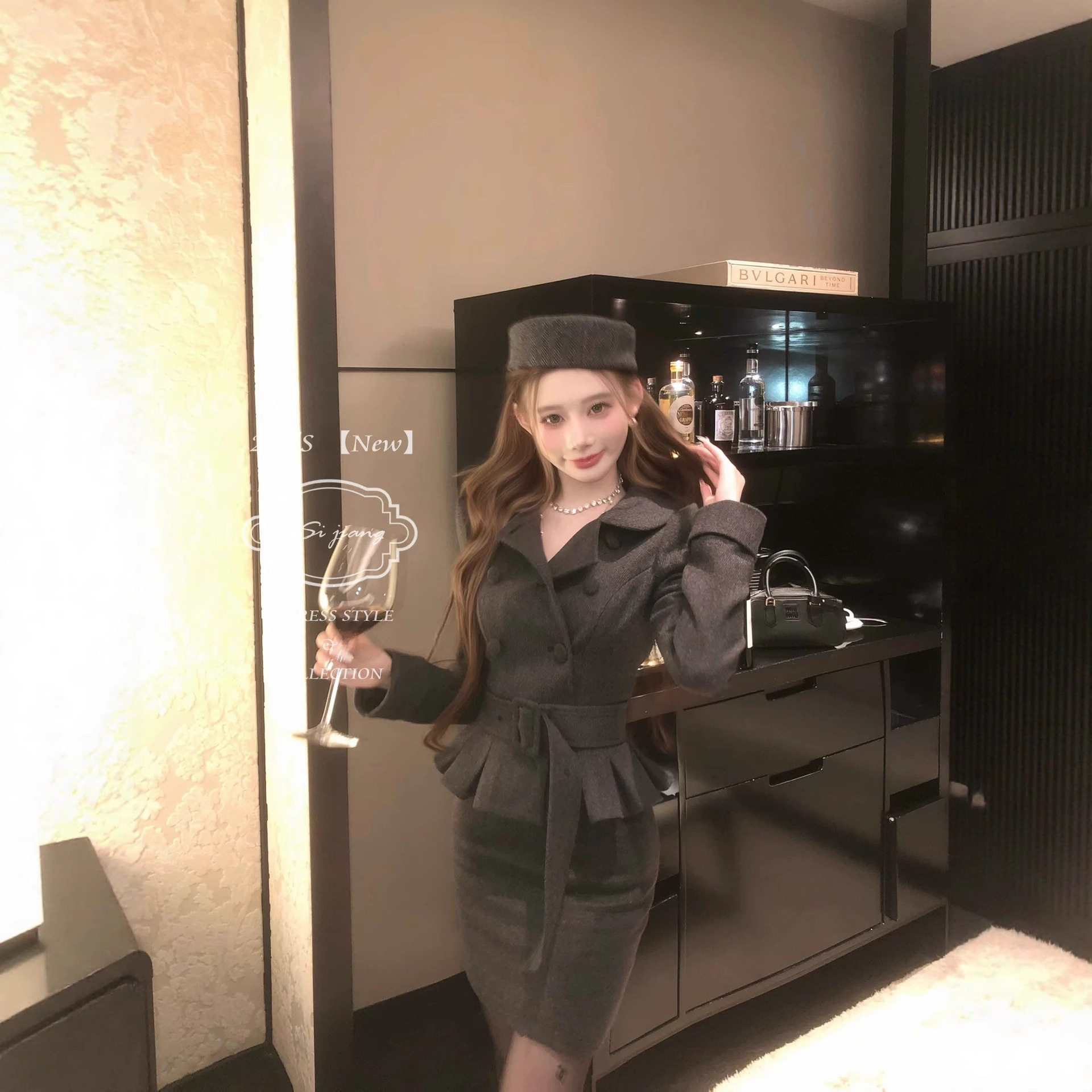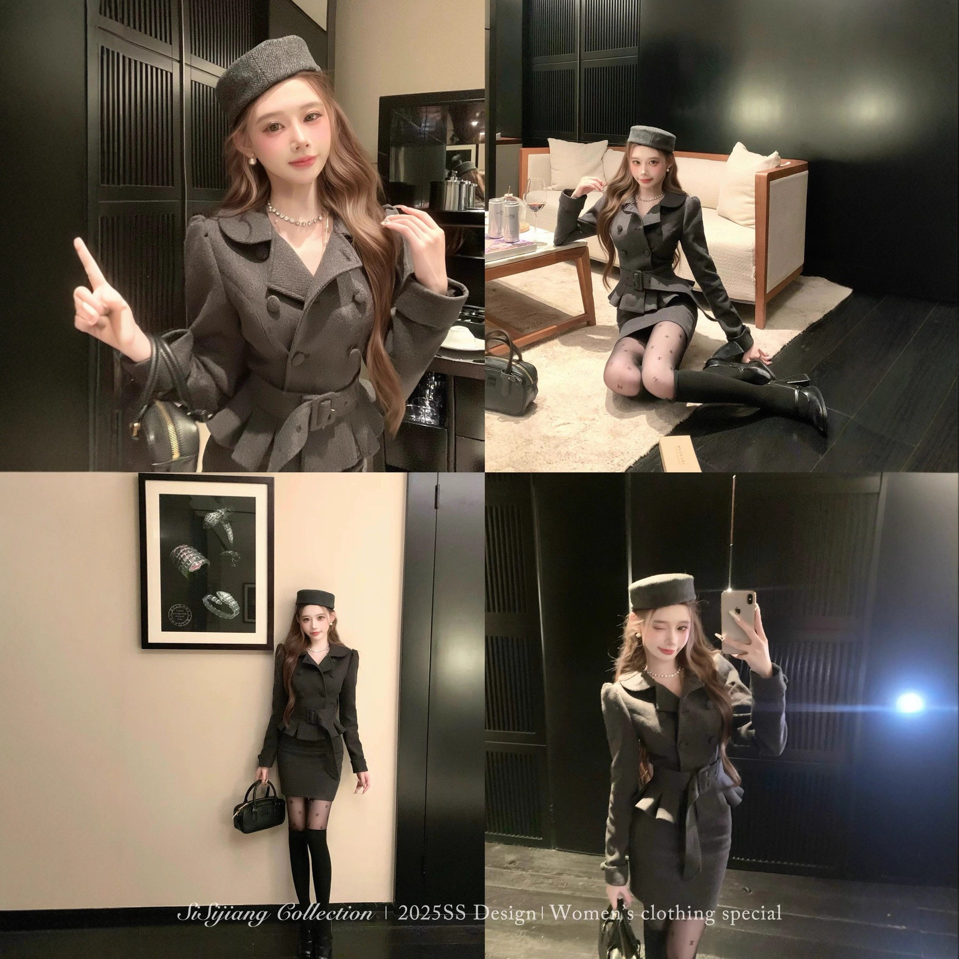 Free Belt, Small Fragrant Lapel, Double-Breasted Waist-Cinching Thickeneded Woolen Jacket + Hip-Covering Short Skirt Two-Piece Set for Women in Autumn and Winter