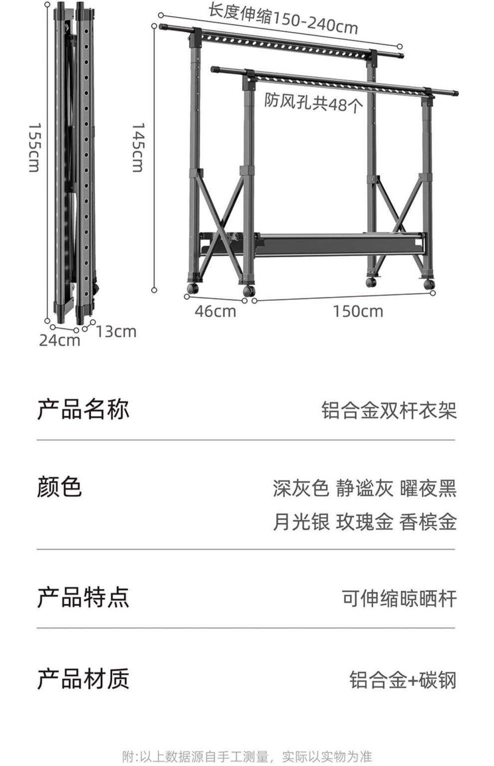 | Color | Dark gray [drying net model] 1.3- 2.3m telescopic-fixed height 1.4m (high cost-effectiveness) yunda delivery-free wheels,Dark gray - extremely thick aviation aluminum alloy [length 1.2- 2.1m * fixed height 1.2m ] free 6 universal wheel hangers [sf express free shipping] lifetime warranty,Quiet gray - huge thick aviation aluminum alloy [length 1.2- 2.1m *fixed height 1.2m ] free 6 universal wheel hangers [sf express free shipping] lifetime warranty,Dark gray - extremely thick aviation aluminum alloy [length 1.3- 2.2m * fixed height 1.3m ] free 6 universal wheel hangers [sf express free shipping] lifetime warranty,Quiet gray - huge thick aviation aluminum alloy [length 1.3- 2.2m *fixed height 1.3m ] free 6 universal wheel hangers [sf express free shipping] lifetime warranty,Dark gray - extremely thick aviation aluminum alloy [length 1.5- 2.4m * fixed height 1.5m ] free 6 universal wheel hangers [sf express free shipping] lifetime warranty,Quiet gray - huge thick aviation aluminum alloy [length 1.5- 2.4m *fixed height 1.5m ] free 6 universal wheel hangers [sf express free shipping] lifetime warranty,Dark gray [drying net model] 1.5- 2.5m telescopic-fixed height 1.5m (high cost performance) shipped by yunda-free wheels,Dark gray [drying net model] 1.3- 2.3m telescopic-double row 3-speed lift (high cost-effectiveness) yunda delivery-free wheels,Champagne gold [drying net model] 1.3- 2.3m telescopic-double row 3-speed lift (high cost performance) shipped by yunda - free wheels,Cream white [drying net model] 1.3- 2.3m telescopic-double row 3-speed lift (high cost performance) shipped by yunda - free wheels,Dark gray [drying net model] 1.5- 2.5m telescopic - double row 3-speed lift (high cost-effectiveness) shipped by yunda - free wheels,Champagne gold [drying net model] 1.5- 2.5m telescopic-double row 3-speed lift (high cost performance) shipped by yunda - free wheels,Cream white [drying net model] 1.5- 2.5m telescopic-double row 3-speed lift (high cost performance) shipped by yunda - free wheels,Quiet gray thick aviation aluminum alloy [length 1.3- 2.2m * height single side four-speed lifting] free 6 universal wheel hangers [sf express free shipping] lifetime warranty will not break,Yaoye black thick aviation aluminum alloy [length 1.3- 2.2m * height single side four-speed lifting] free 6 universal wheel hangers [sf express free shipping] lifetime warranty will not break,Quiet gray thick aviation aluminum alloy [length 1.2- 2.1m *high double-sided four-speed lifting] free 6 universal wheel hangers [sf express free shipping] lifetime warranty will not break,Yaoye black thick aviation aluminum alloy [length 1.2- 2.1m * height double-sided four-speed lifting] free 6 universal wheel hangers [sf express free shipping] lifetime warranty will not break,Dark gray thick aviation aluminum alloy [length 1.2- 2.1m * height double-sided four-speed lifting] free 6 universal wheel hangers [sf express free shipping] lifetime warranty will not break,Moonlight silver thick aviation aluminum alloy [length 1.2- 2.1m *high double side four-speed lift] free 6 universal wheel hangers [sf express free shipping] lifetime warranty will not break,Rose gold thick aviation aluminum alloy [length 1.2- 2.1m *high double-sided four-speed lifting] free 6 universal wheel hangers [sf express free shipping] lifetime warranty will not break,Bmw jinju thick aviation aluminum alloy [length 1.2- 2.1m *high double-sided four-speed lifting] free 6 universal wheel hangers [sf express free shipping] lifetime warranty will not break,Quiet gray thick aviation aluminum alloy [length 1.3- 2.2m * height double-sided four-speed lifting] free 6 universal wheel hangers [sf express free shipping] lifetime warranty will not break,Yaoye black thick aviation aluminum alloy [length 1.3- 2.2m * high double-sided four-speed lifting] free 6 universal wheel hangers [sf express free shipping] lifetime warranty will not break,Dark gray thick aviation aluminum alloy [length 1.3- 2.2m * height double-sided four-speed lifting] free 6 universal wheel hangers [sf express free shipping] lifetime warranty will not break,Moonlight silver thick aviation aluminum alloy [length 1.3- 2.2m *high double side four-speed lift] free 6 universal wheel hangers [sf express free shipping] lifetime warranty will not break,Rose gold thick aviation aluminum alloy [length 1.3- 2.2m *high double-sided four-speed lifting] free 6 universal wheel hangers [sf express free shipping] lifetime warranty will not break,Quiet gray thick aviation aluminum alloy [length 1.5- 2.4m * height double-sided four-speed lifting] free 6 universal wheel hangers [sf express free shipping] lifetime warranty will not break,Yaoye black thick aviation aluminum alloy [length 1.5- 2.4m *high double-sided four-speed lifting] comes with 6 universal wheel hangers [sf express free shipping] lifetime warranty will not break,Dark gray thick aviation aluminum alloy [length 1.5- 2.4m * height double-sided four-speed lifting] free 6 universal wheel hangers [sf express free shipping] lifetime warranty will not break,Moonlight silver thick aviation aluminum alloy [length 1.5- 2.4m * height double side four-speed lift] free 6 universal wheel hangers [sf express free shipping] lifetime warranty will not break,Bmw jinjutou aviation aluminum alloy [length 1.5- 2.4m *high double-sided four-speed lifting] free 6 universal wheel hangers [sf express free shipping] lifetime warranty will not break,Rose gold thick aviation aluminum alloy - [length 1.5- 2.4m * high double-sided four-speed lift] free 6 universal wheel hangers [sf express free shipping] lifetime warranty,Gun gray three-pole small size, huge thick aviation aluminum alloy [no installation required + 1.2- 2.1m retractable + widened shoe rack] comes with 6 universal wheel hangers [sf bag,Bmw gold three-pole model small size huge thick aviation aluminum alloy [no installation + 1.2- 2.1m retractable + widened shoe rack] free 6 universal wheel hangers [sf bag,Gu