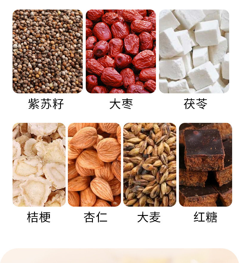 | Raw materials and ingredients | Licorice, dried ginger, tangerine peel, jujube, poria cocos, platycodon, almond, barley, perilla seeds, brown sugar |
