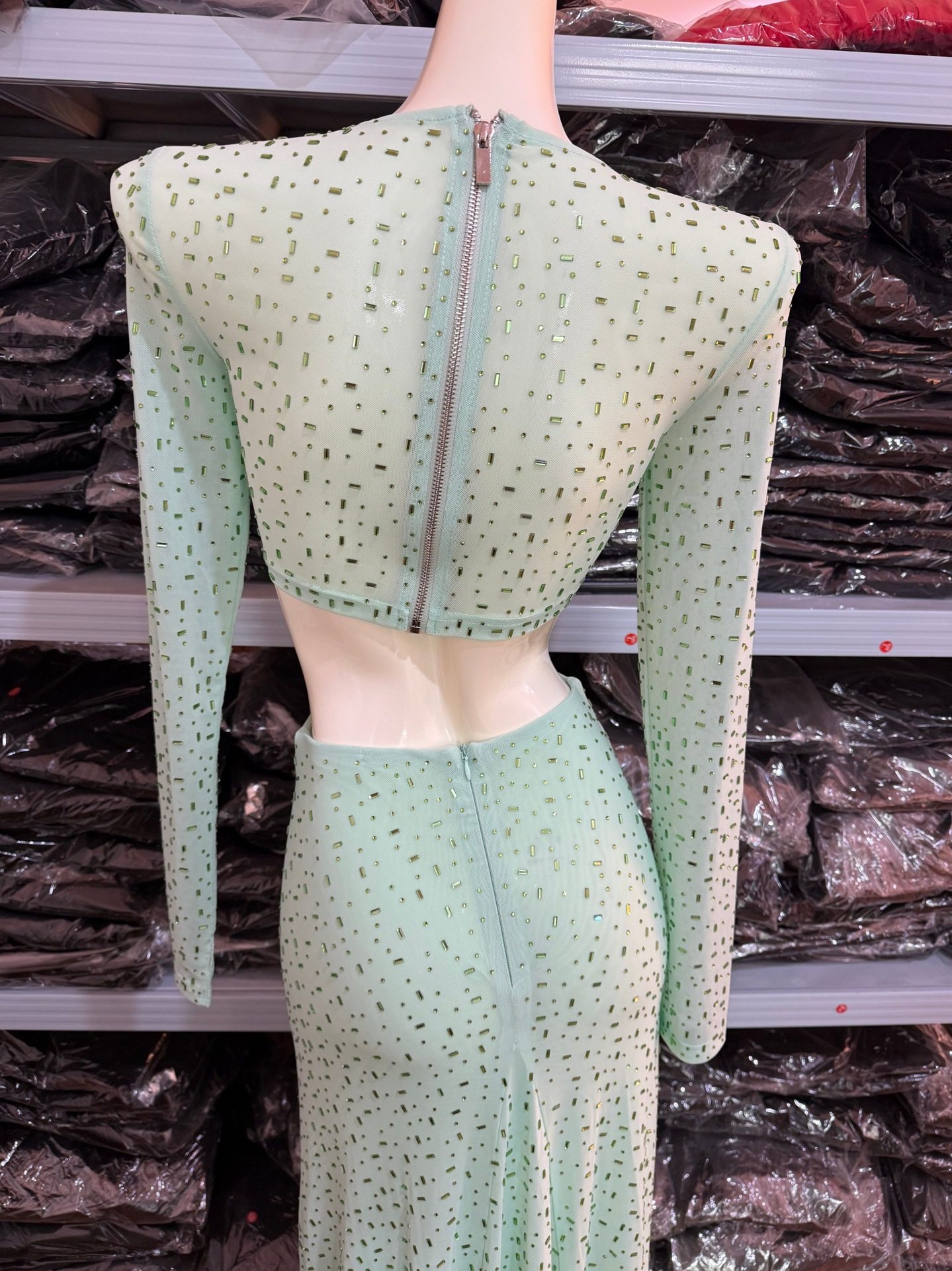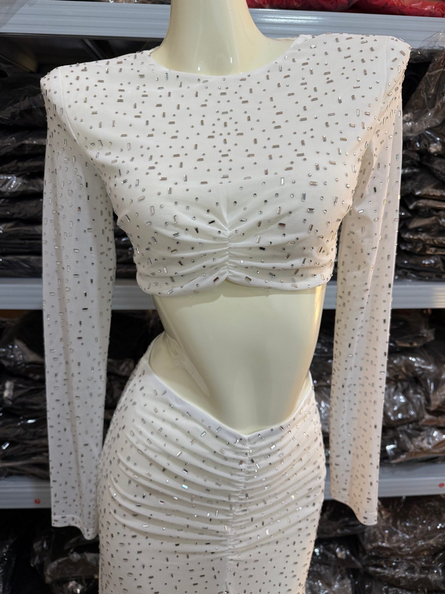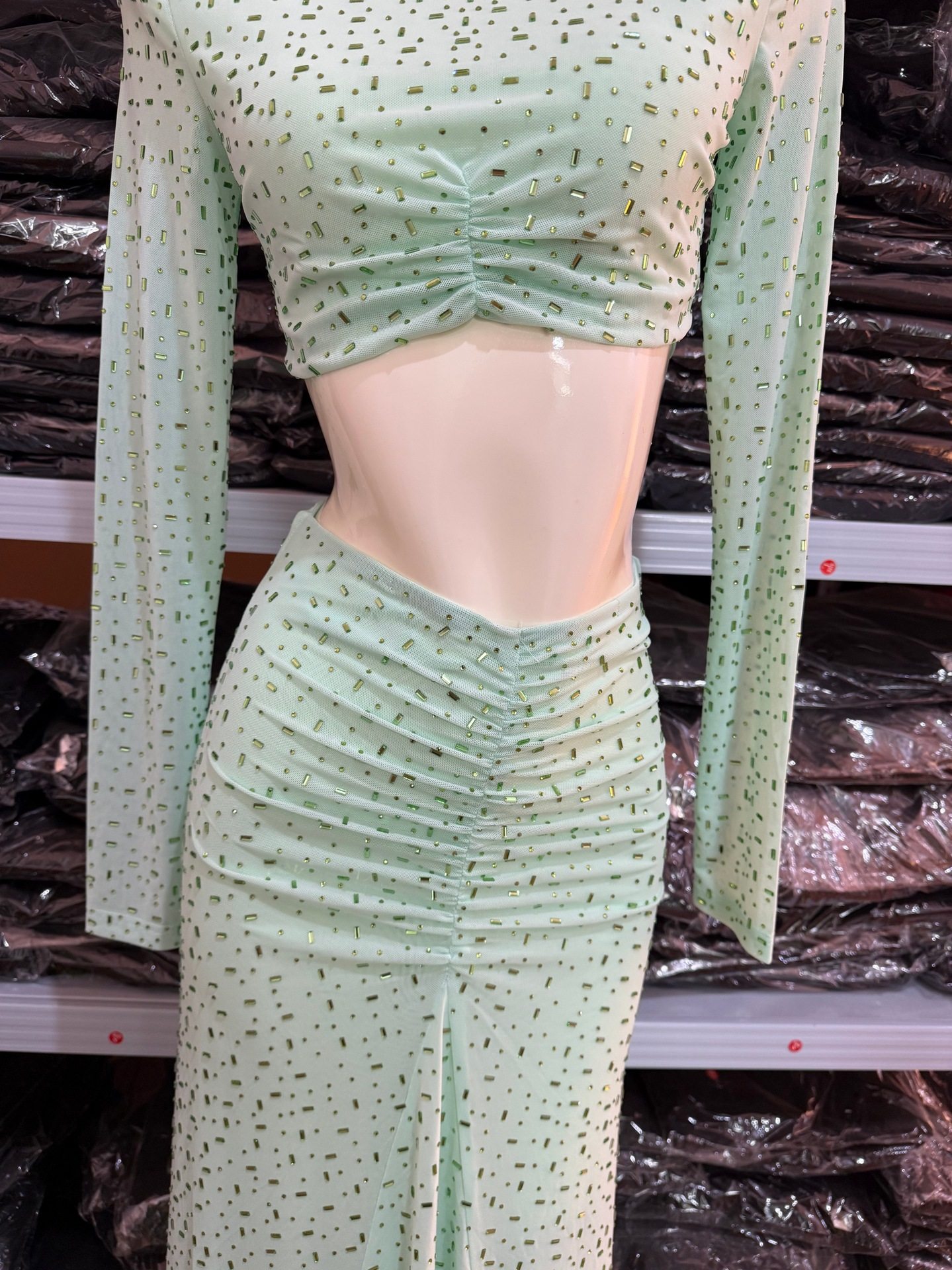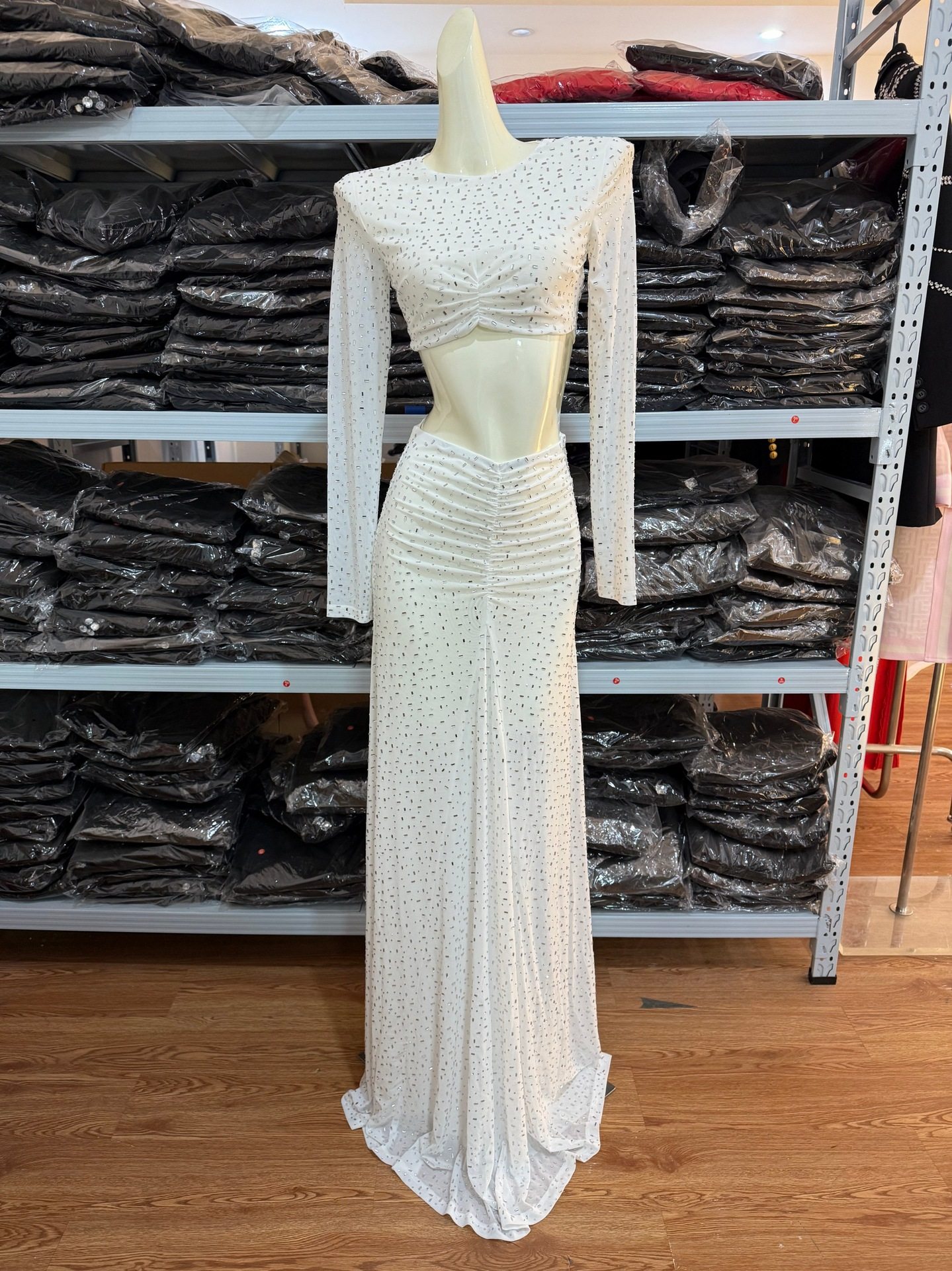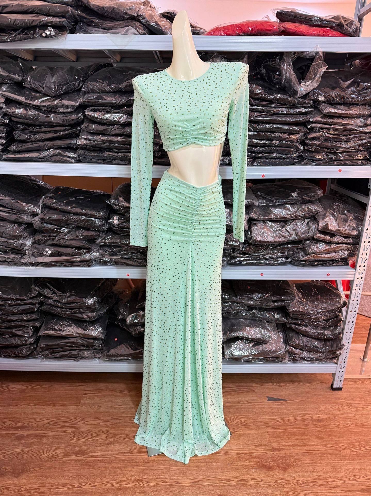 High-End Foreign Trade Women's Sparkling Hot Diamond Green Suit High-Waisted Slim Sexy Long Skirt Two-Piece White Suit Dress