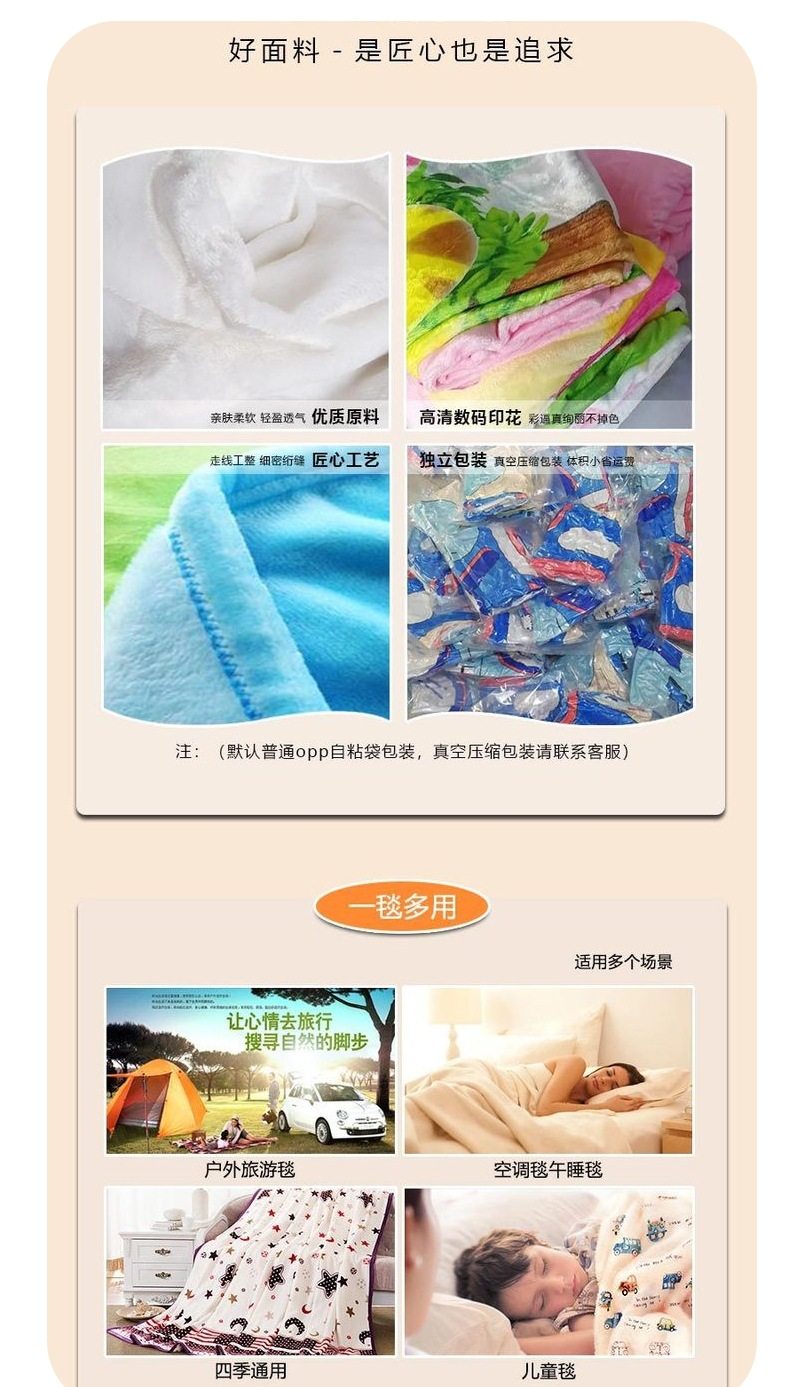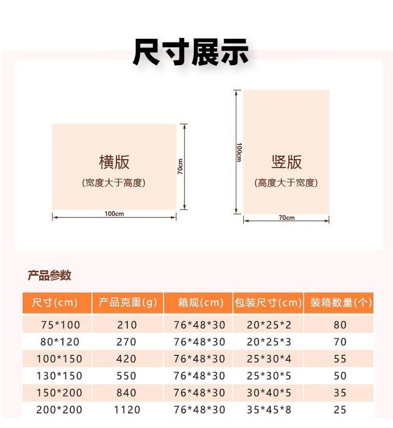 Size specifications 75cm*100cm 210g,80cm*120cm 270g,100cm*150cm 420g,130cm*150cm 550g,150cm*200cm 840g,200cm*200cm 1120g