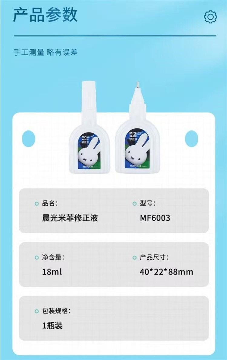 | Specifications | Mf6003 correction solution-18ml,Mf6003 correction liquid 18ml-1 box (12 pieces) |