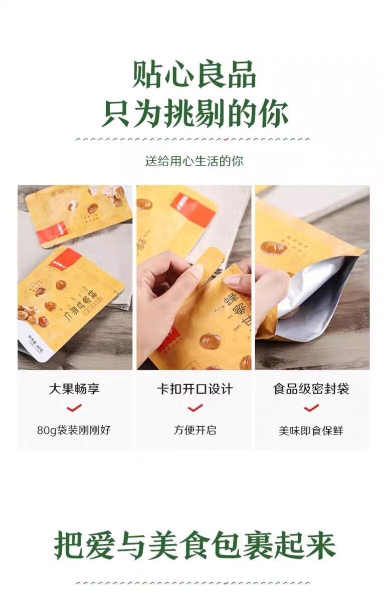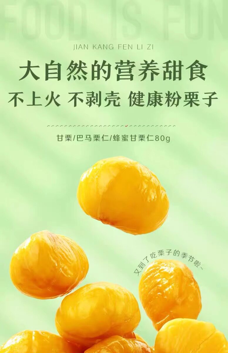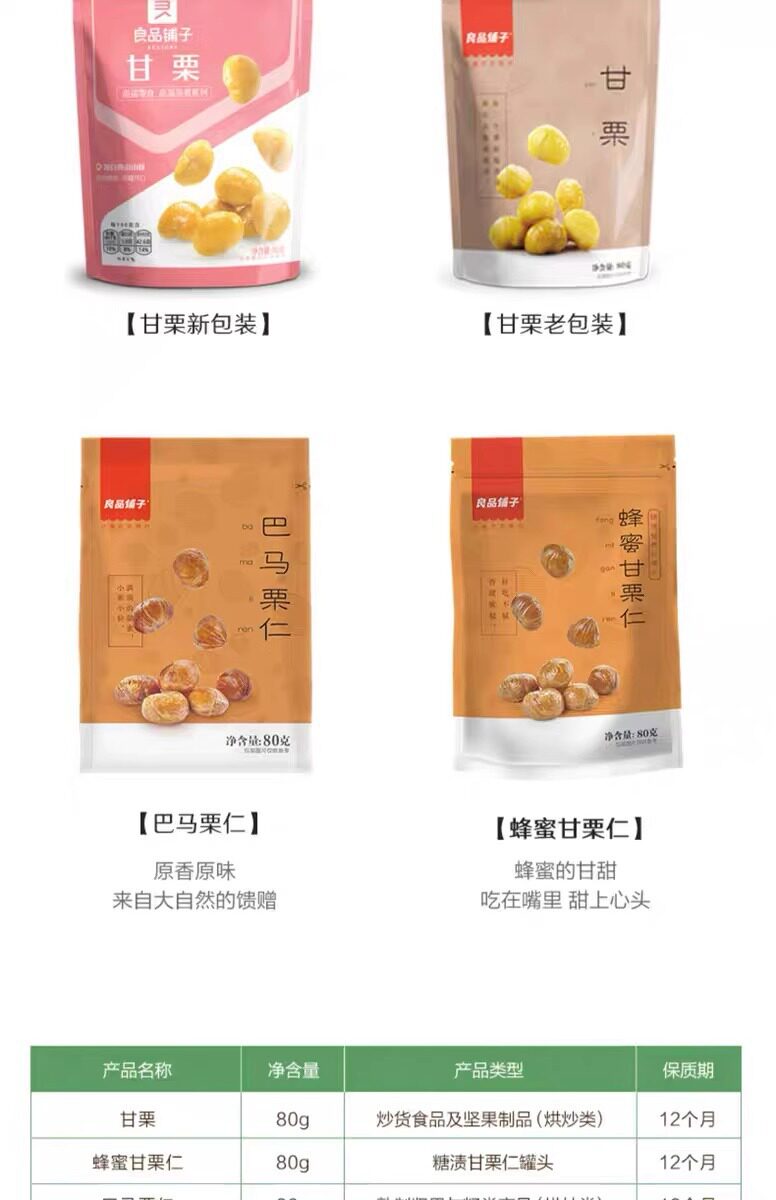 | Packaging specifications | Sweet chestnut 80g,Honey sweet chestnut kernel 80g |
