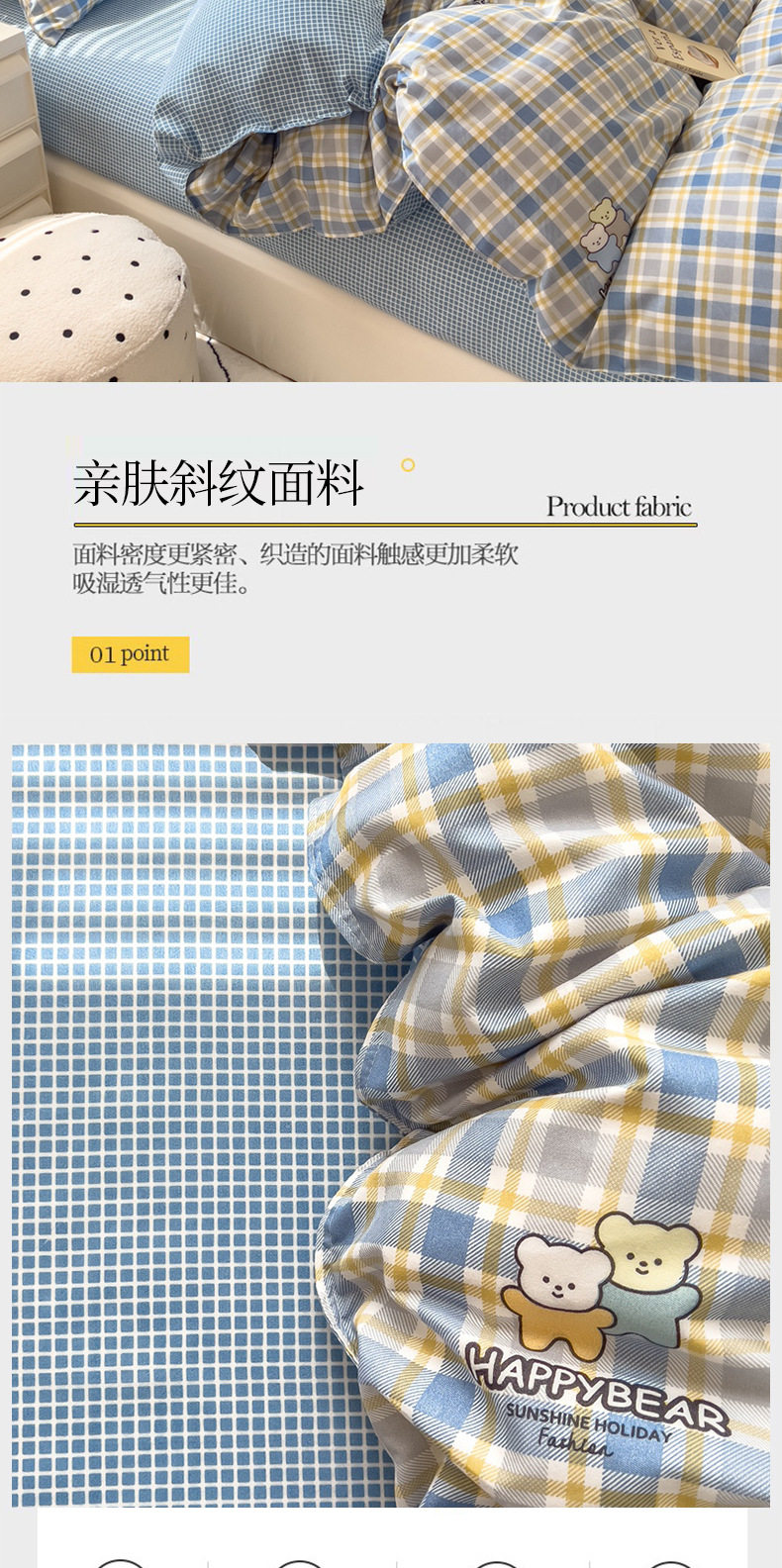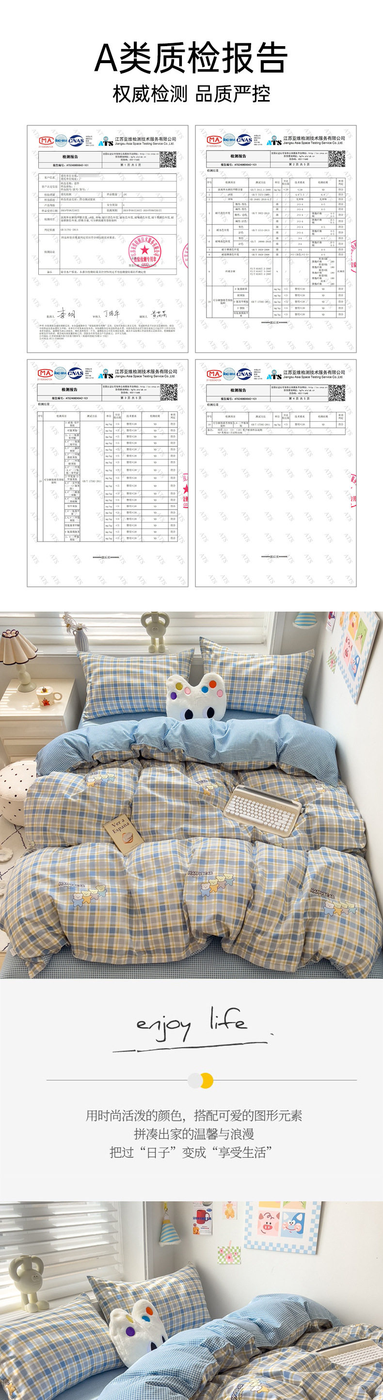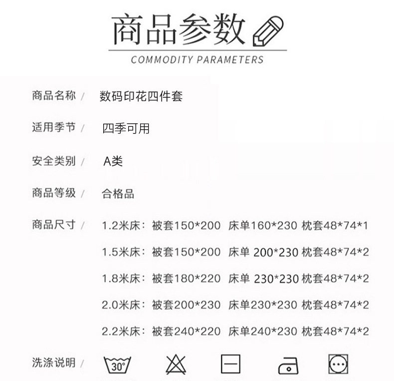 | Size specifications | 150x200cm single quilt cover,180x220cm single quilt cover,200x230cm single quilt cover,1.2m bed sheet three-piece set [quilt cover 150*200cm],1.5m bed sheet four-piece set [quilt cover 150*200cm],1.8m bed sheet four-piece set [quilt cover 180*220cm],2.0m bed sheet four-piece set [quilt cover 200*230cm] |