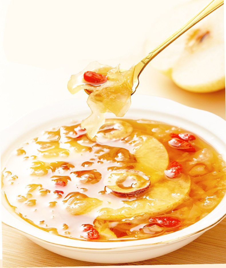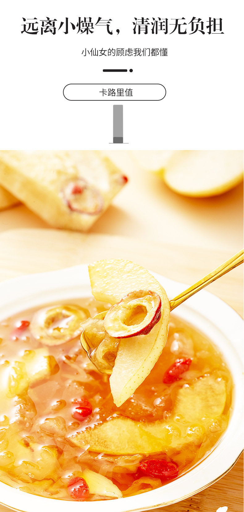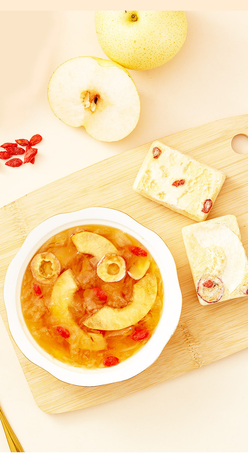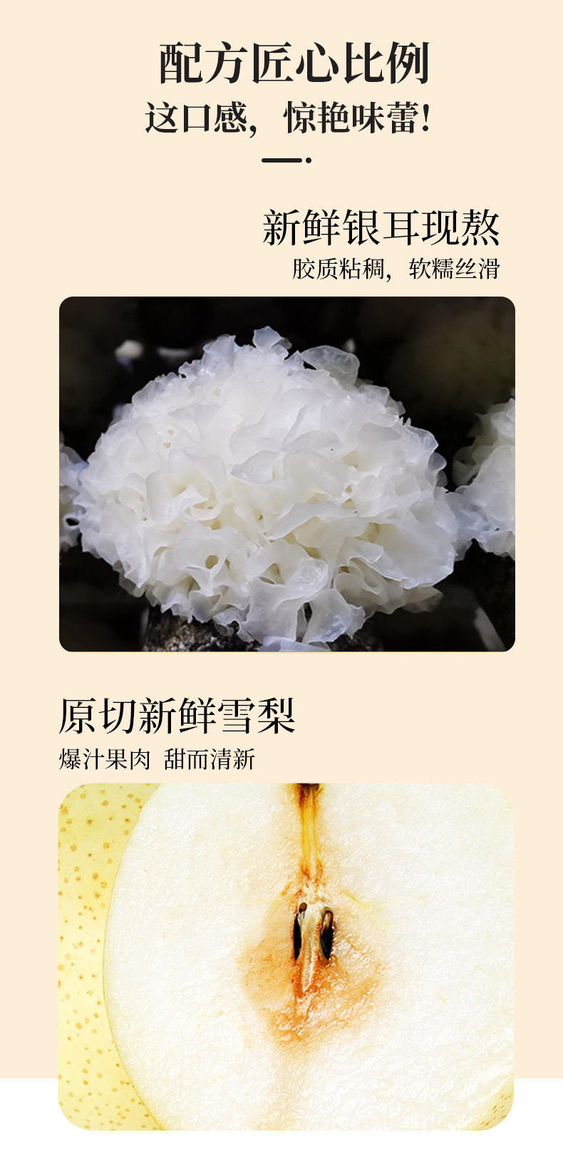 | Raw materials and ingredients | Tremella, pear, fructooligosaccharides, maltodextrin, hawthorn, wolfberry, freeze-dried jasmine tea powder, tangerine peel, polygonatum odoratum, lily |