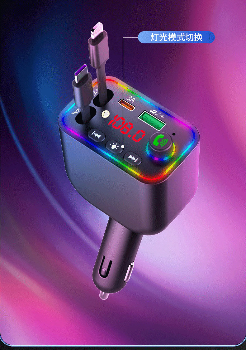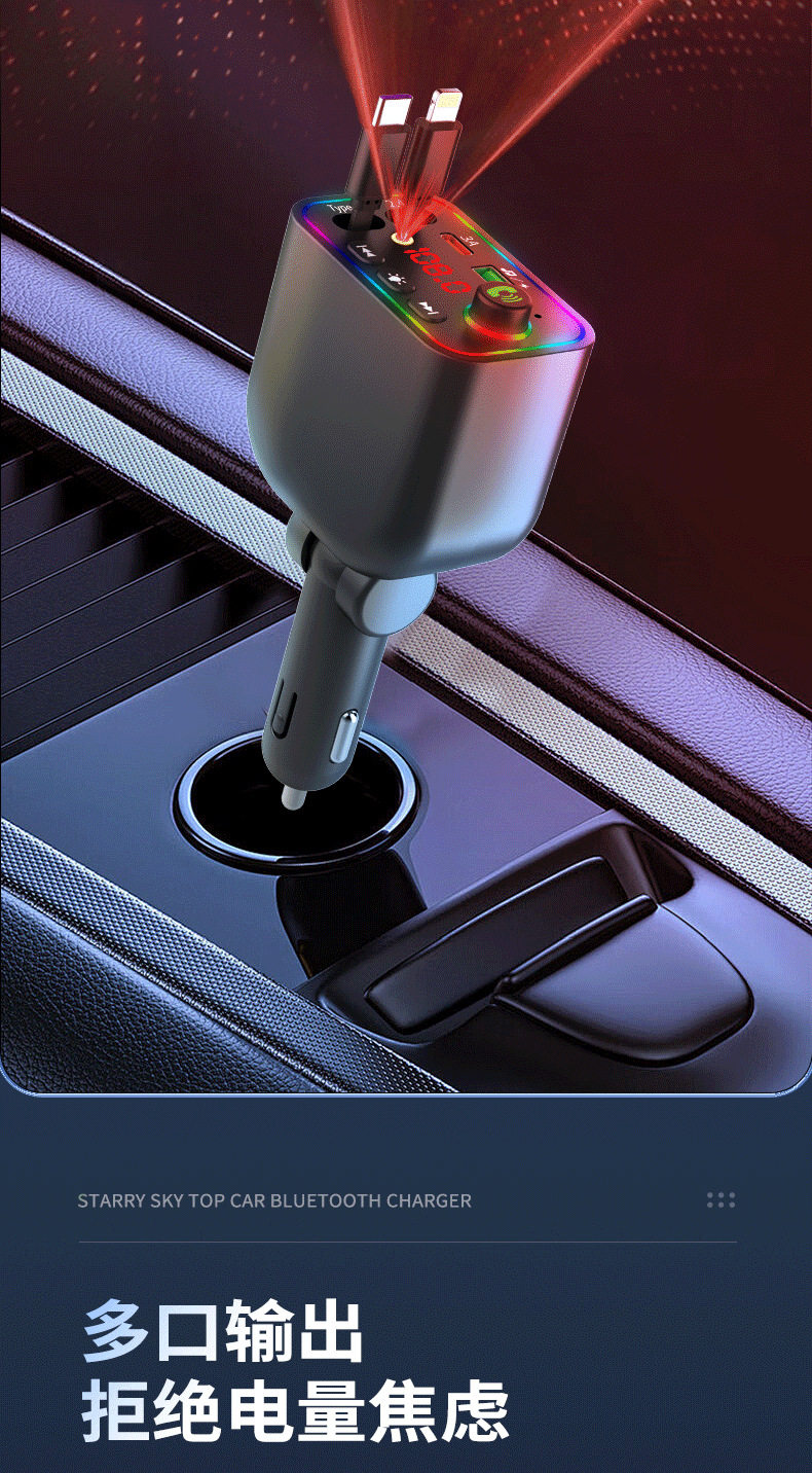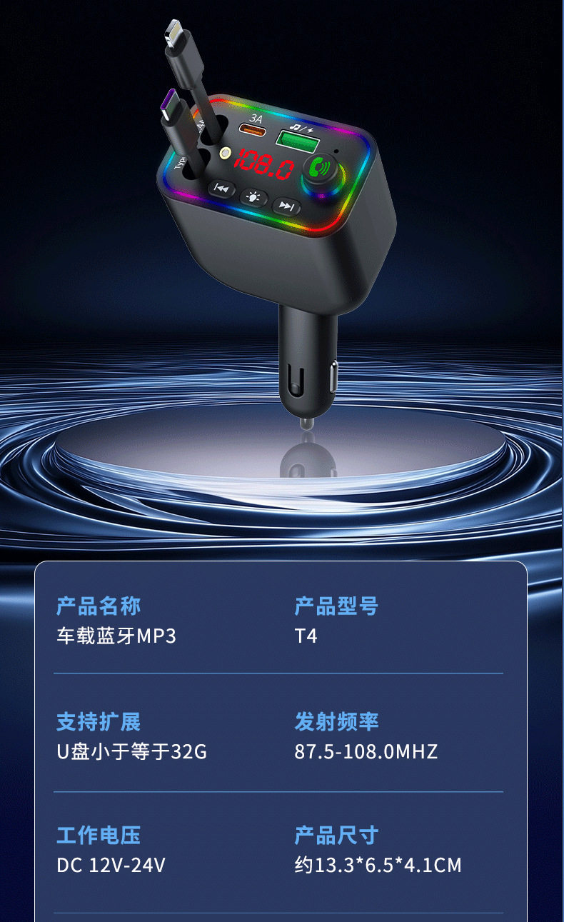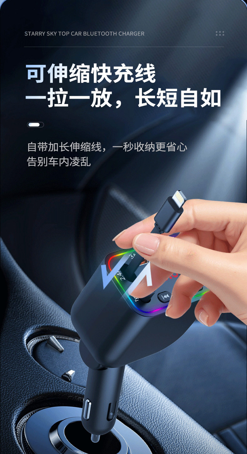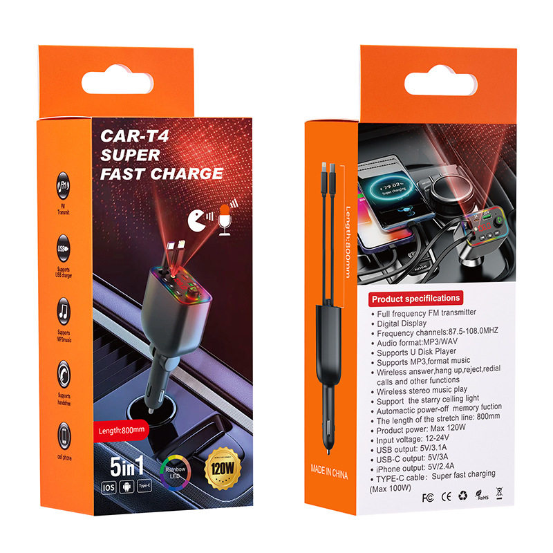 T4 Super Fast Charging Comes with Retractable Cable Car Bluetooth Mp3 Car Charger Retractable One to Four Car Mp3