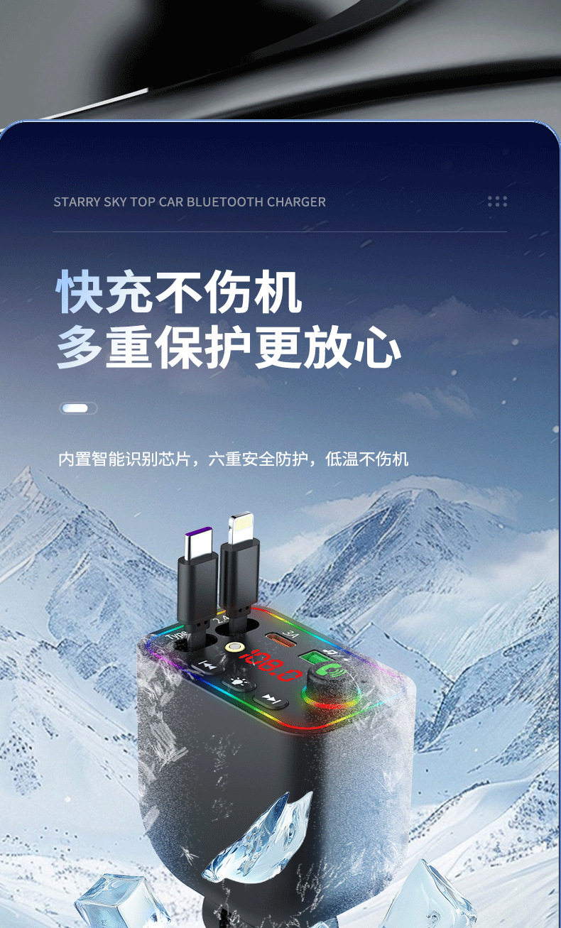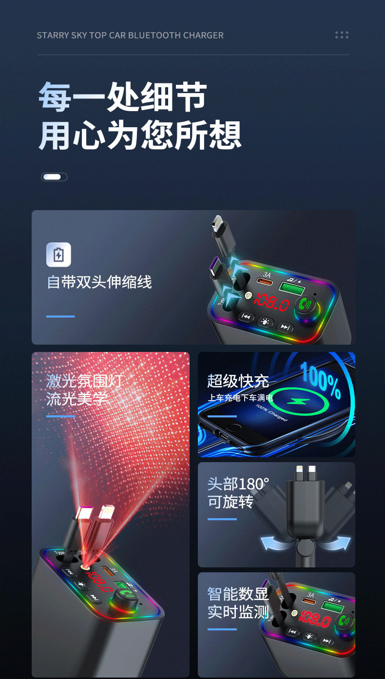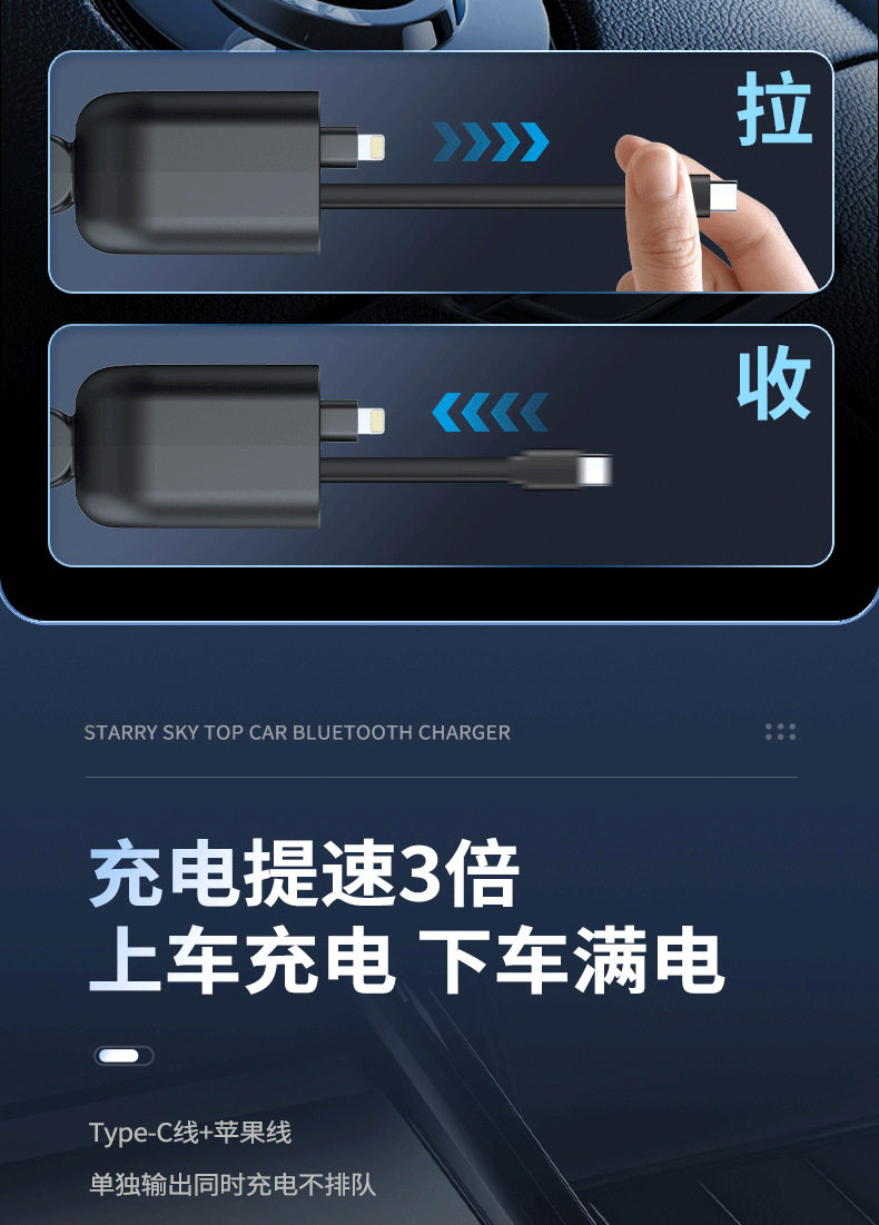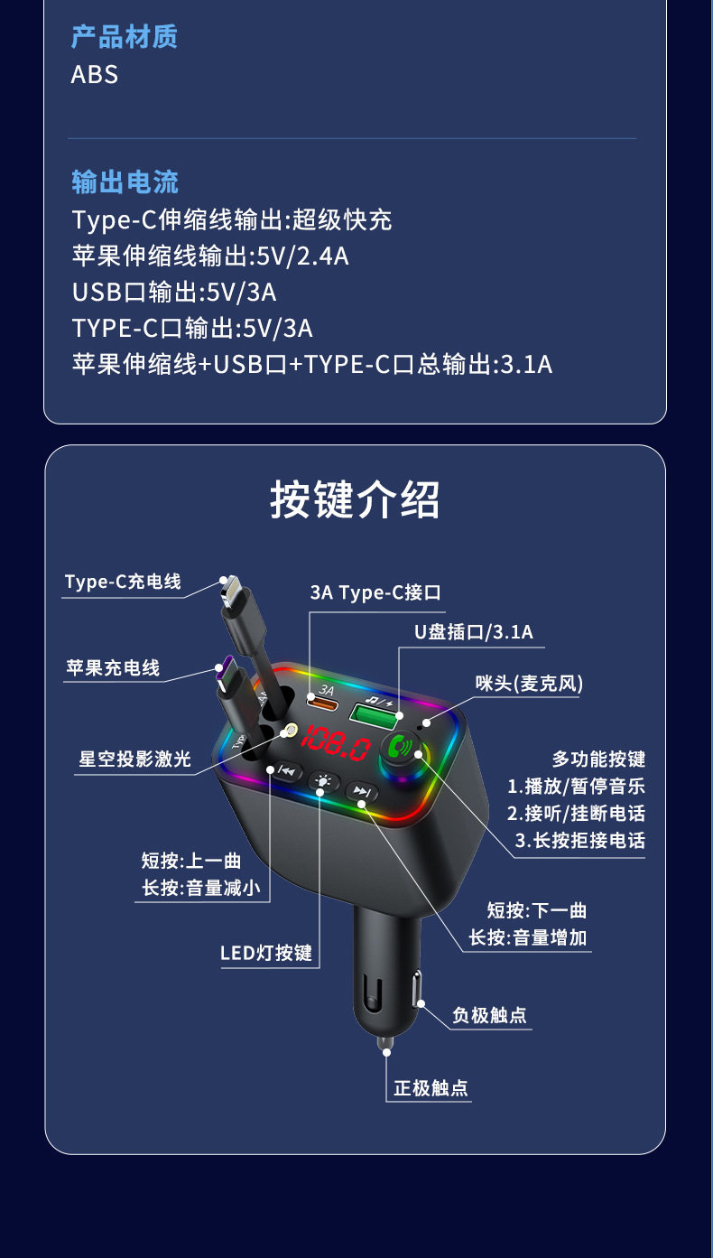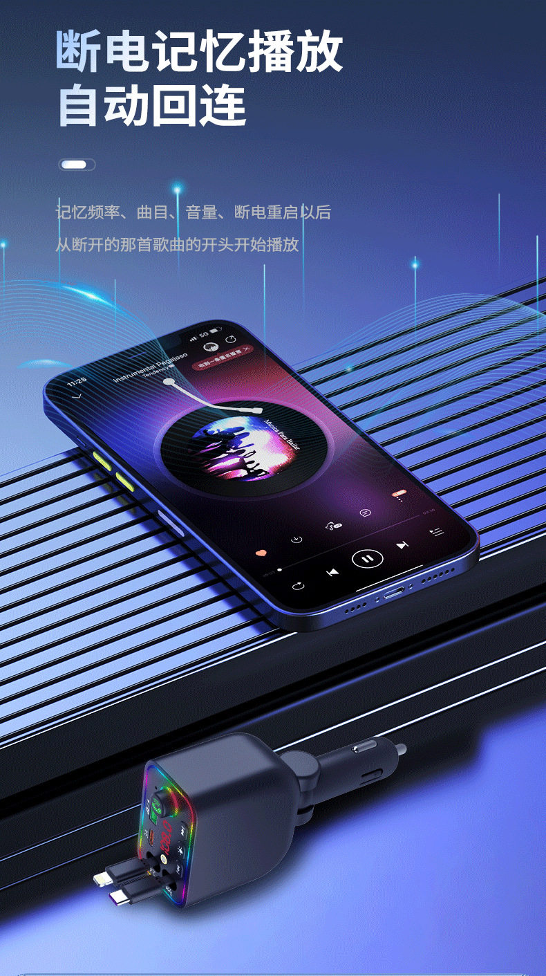 T4 Super Fast Charging Comes with Retractable Cable Car Bluetooth Mp3 Car Charger Retractable One to Four Car Mp3