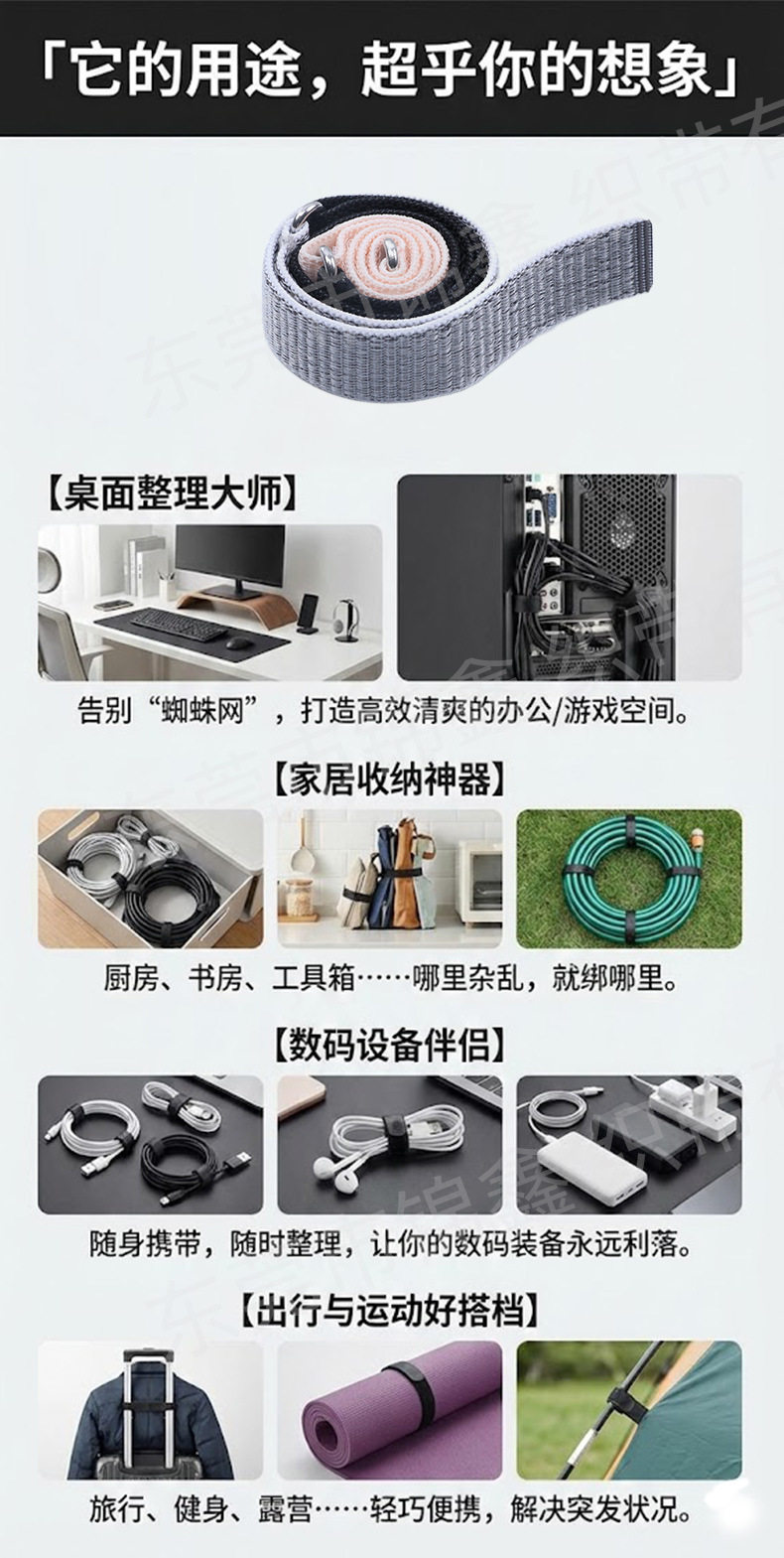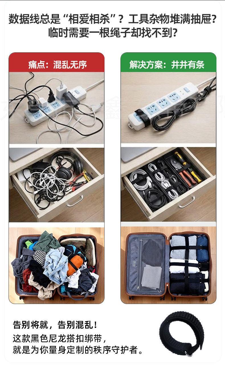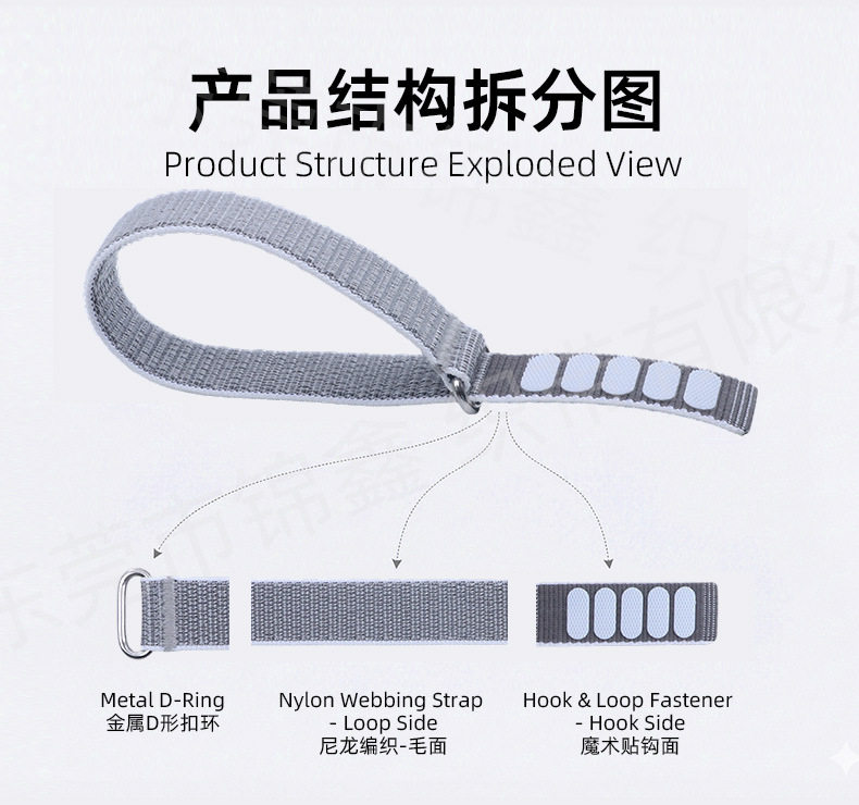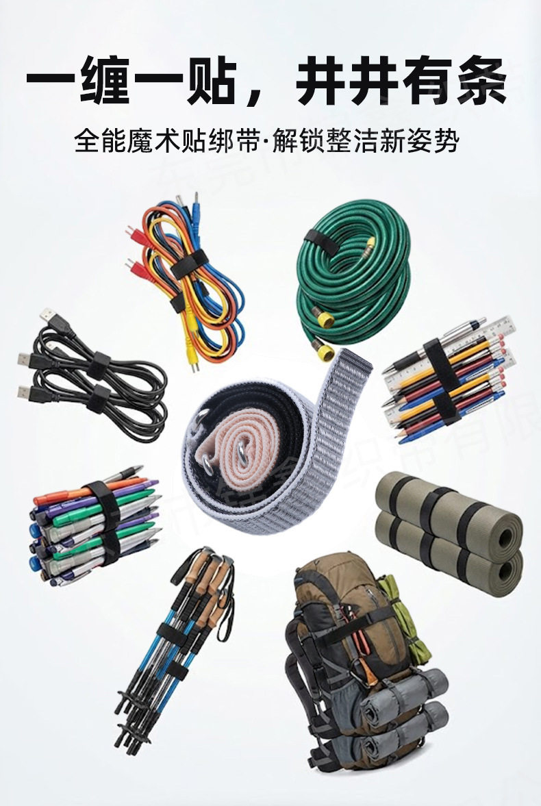 | Scope of application | Protective gear,Backpack,Watch strap,Clothing,Accessories,Home textiles,Straps,Clothing accessories,Cable management tape,Bind,Clean up the wires |