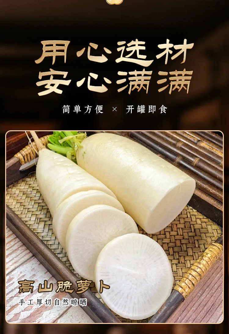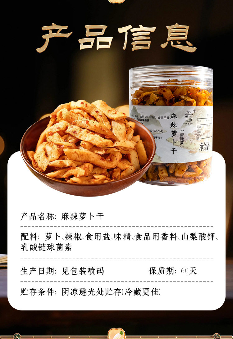| Packaging specifications | Spicy dried radish 250g*1 can,Spicy dried radish 250g*2 cans,Spicy dried radish 250g*3 cans,Spicy dried radish 250g*4 cans,Spicy dried radish 250g*5 cans |