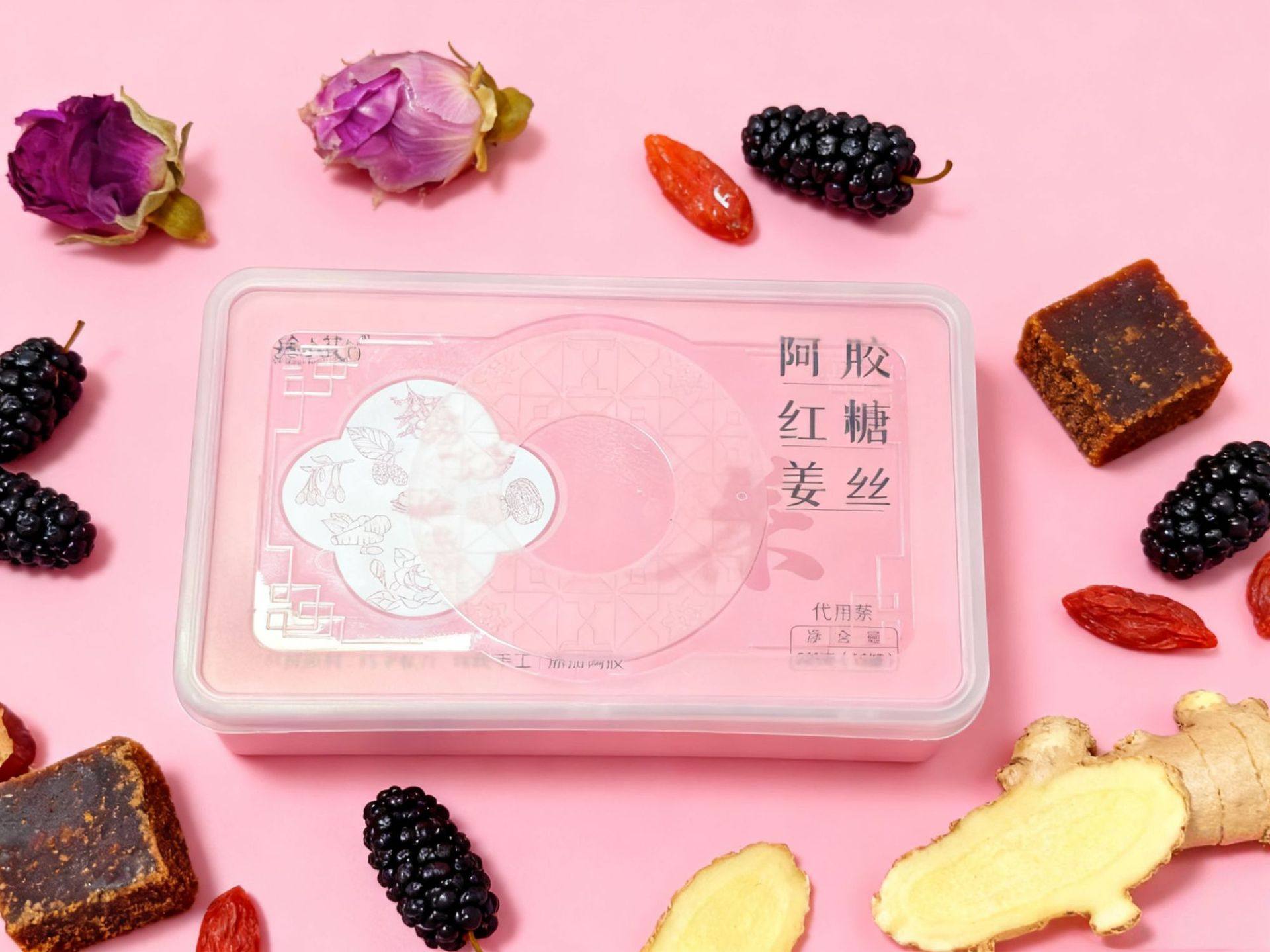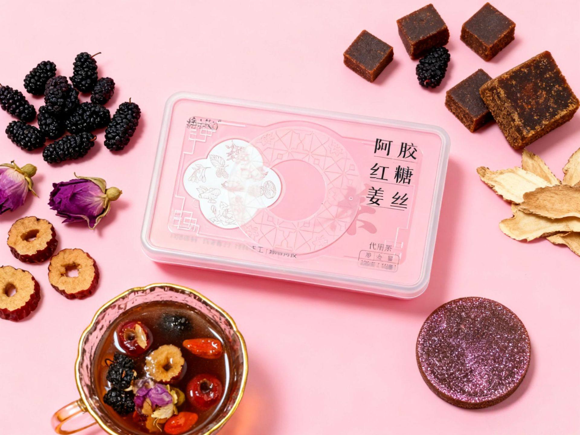 | Raw materials and ingredients | Donkey-hide gelatin, brown sugar cubes, red dates, shredded ginger, longan, wolfberry, mulberry, double red rose |