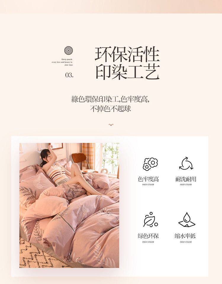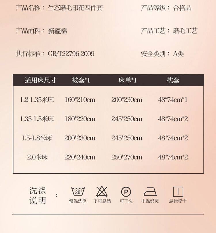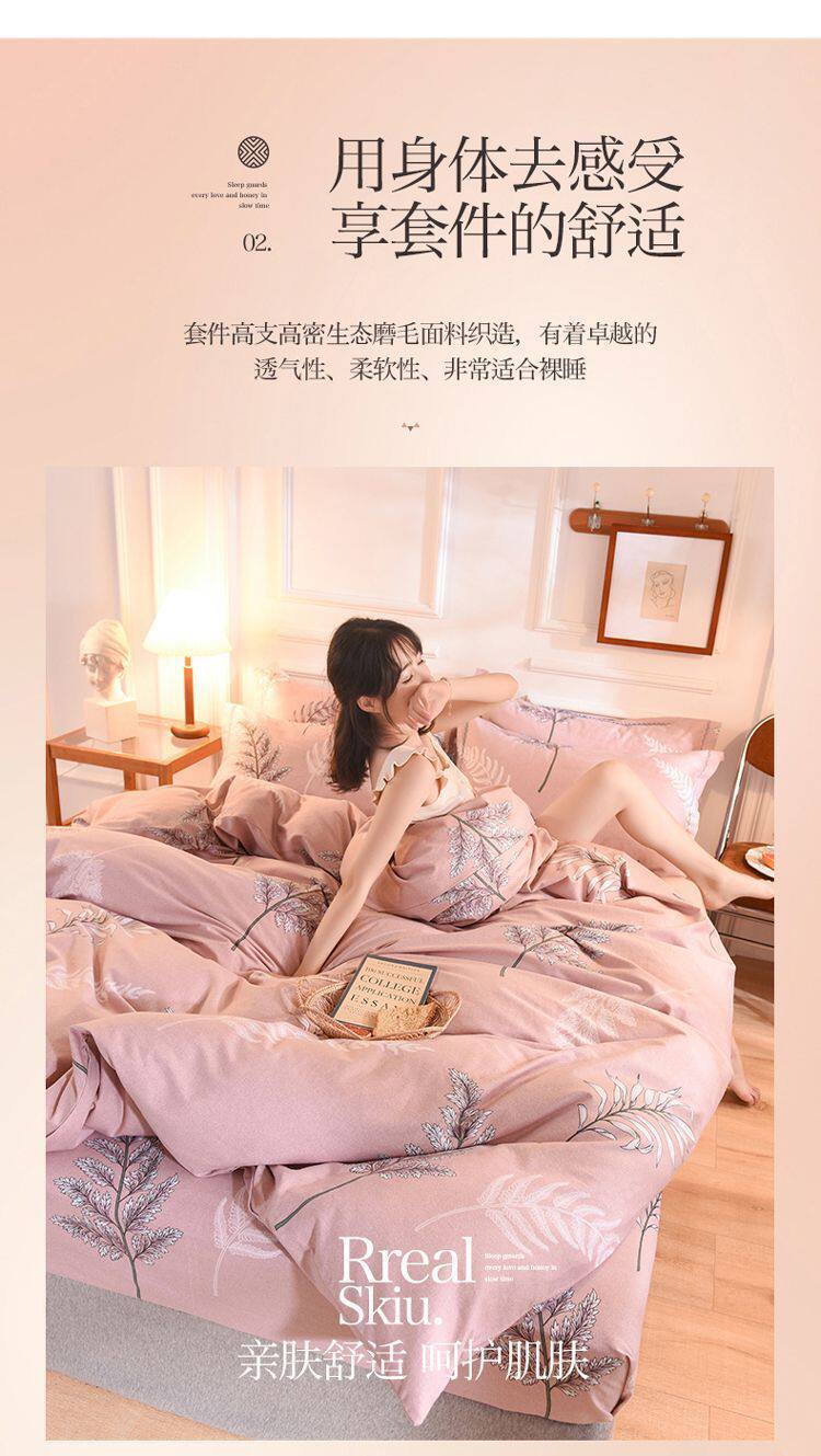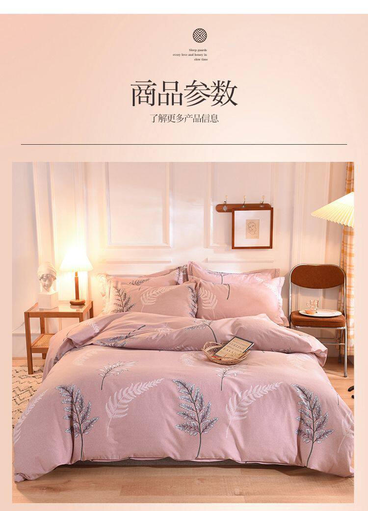 | Size specifications | 1.2 three-piece bed set [quilt cover 150x200],1.5 bed four-piece set [quilt cover 180x220],1.5 bed four-piece set [quilt cover 200x230],1.8 bed four-piece set [quilt cover 200x230],2.0 bed four-piece set [quilt cover 200x230],1.8 bed four-piece set [quilt cover 220x240],2.0 bed four-piece set [quilt cover 220x240],2.2 bed four-piece set [quilt cover 220x240] |