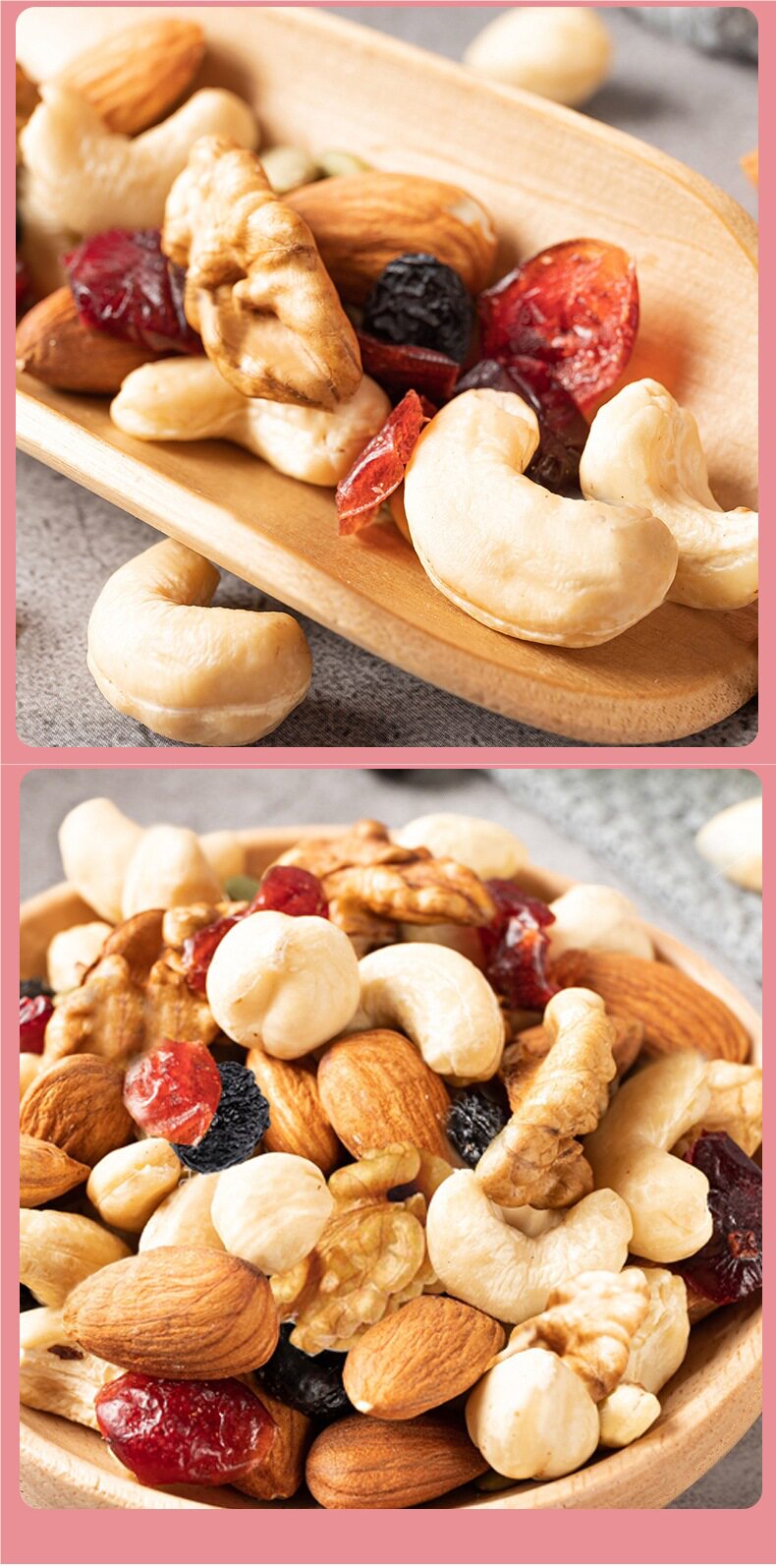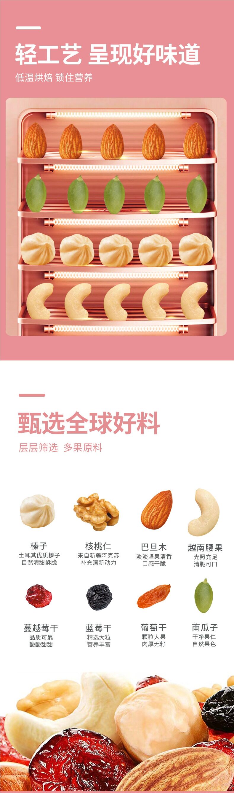 | Raw materials and ingredients | Golden raisins, walnut kernels, cashews, pumpkin seeds, dried cranberries, almonds |